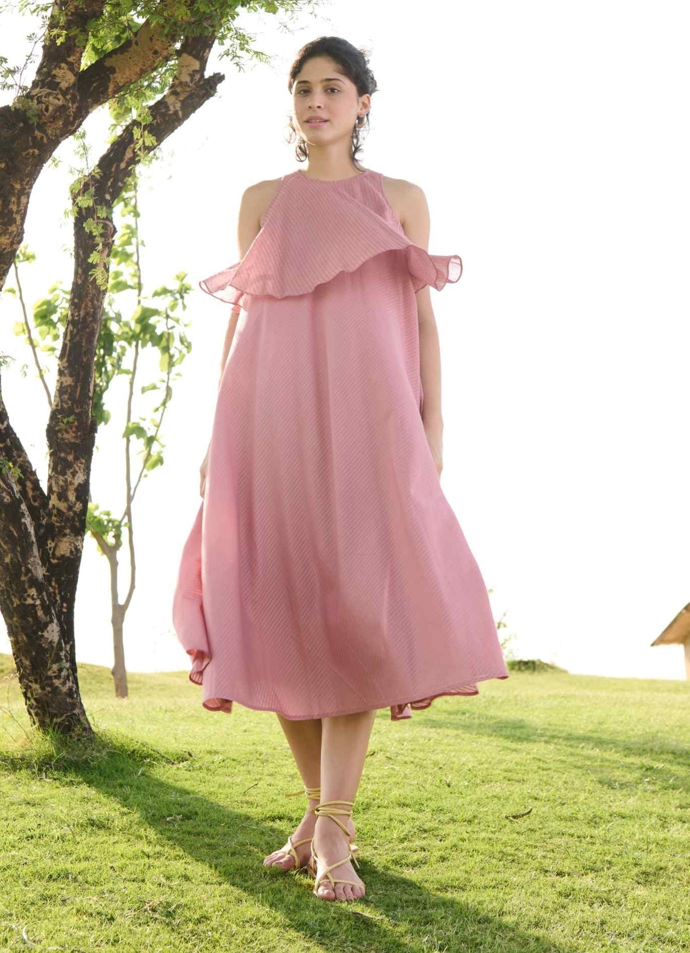 Experience refined style with the Camellia Dress, crafted from our luxurious self-stripe cotton fabric in a soft salmon pink. This dress features a layered panel design that enhances its drape and movement, creating a beautifully fluid silhouette. Ideal for both casual and sophisticated events, the Camellia Dress combines the subtle texture of self-stripe cotton with the elegance of layered detailing for a chic and versatile look.
