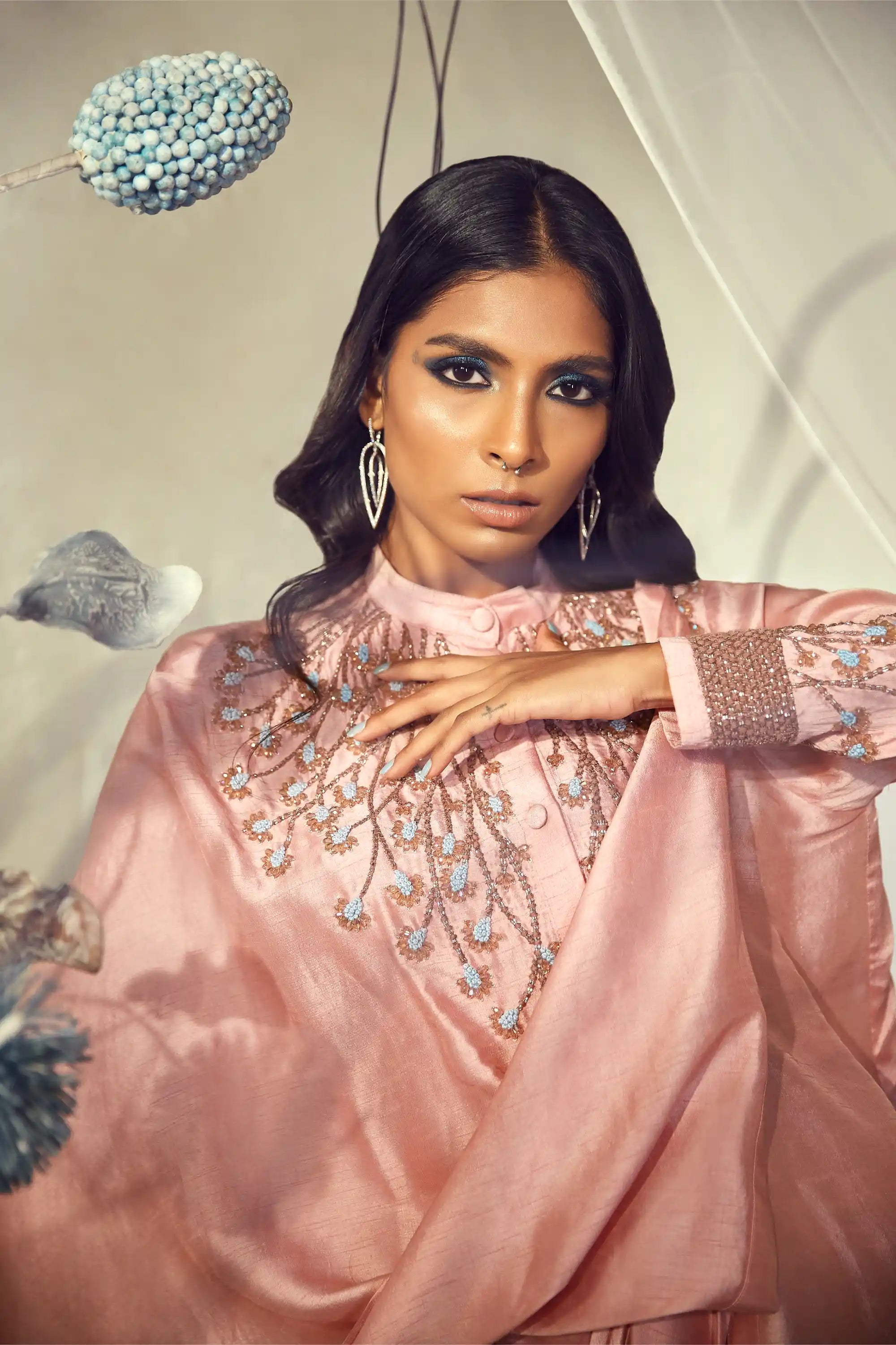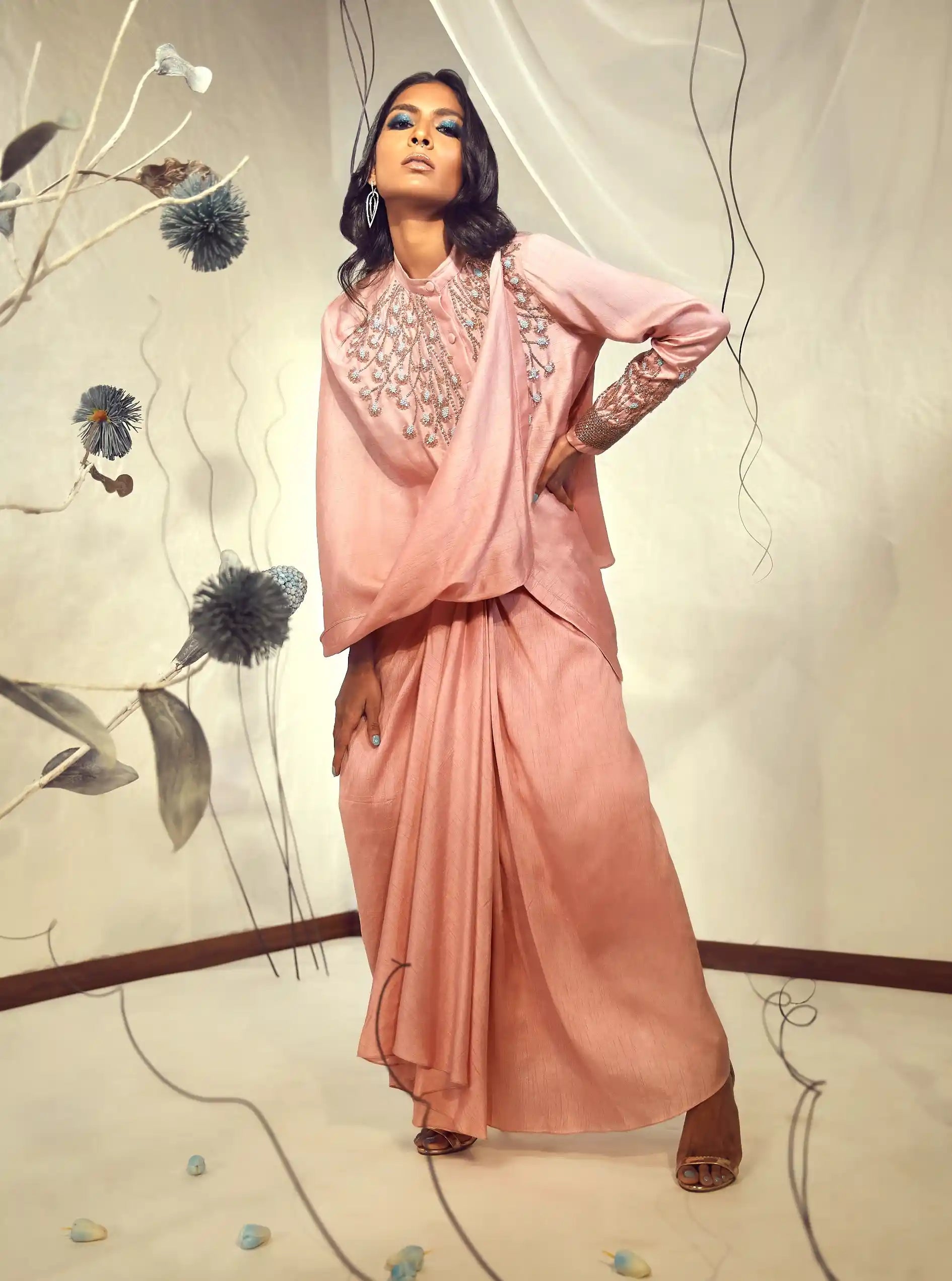 Make a chic statement in this salmon pink co-ord set, featuring a stylish pleated dhoti-style skirt that flows effortlessly with every movement. The drape top, adorned with a sophisticated mandarin collar, is beautifully enhanced by powder blue French knots and shimmering crystal beaded embellishments. This ensemble perfectly balances traditional elegance with contemporary flair, making it an ideal choice for festive occasions or stylish gatherings.