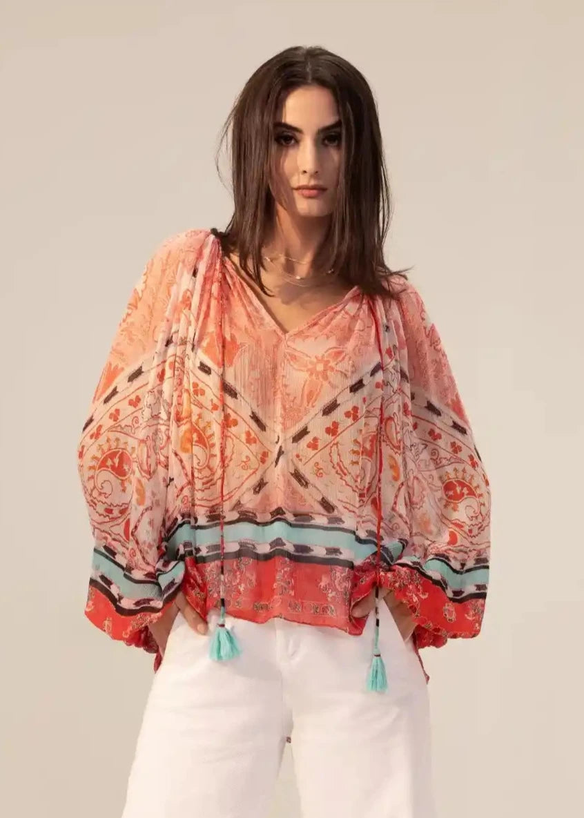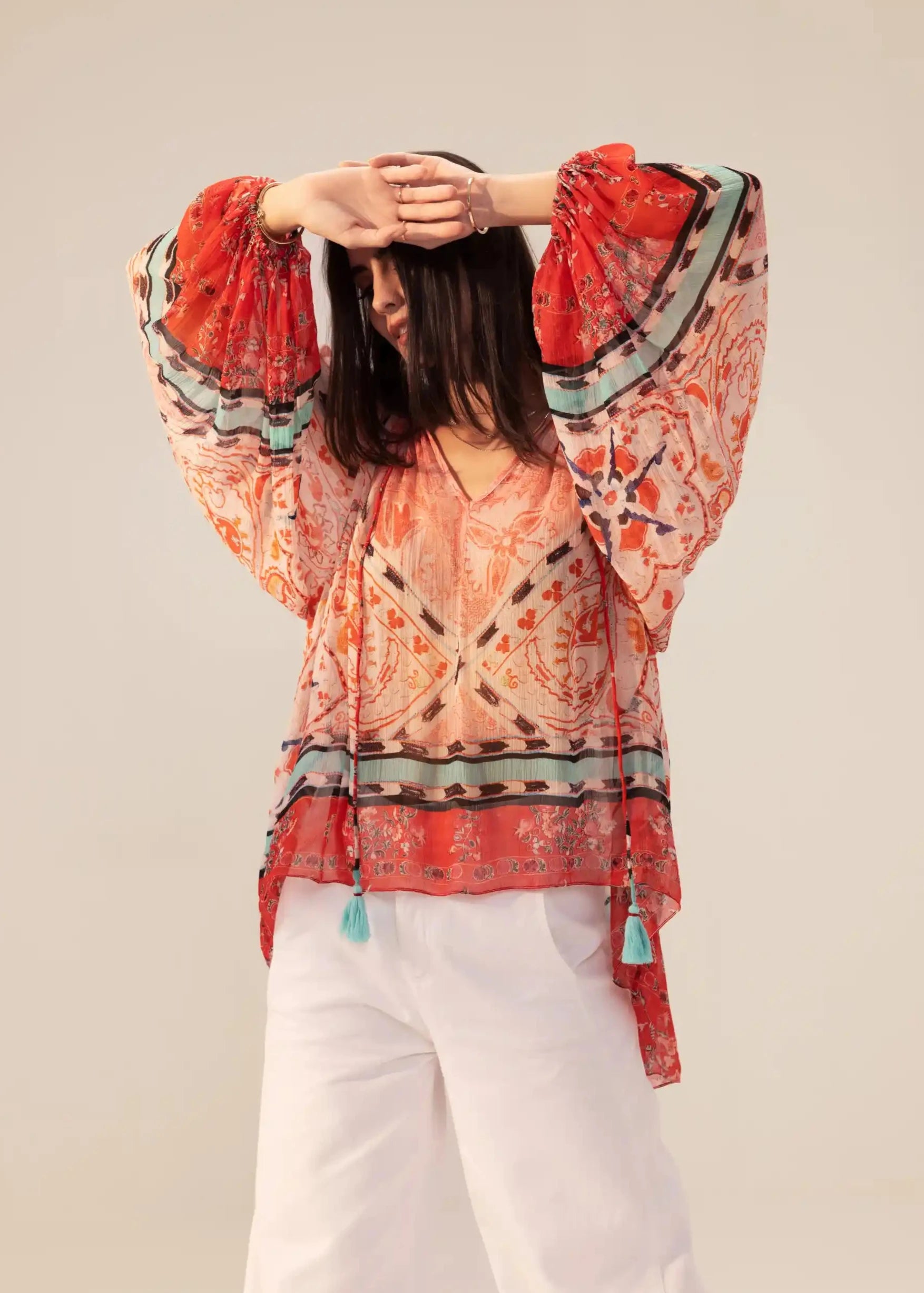 Channel effortless boho chic with our Bemberg chiffon ethnic placement printed top in a soft pink hue. Featuring stylish raglan sleeves and elasticated cuffs, this loose and fluid top offers both comfort and a relaxed fit. The drawstring with tassels and gathered neckline adds playful detail, making it perfect for casual outings or laid-back gatherings. Crafted from lightweight Bemberg chiffon, this versatile piece beautifully blends style and ease, making it a must-have for your wardrobe!