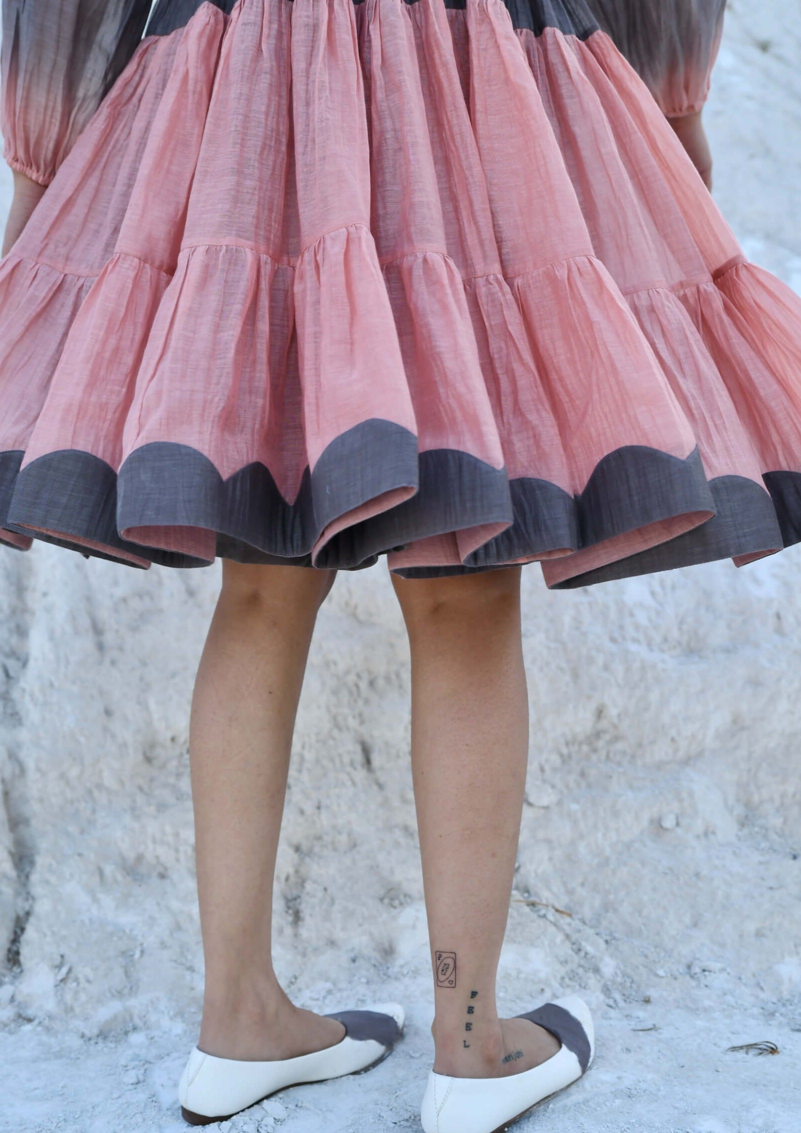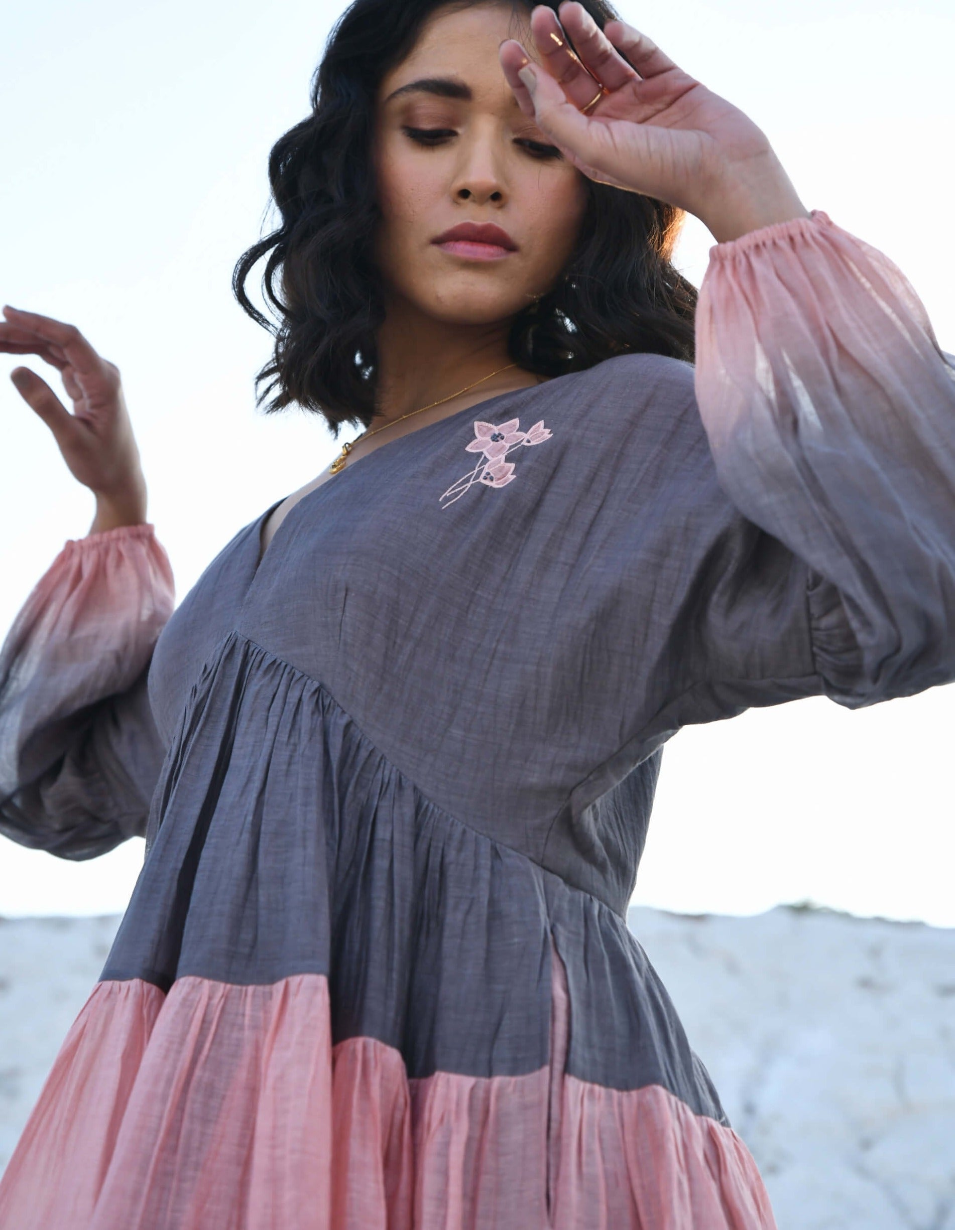 Introducing our 'Happy Summer' three-tier dress, crafted from lightweight and supremely soft chanderi silk. This vibrant piece features appliqued sea waves at the bottom, complemented by a plunging neckline and two convenient side pockets. Designed in a playful above-the-knee length, it showcases a dual color palette in salmon and stone gray. The dress is adorned with drop-down balloon sleeves for a touch of whimsy, along with an embroidered flower petal delicately placed on the bodice. Perfect for embracing the spirit of summer, this dress effortlessly combines comfort with playful sophistication.