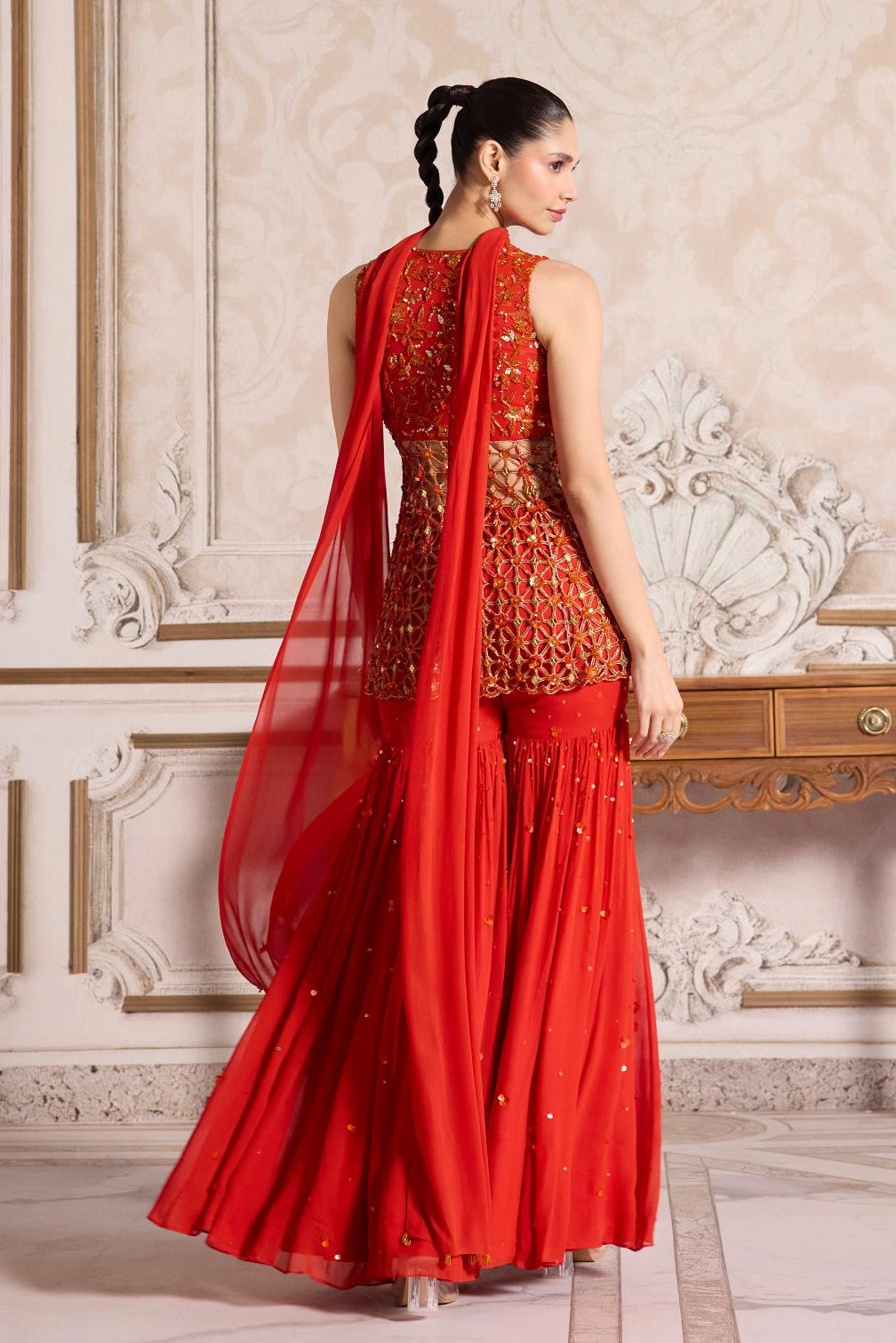 The Orange Cutwork peplum sharara set by Sanya Gulati embodies heritage craft and contemporary rhythm. The cutwork detailing enhances its festive charm, while the flared sharara offers graceful fluidity. Perfect for haldi, mehendi, or wedding brunches, this ensemble adds youthful vibrance and comfort to traditional occasions.