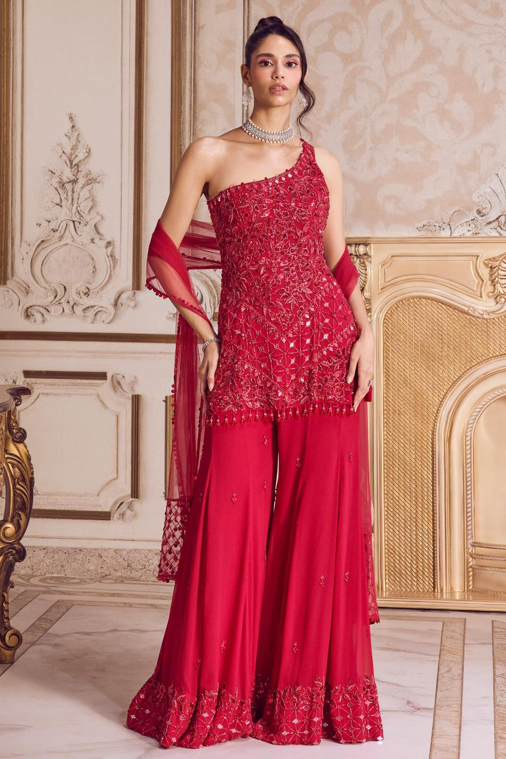 The Pink One-Shoulder one shoulder kurta set with pant is a modern, asymmetric take on festive wear. The single-shoulder design lends sculptural appeal while tailored pants keep the ensemble grounded and easy to wear. Perfect for contemporary ceremonies and intimate cocktail receptions, it’s a great pick when you want an elevated look without full lehenga formality.