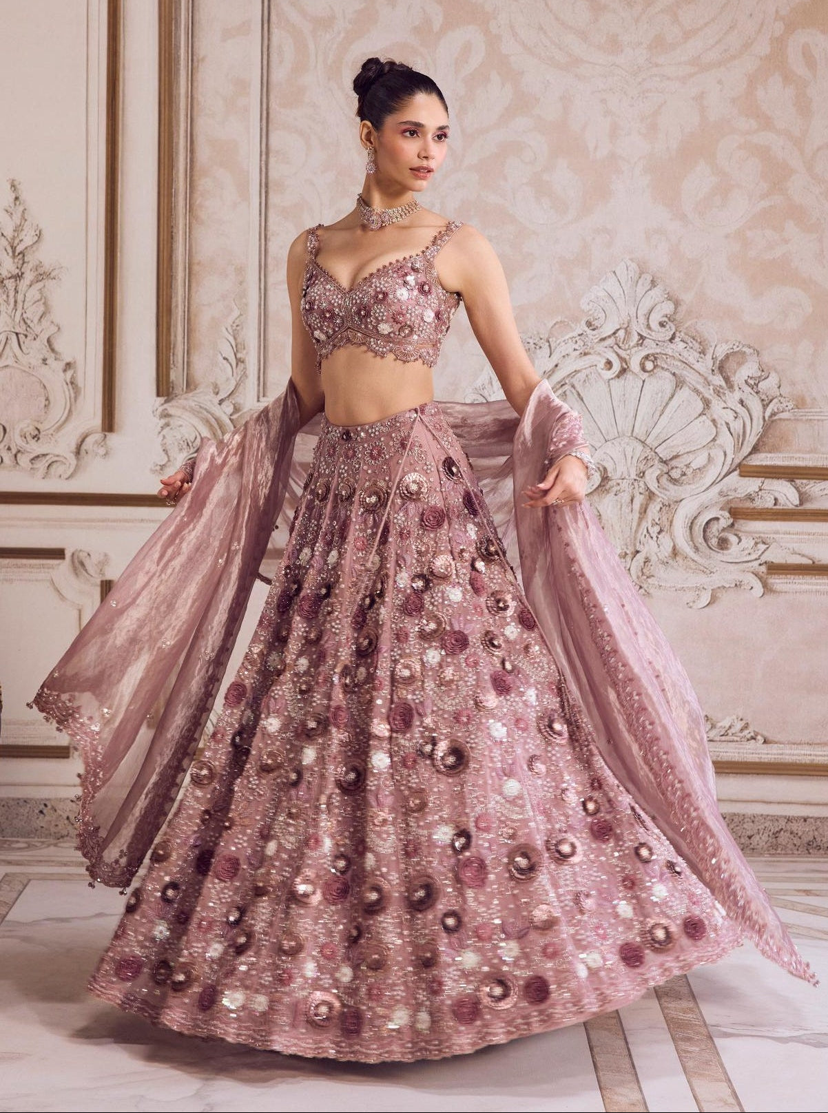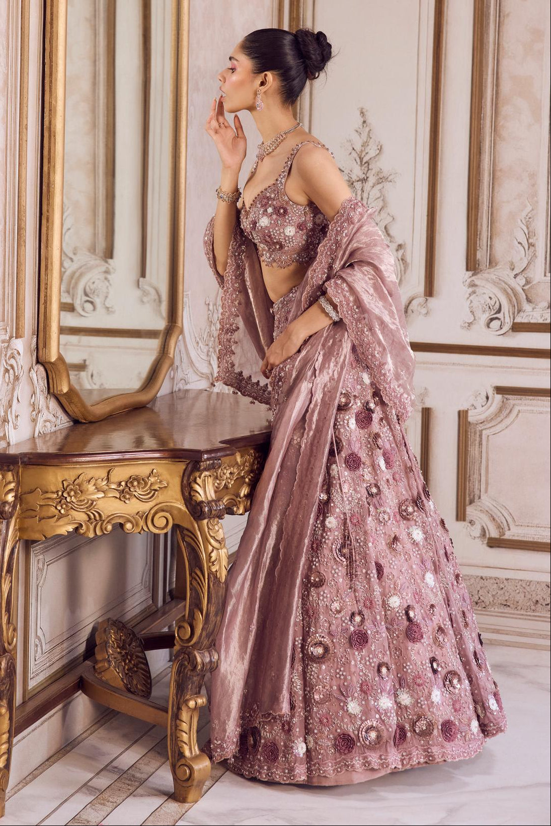 The Pink rose lehenga set with blouse by Sanya Gulati is a celebration of timeless elegance. The delicately embroidered blouse complements the soft-toned lehenga set, making it perfect for daytime festivities or mehendi ceremonies. The ensemble balances sophistication with effortless charm, ideal for bridesmaids or festive guests seeking understated glamour.