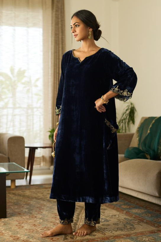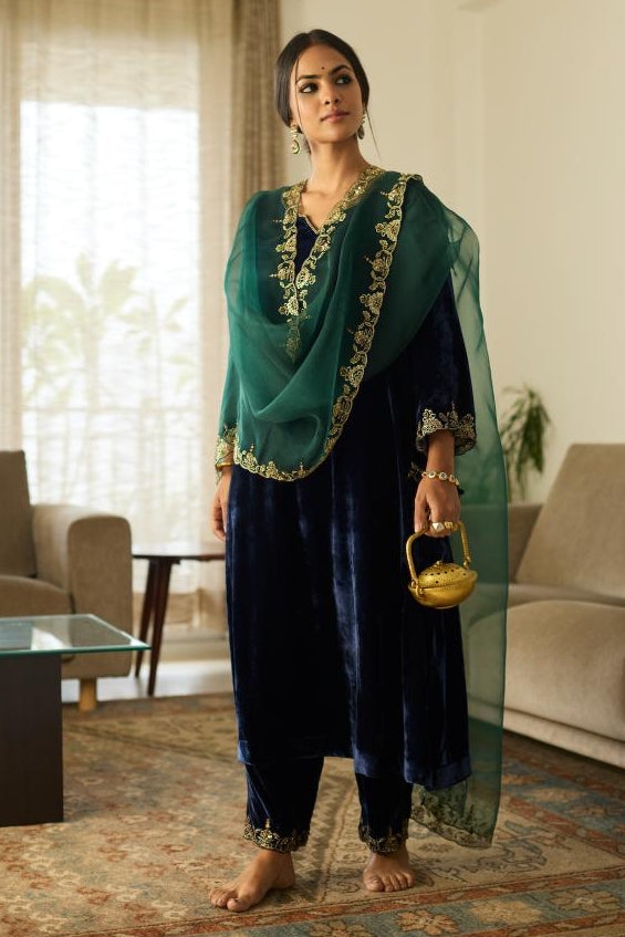 The Blue embroidered suit by Sarang Kaur radiates understated glamour and poise. Tailored in a fluid silhouette, this embroidered suit features fine embroidery that enhances its classic charm. The serene blue tone lends calm sophistication, making this embroidered suit ideal for day celebrations or festive evenings. Its craftsmanship ensures lasting comfort without compromising on refinement. Style this embroidered suit with traditional earrings and soft curls for a timeless ensemble. Each embroidered suit by Sarang Kaur balances traditional artistry with modern appeal—making it a must-have for elegant festive dressing.