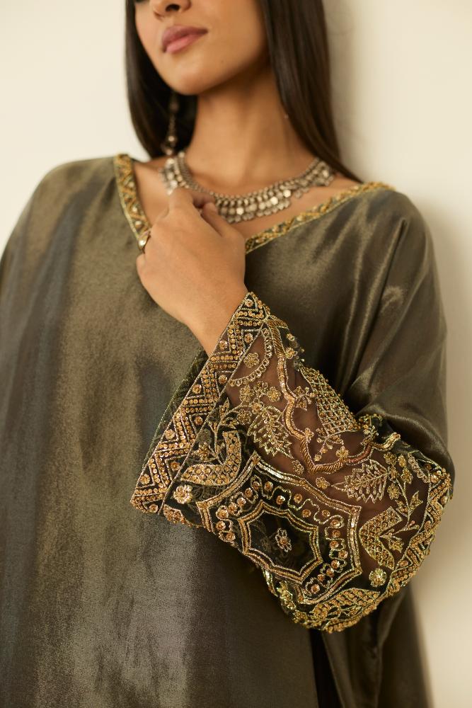 The Gray kaftan set by Sarang Kaur blends minimalism with refined craftsmanship. Crafted from premium crepe, this kaftan set drapes beautifully and enhances every movement. The tone-on-tone embroidery and delicate detailing make this kaftan set a versatile option for festive gatherings or destination celebrations. Whether styled with oxidized jewelry or heels, this kaftan set ensures effortless charm. The neutral gray palette adds timeless appeal, making the kaftan set a statement of quiet luxury. Every kaftan set by Sarang Kaur symbolizes comfort and elegance for today’s confident woman.