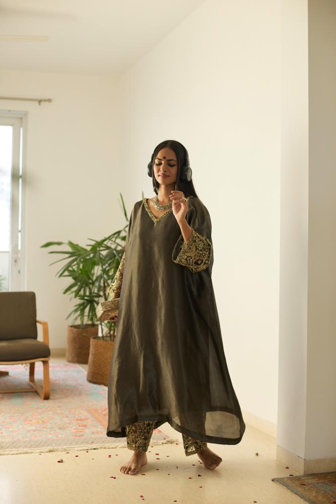 The Gray kaftan set by Sarang Kaur redefines modern-day luxury with its understated elegance. The subtle hue, intricate embroidery, and fluid silhouette make it an exquisite choice for brunches, festive evenings, or resort celebrations. Designed for comfort and sophistication, this ensemble brings a refreshing perspective to contemporary Indian wear.