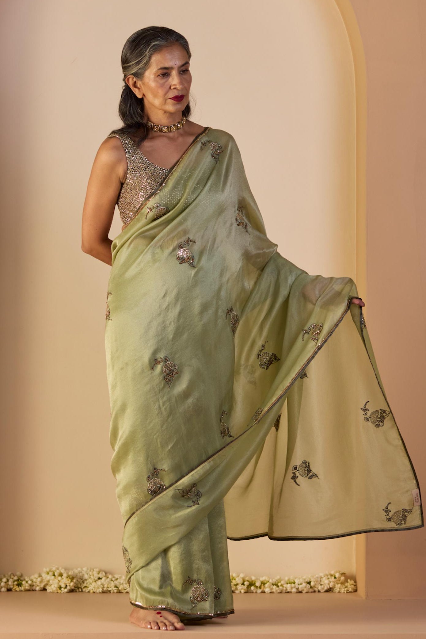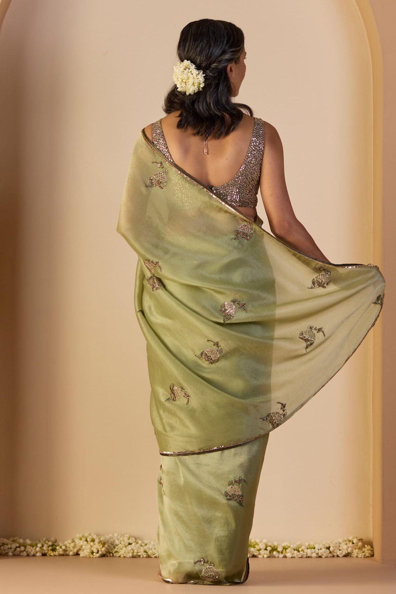 This saree by Sarang Kaur is designed in a rich green shade for Indian weddings and festive events. The flowing drape and detailed embroidery ensure elegance and comfort. Ideal for daytime celebrations or evening functions, this designer saree blends traditional motifs with contemporary design. The saree offers effortless grace and versatility, making it a standout choice for festive gatherings. Pair with statement accessories for a polished, sophisticated look. With a focus on refined aesthetics, this saree delivers both comfort and visual impact, perfect for Indian wedding occasions.