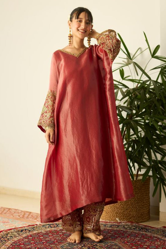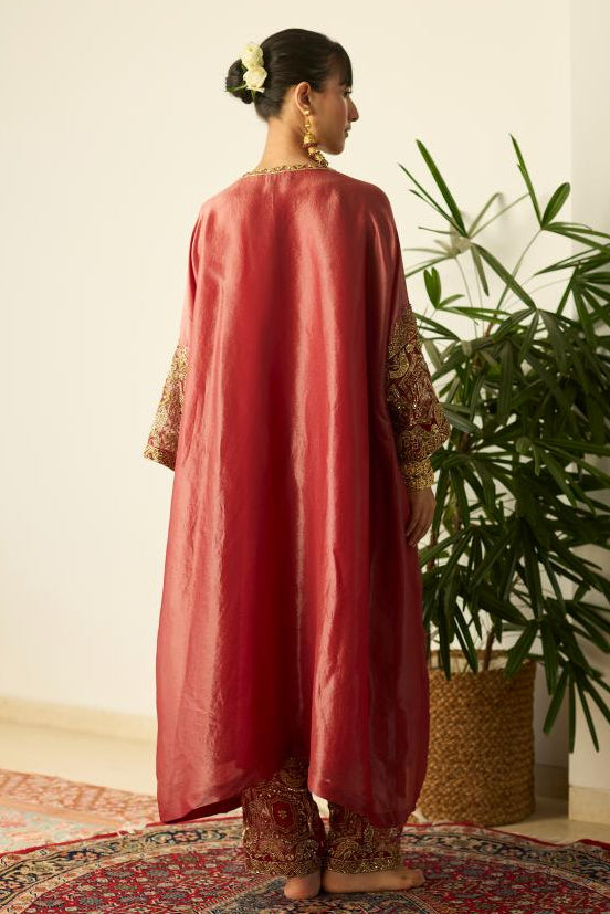 The Red kaftan set by Sarang Kaur marries effortless style with artisanal detailing. Crafted in flowy crepe, this kaftan set embodies festive sophistication and ease. Its embroidered neckline and graceful fall ensure that the kaftan set flatters every figure. Designed for cocktail events or modern celebrations, this kaftan set transitions seamlessly from traditional to contemporary spaces. The vibrant red hue adds a touch of drama and allure, making the kaftan set a must-have festive statement. Pair this kaftan set with metallic heels and statement earrings for a perfect fusion look. Each kaftan set from Sarang Kaur stands for effortless elegance redefined.