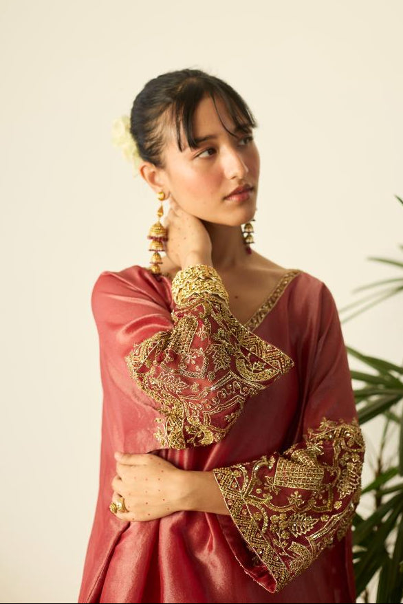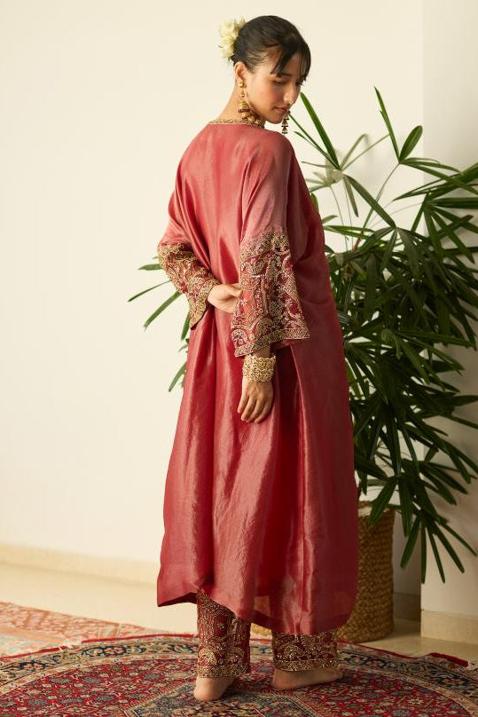 The Red Kaftan Set by Sarang Kaur celebrates bold elegance through a fusion of comfort and couture craftsmanship. Its fluid, relaxed silhouette is thoughtfully designed to flatter while allowing easy movement, making it an effortless choice for long celebrations. Intricate embroidery enhances the rich red hue, adding artisanal detail that reflects festive luxury. Ideal for evening soirées, intimate gatherings, and wedding functions where ease and style are equally essential, this kaftan set offers a confident statement with minimal effort. Pair it with contemporary jewelry and embellished footwear to elevate the look, or keep it understated for a chic, modern festive appearance.