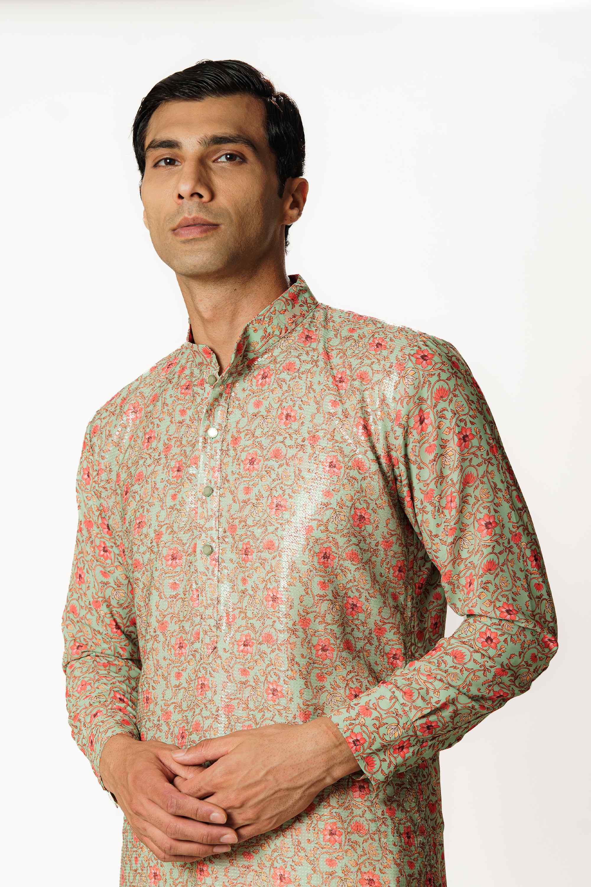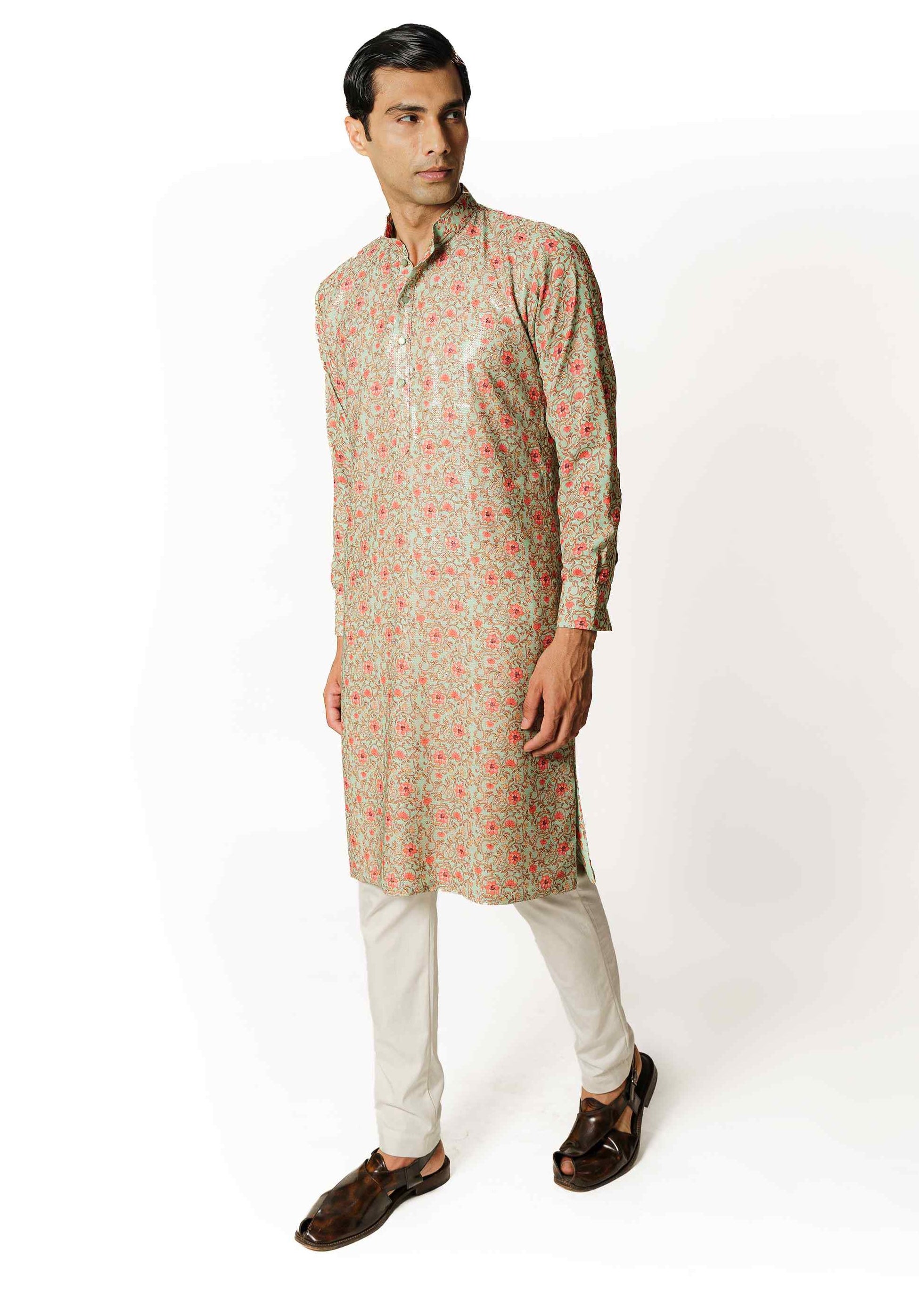 Embrace elegance with our sea green print kurta and pant set, designed to captivate and charm. The kurta features a serene sea green print, crafted from a sophisticated blend of sheeting and georgette, and lined with smooth crepe for a graceful drape and enhanced comfort.