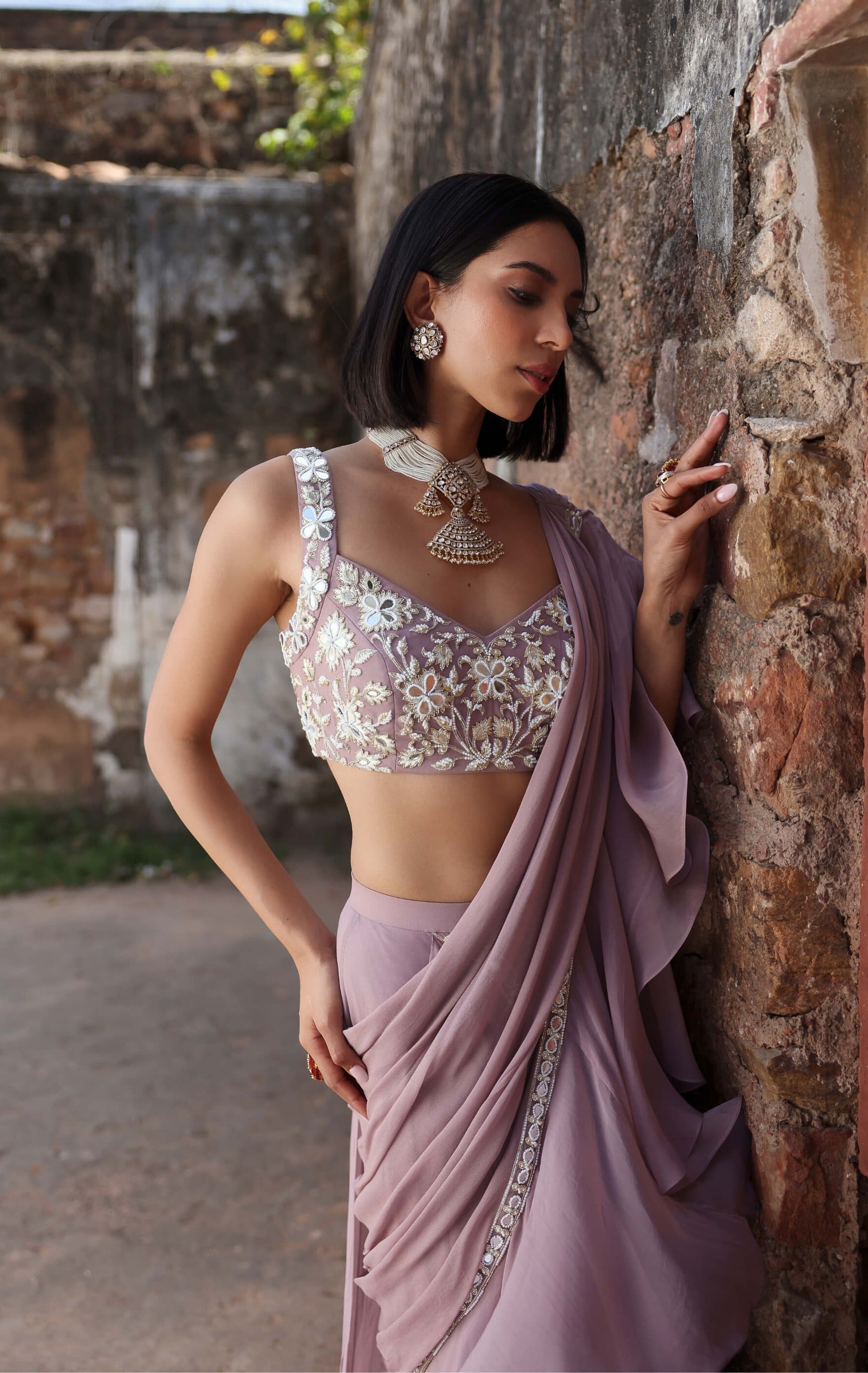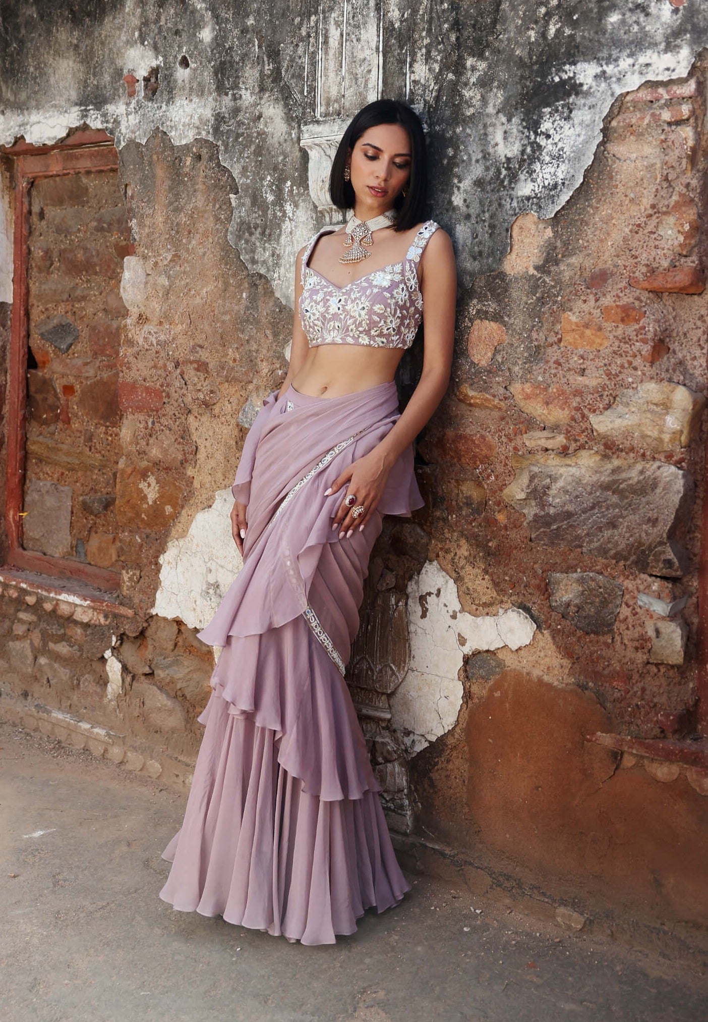 Experience the perfect fusion of classic charm and modern sophistication with our lilac embellished choli, paired with a pre-draped ruffle saree. Ideal for weddings, festive occasions, and glamorous events, this ensemble radiates grace and luxury, ensuring you make a memorable impression with timeless elegance. Embrace a refined look that combines exquisite detailing with contemporary style, and indulge in an outfit designed to highlight your natural beauty and sophistication.