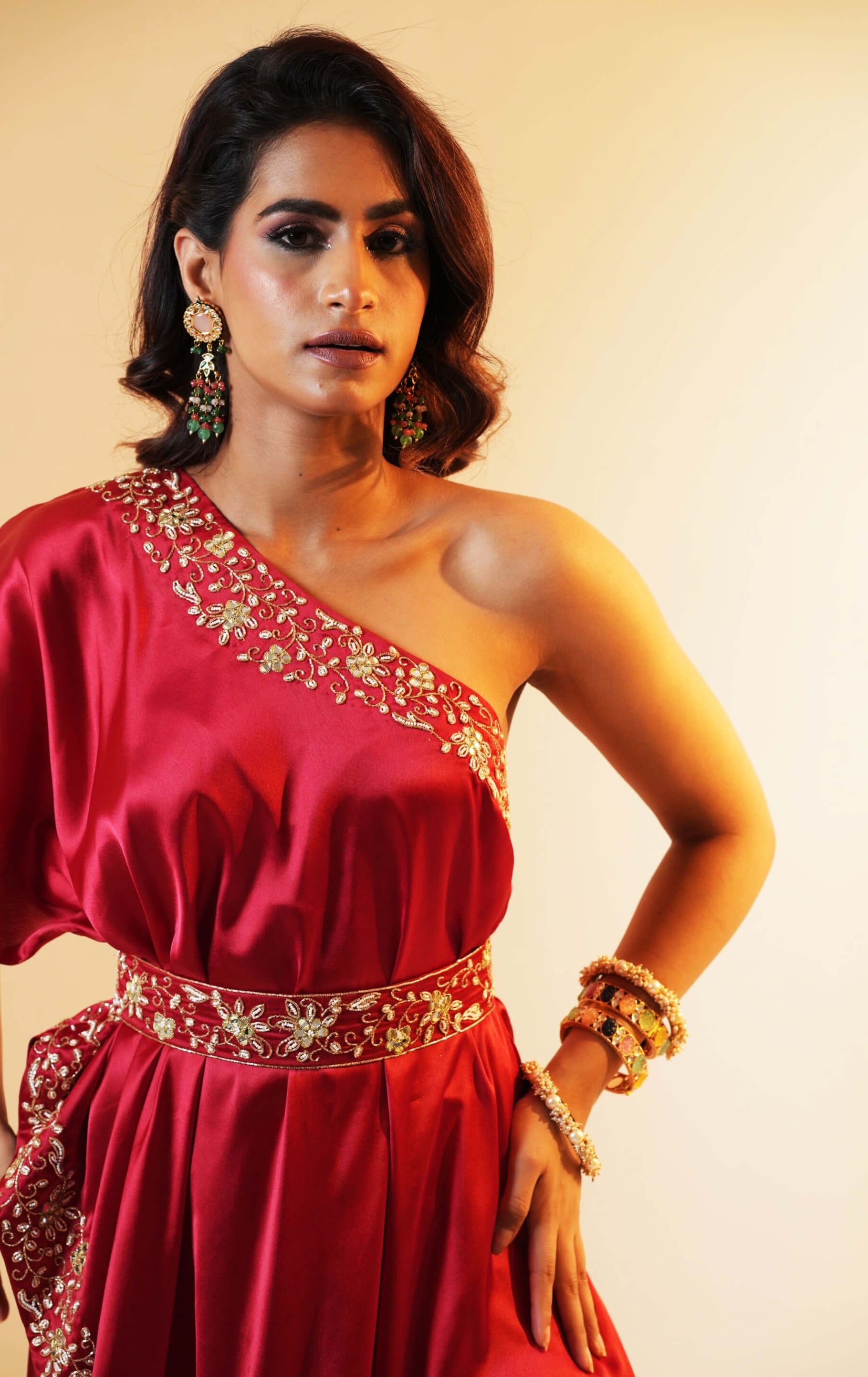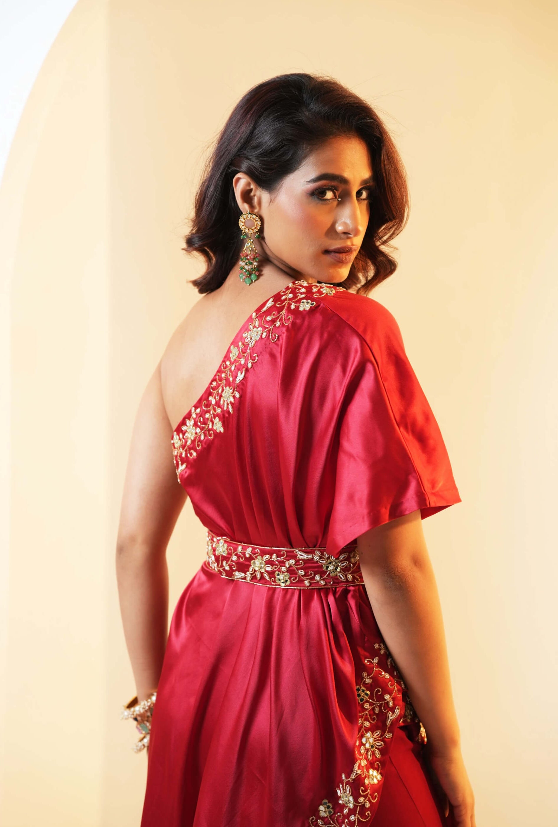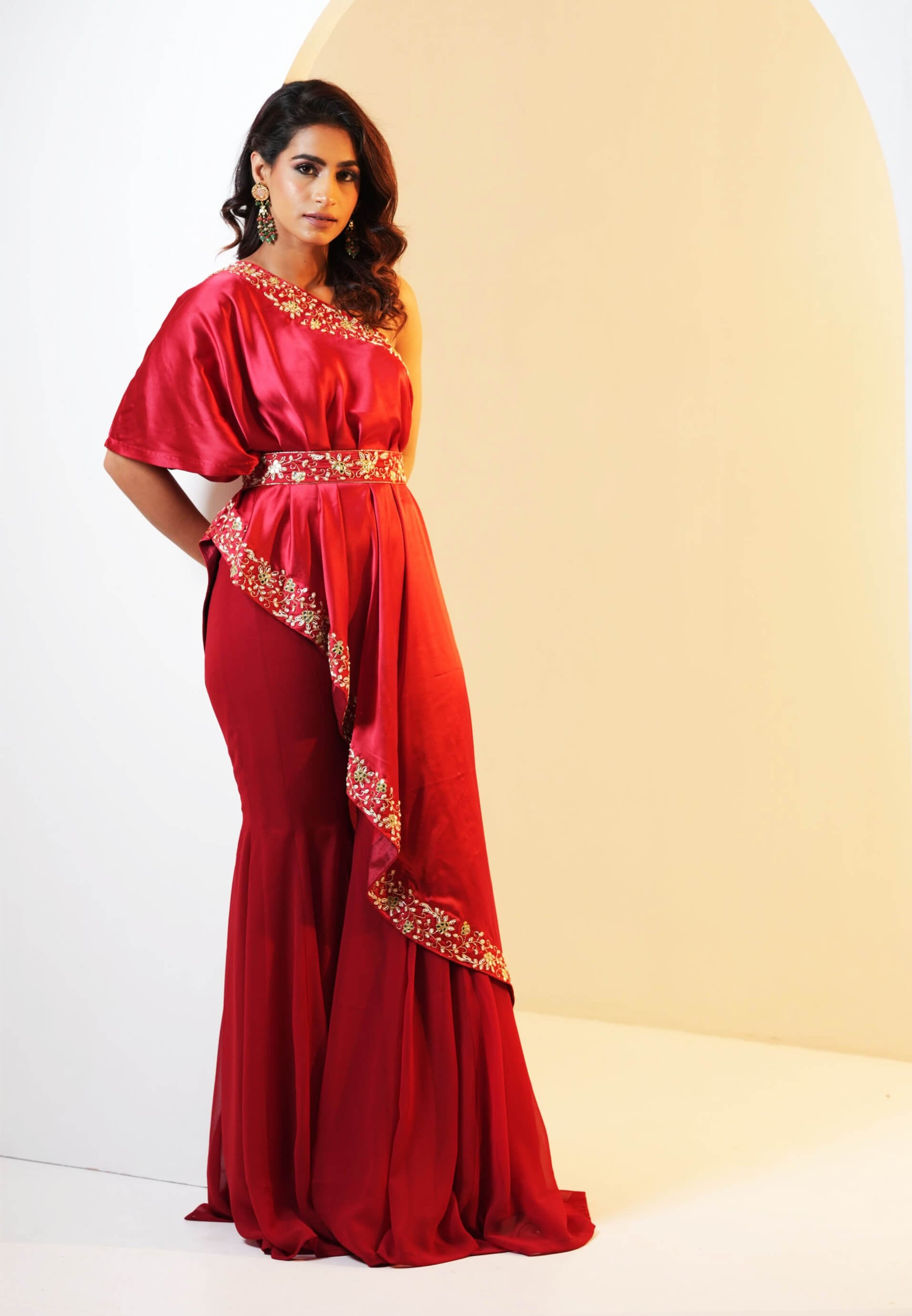 Fabric: Cape: satin, inner: satin, sharara: georgette, belt: satin