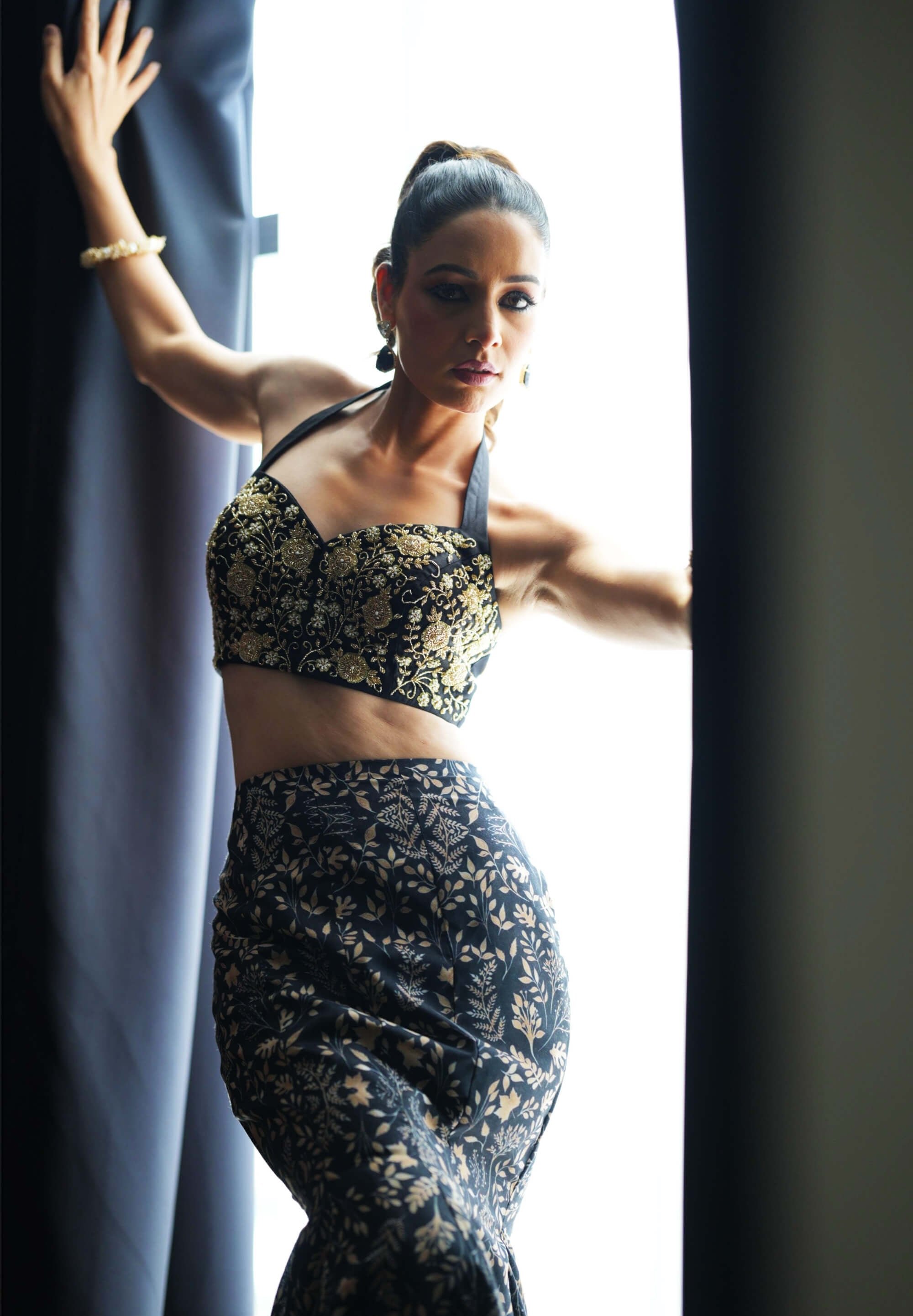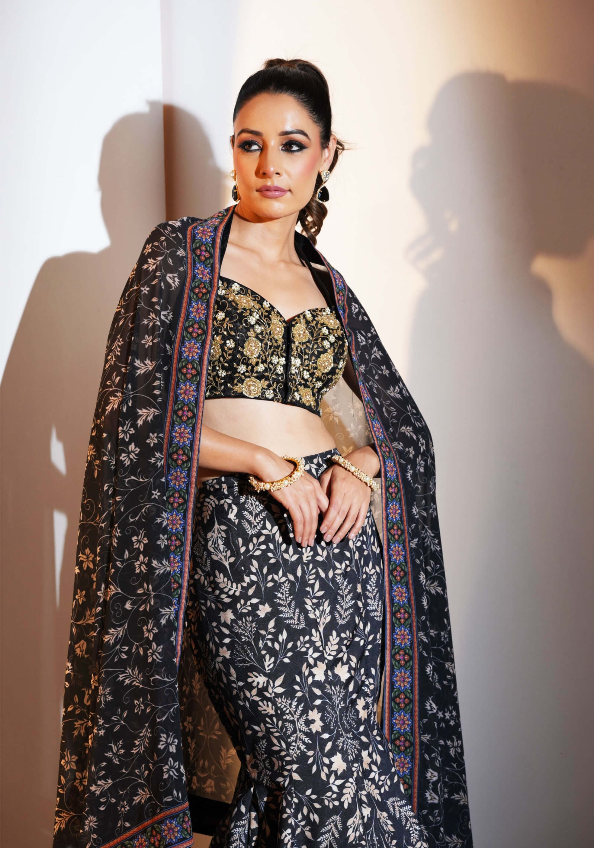 Elevate your ensemble with the sophistication of a black printed modal silk fishtail skirt paired beautifully with a hand-embroidered blouse and printed georgette dupatta. The fishtail skirt, adorned with intricate prints on modal silk, exudes elegance and modernity. Complementing this is the hand-embroidered blouse, which adds a touch of sophistication with its detailed craftsmanship. Complete your look with the printed georgette dupatta, enhancing the outfit with its lightness and delicate patterns. Perfect for both formal and festive occasions, this ensemble combines contemporary style with traditional charm, ensuring you stand out with refined elegance and grace.