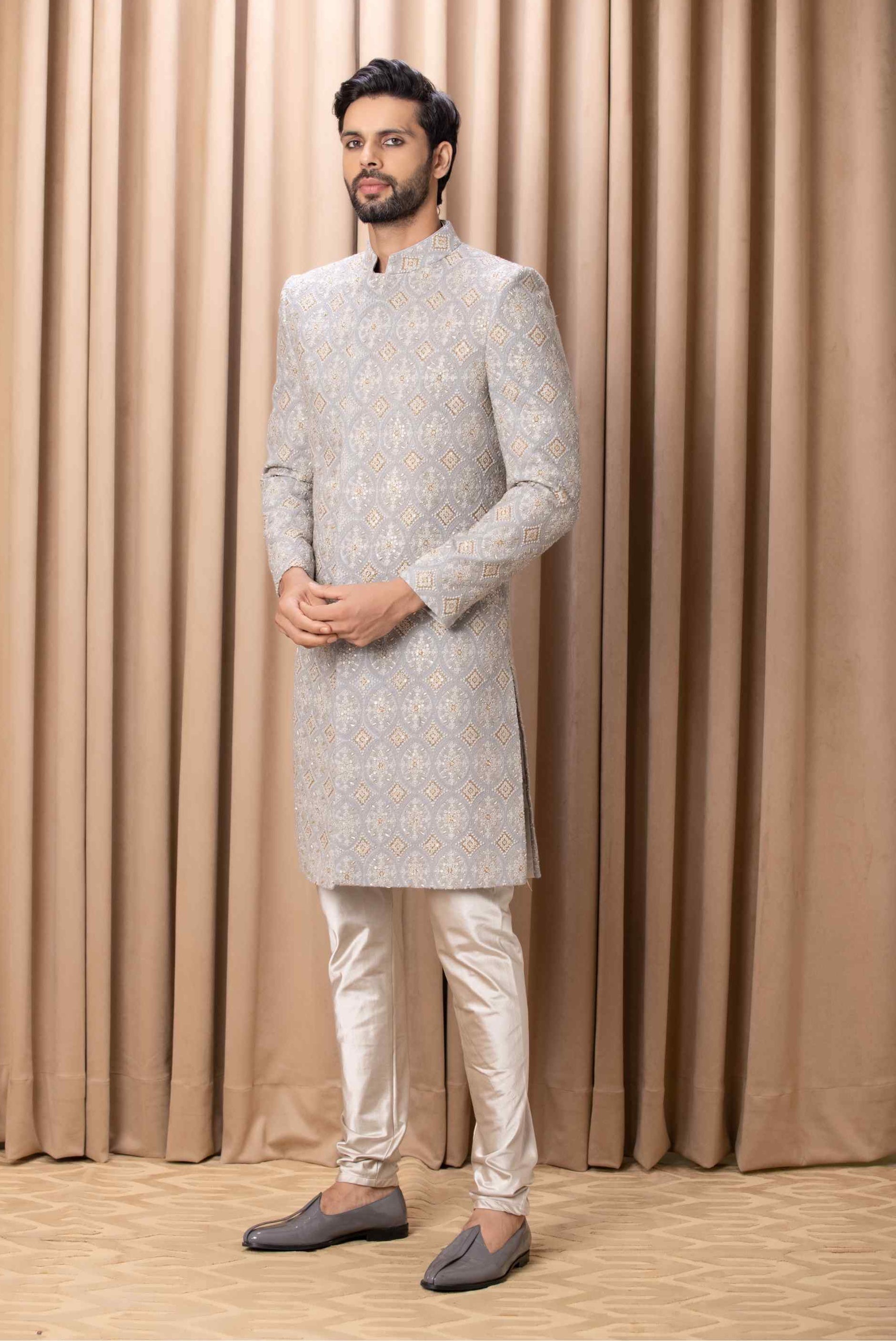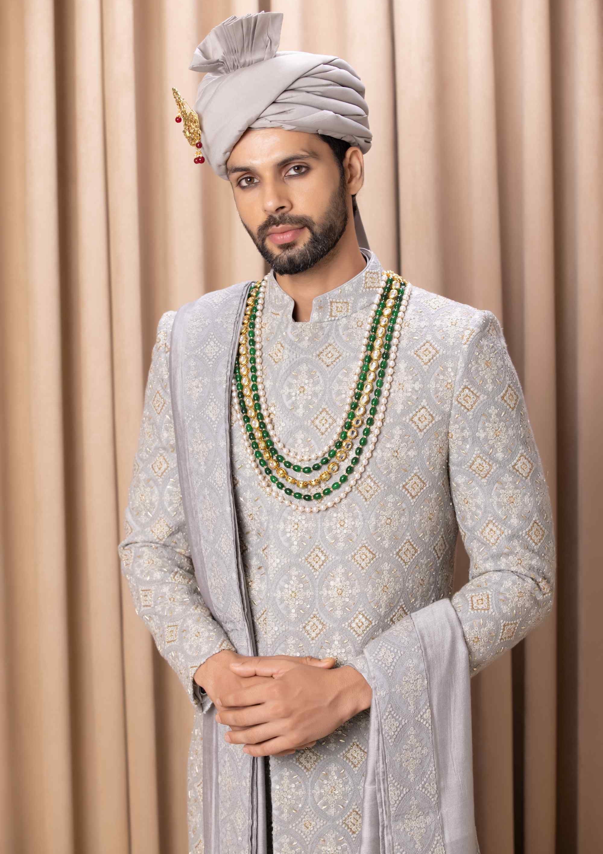 Indulge in refined elegance with our traditional hand-embroidered sherwani in a sophisticated rhino gray. This distinguished ensemble features intricate detailing that blends classic craftsmanship with contemporary design, making it ideal for a classy wedding. The set includes a matching rhino gray cotton silk kurta, a rhino gray embroidered stole, and a churidaar, ensuring a cohesive and polished appearance. Perfectly crafted for the modern groom who values both tradition and style, this outfit promises to make a striking impression on your special day.