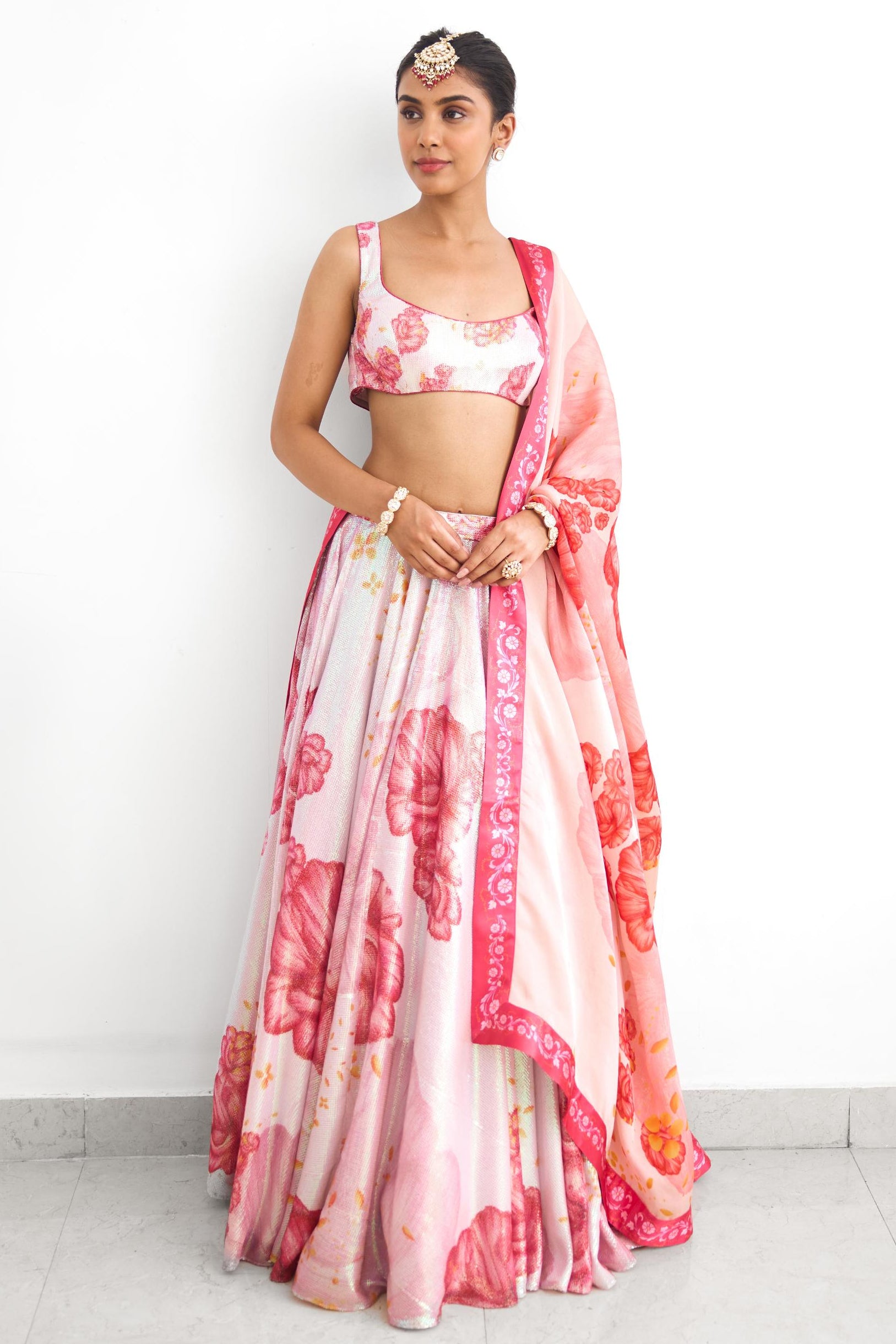 The Blush Bloom Rooh Rang lehenga set is curated for romantic wedding festivities and celebratory occasions. Its sequin detailing and printed dupatta make it suitable for evening functions and receptions.