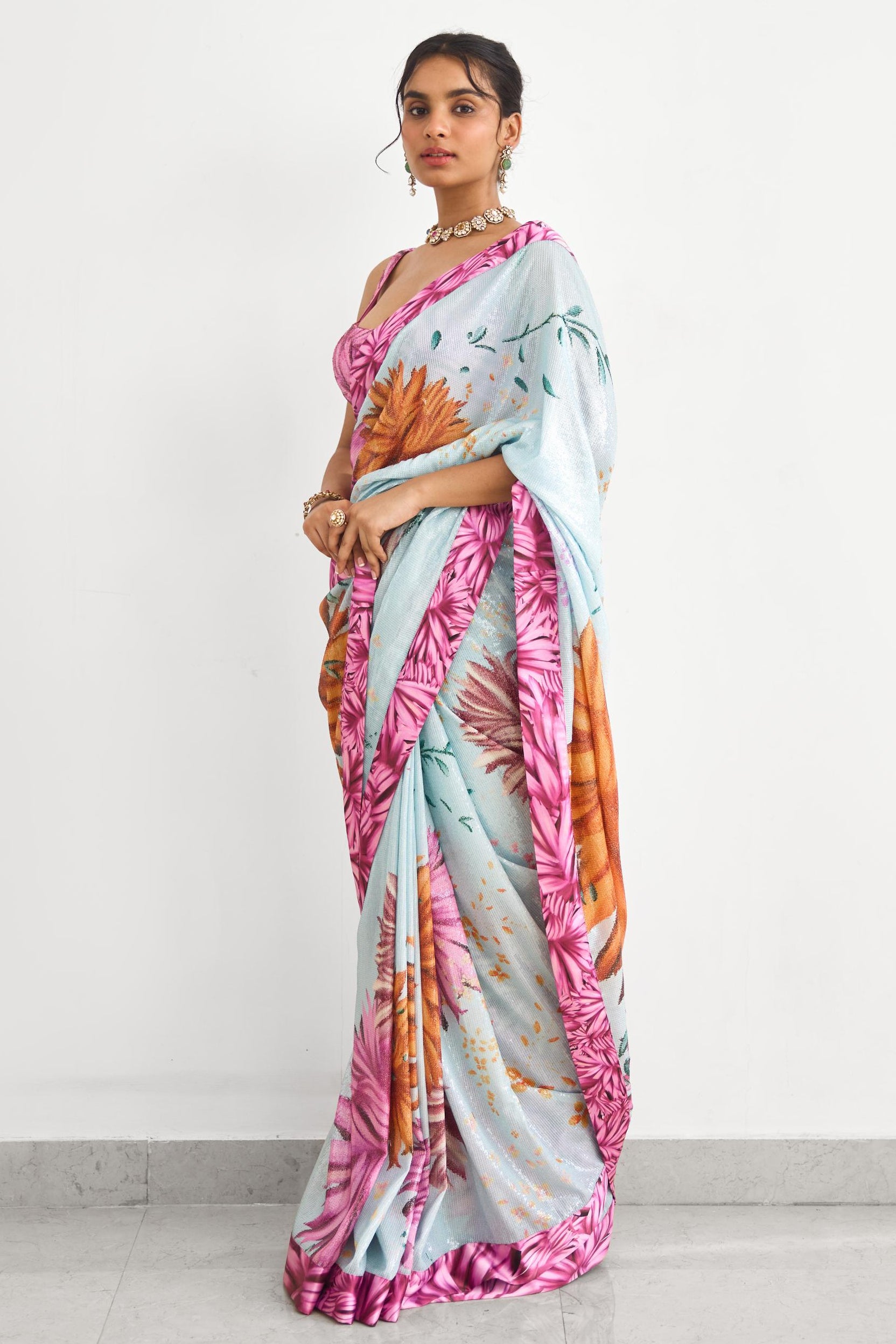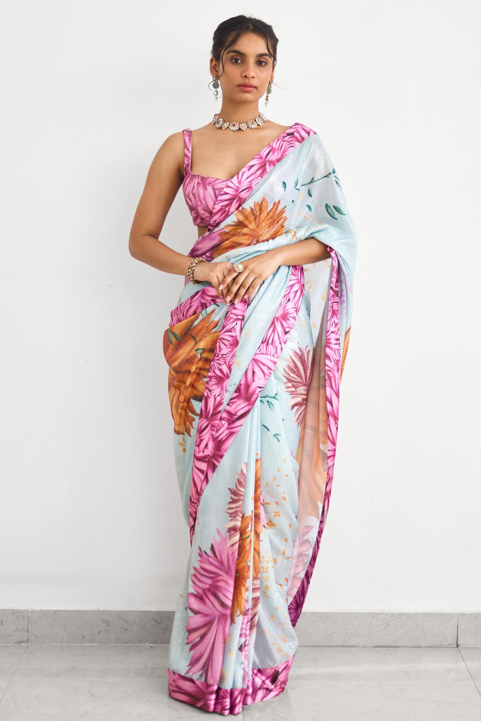 The Bright Flower Rooh Rang saree by Shasha Gaba is crafted for vibrant wedding celebrations and festive occasions. This saree features floral-inspired detailing that adds freshness and charm to the overall look. Designed for comfort and elegance, the saree drapes effortlessly, making it suitable for extended daytime events. The lively colour palette enhances the appeal of the saree, ensuring it stands out during wedding functions. Ideal for mehendi ceremonies and festive gatherings, this saree pairs beautifully with minimal jewellery for a balanced look. The lightweight fabric ensures ease of movement, allowing the saree to remain comfortable throughout the celebration. Styled with traditional accessories or modern accents, this saree adapts seamlessly to different festive settings. A joyful yet elegant ensemble, this saree reflects timeless celebration wear.