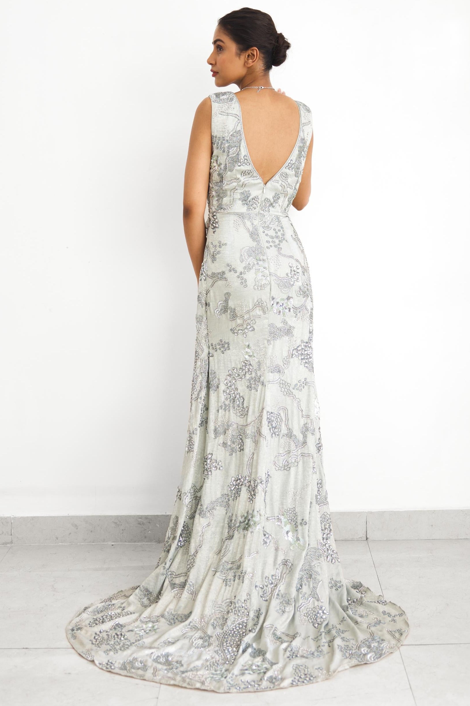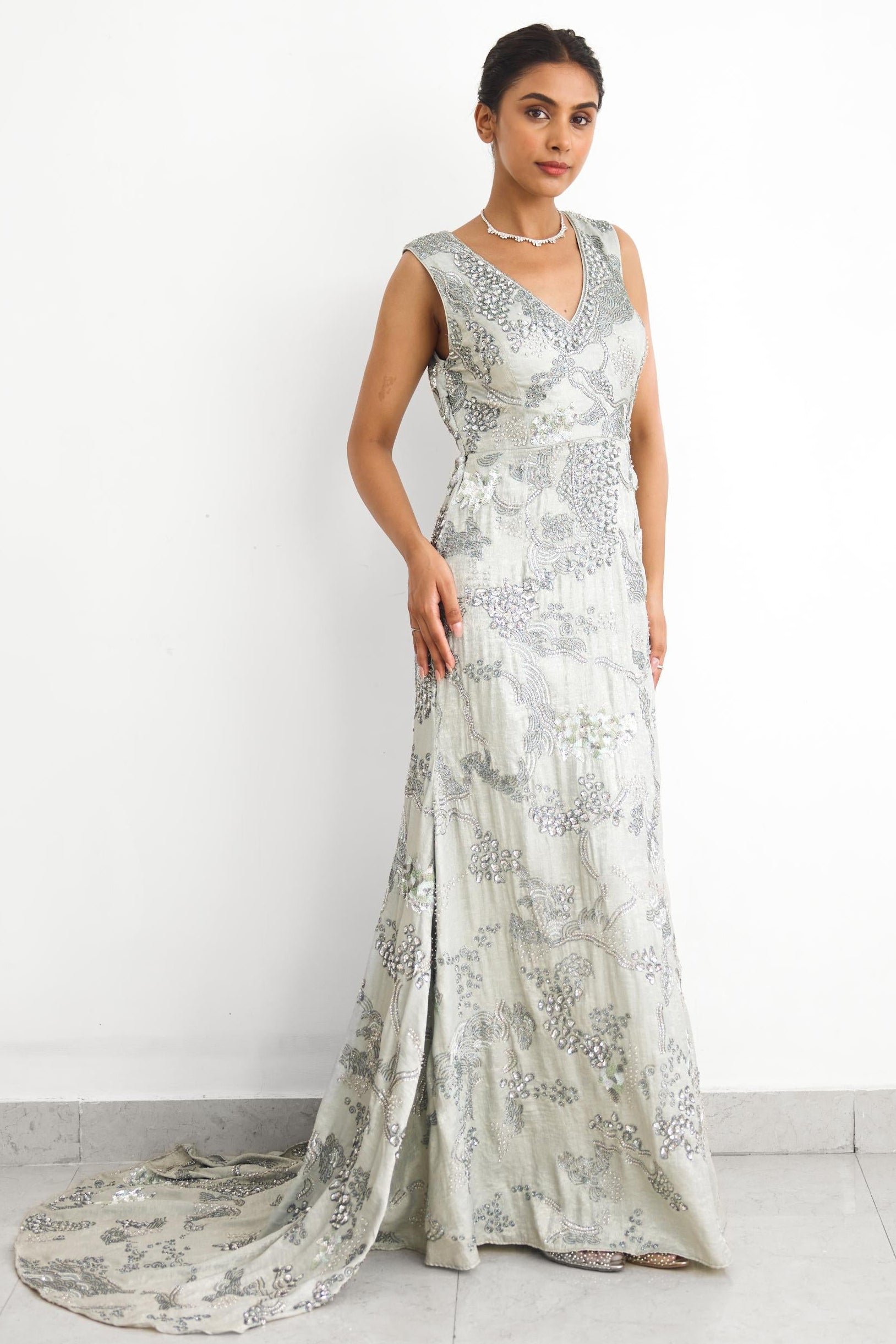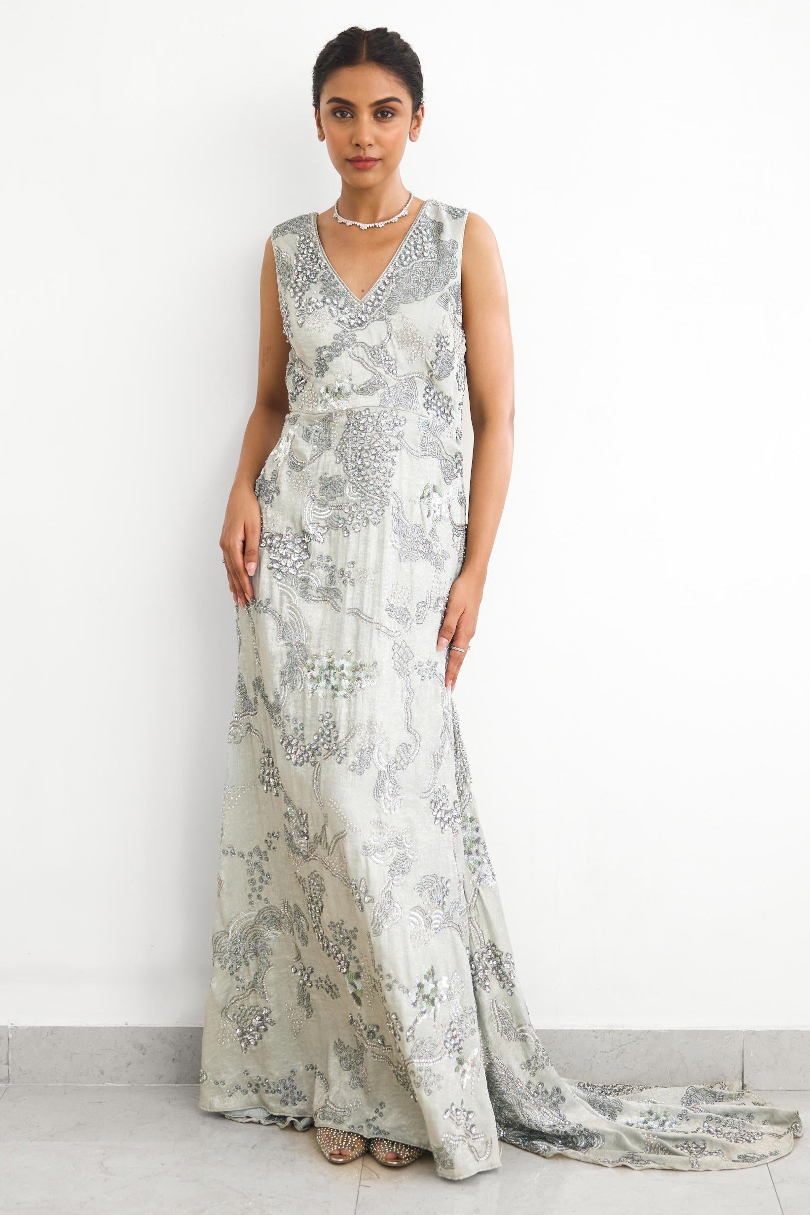 The Sea Breeze Rooh Rang gown is curated for modern festive evenings and elegant celebrations. Its floor-length silhouette and fluid design make it ideal for cocktail parties, receptions, and contemporary festive gatherings.