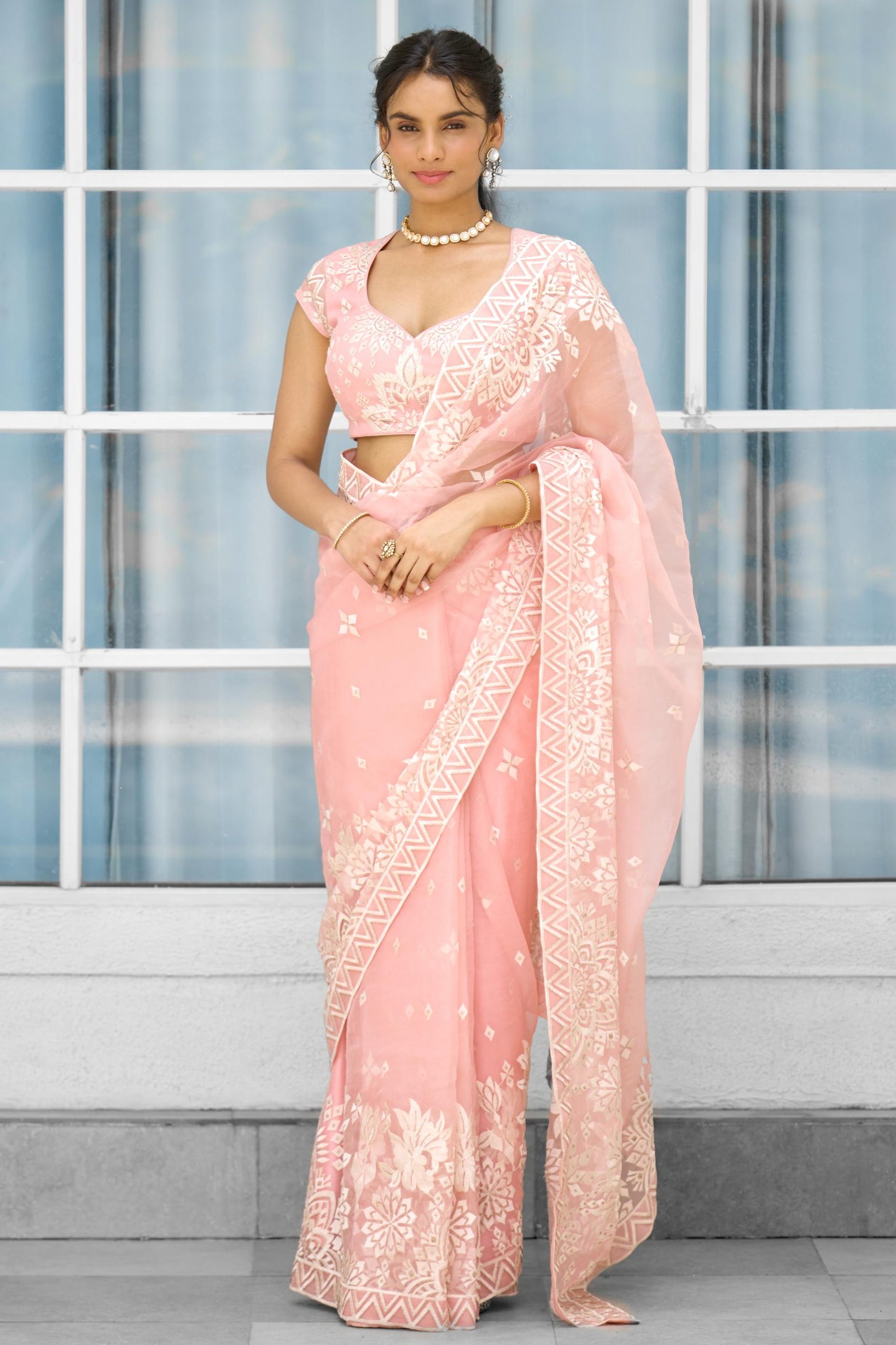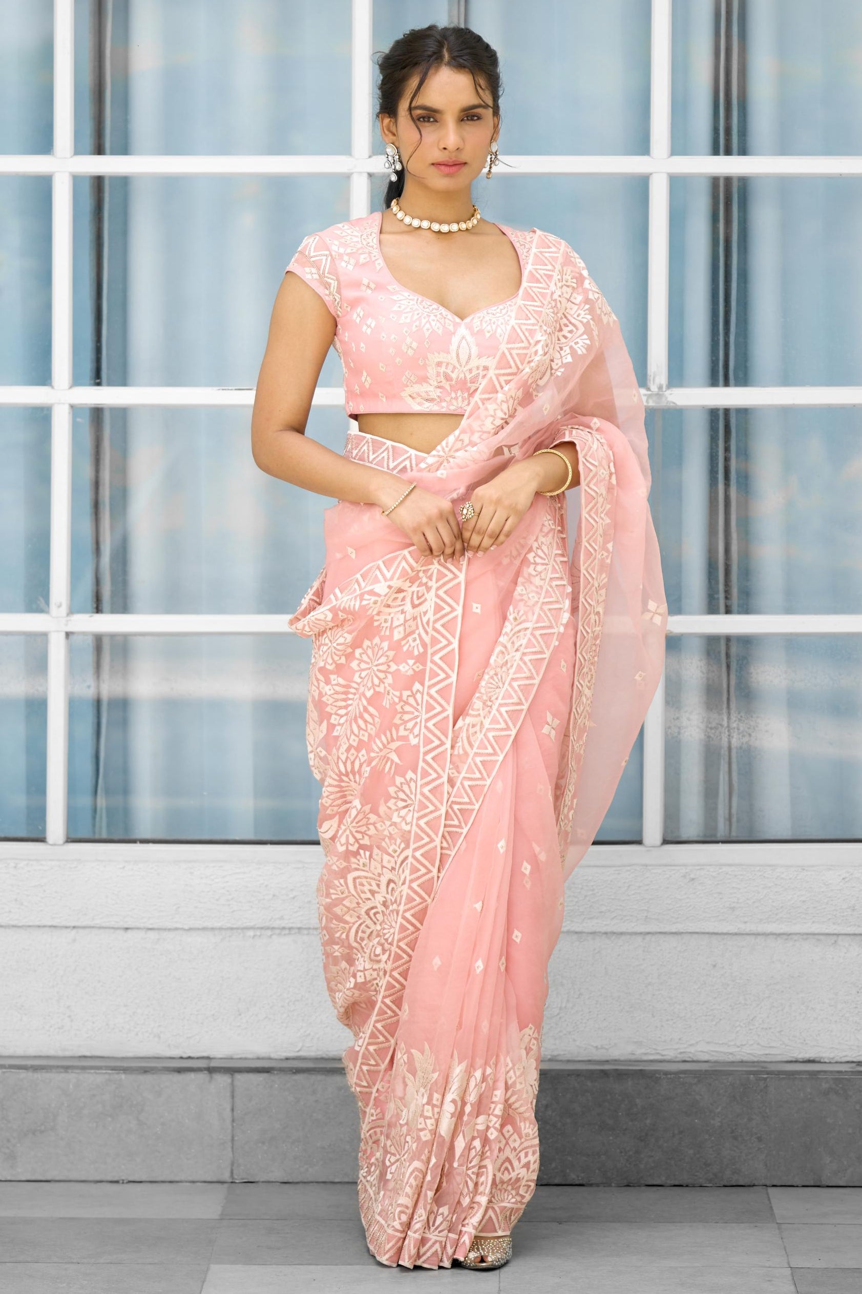 The Whispers of Rose Rooh Rang hand embellished saree is curated for elegant wedding moments and refined festive occasions. With delicate handwork and a coordinated blouse, it is ideal for receptions, family ceremonies, and celebratory evenings.