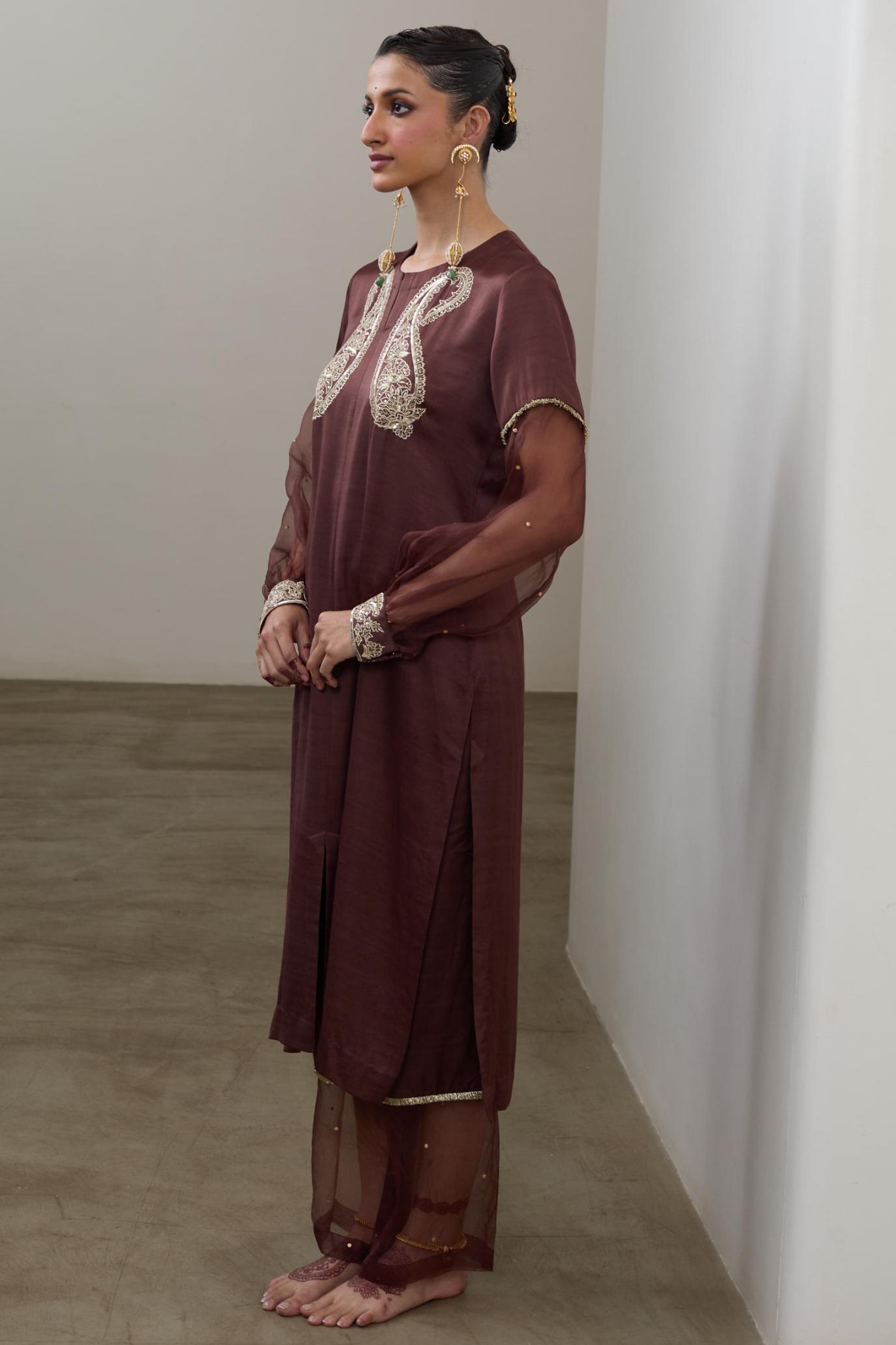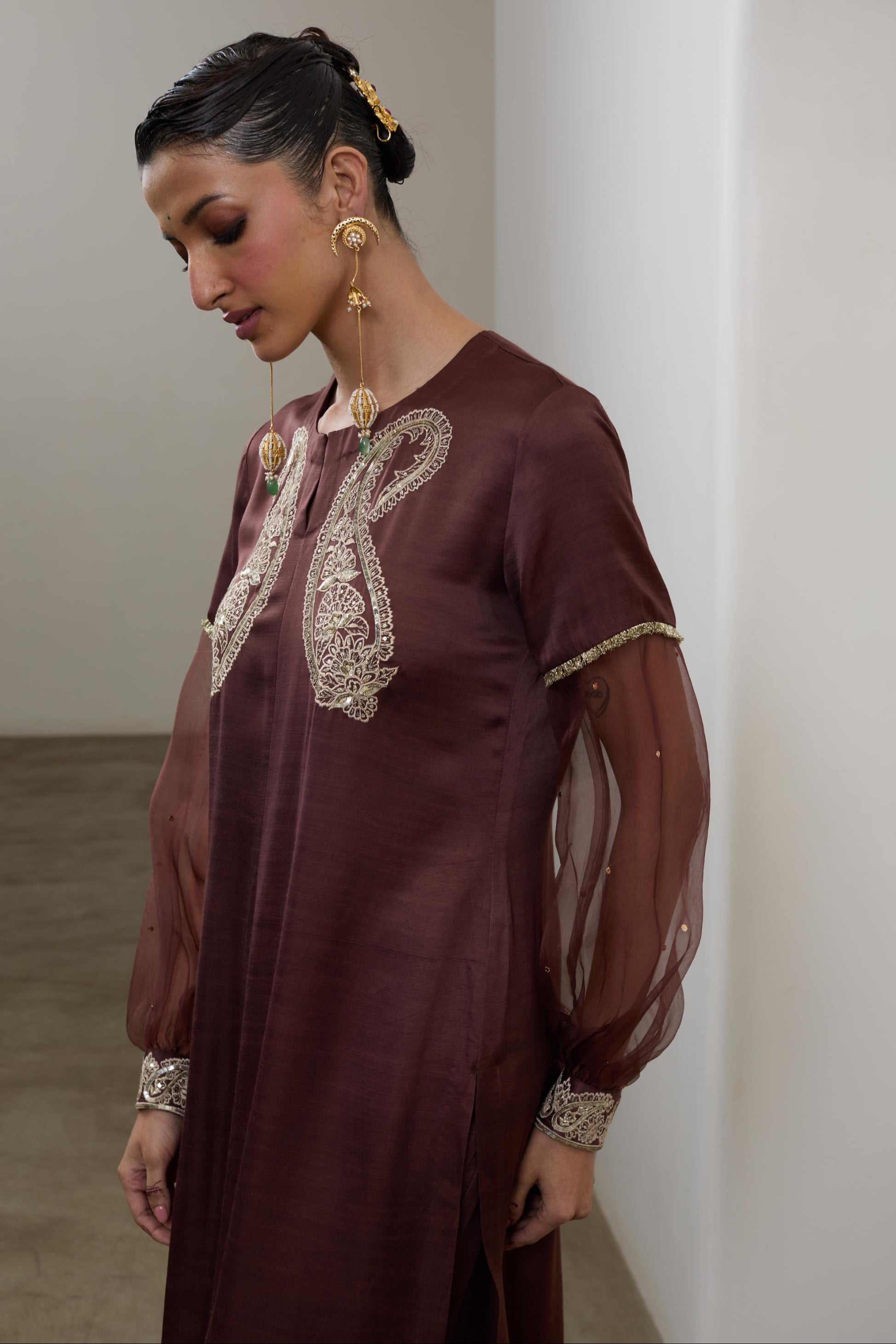 The Brown pashmina silk embroidered kurta set is curated for understated festive elegance and traditional celebrations. The earthy brown tone paired with fine embroidery makes it suitable for weddings, cultural gatherings, and evening festivities. Designed for women who prefer warm, classic palettes, this kurta set offers timeless appeal.