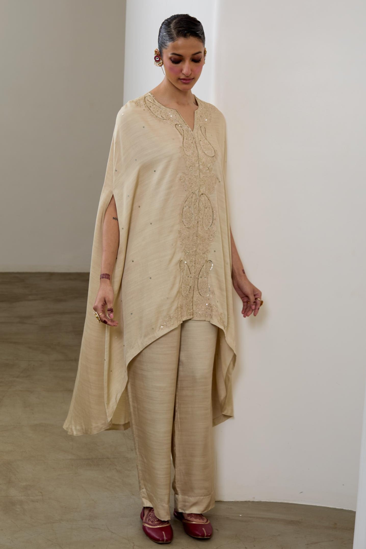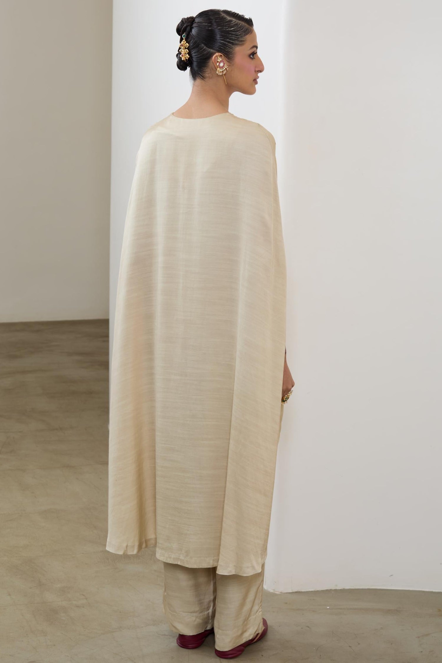 The Ivory pashmina silk cape and pant set by Sheela Suthar showcases modern elegance. This cape and pant set features luxurious pashmina silk that drapes gracefully. Designed for festive occasions, the cape and pant set offers comfort and style. Its ivory tone enhances the cape and pant set for evening wear. Ideal for celebrations, this cape and pant set blends contemporary design with traditional fabric.