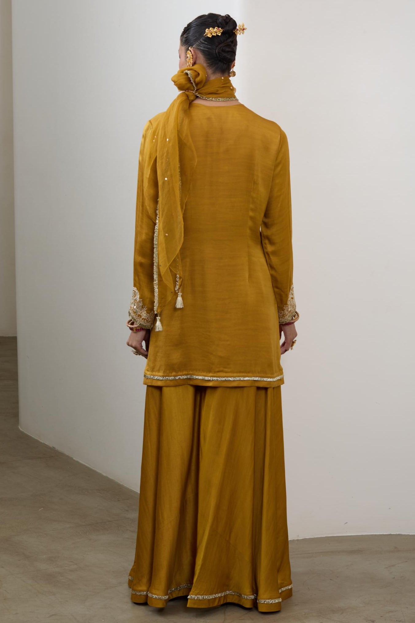 The Mustard pashmina silk embroidered sharara set is curated for vibrant festive functions and traditional wedding celebrations. The warm mustard hue adds richness and character, making it ideal for daytime ceremonies and celebratory gatherings. Designed for women who enjoy bold festive tones, this sharara set delivers elegance with warmth.