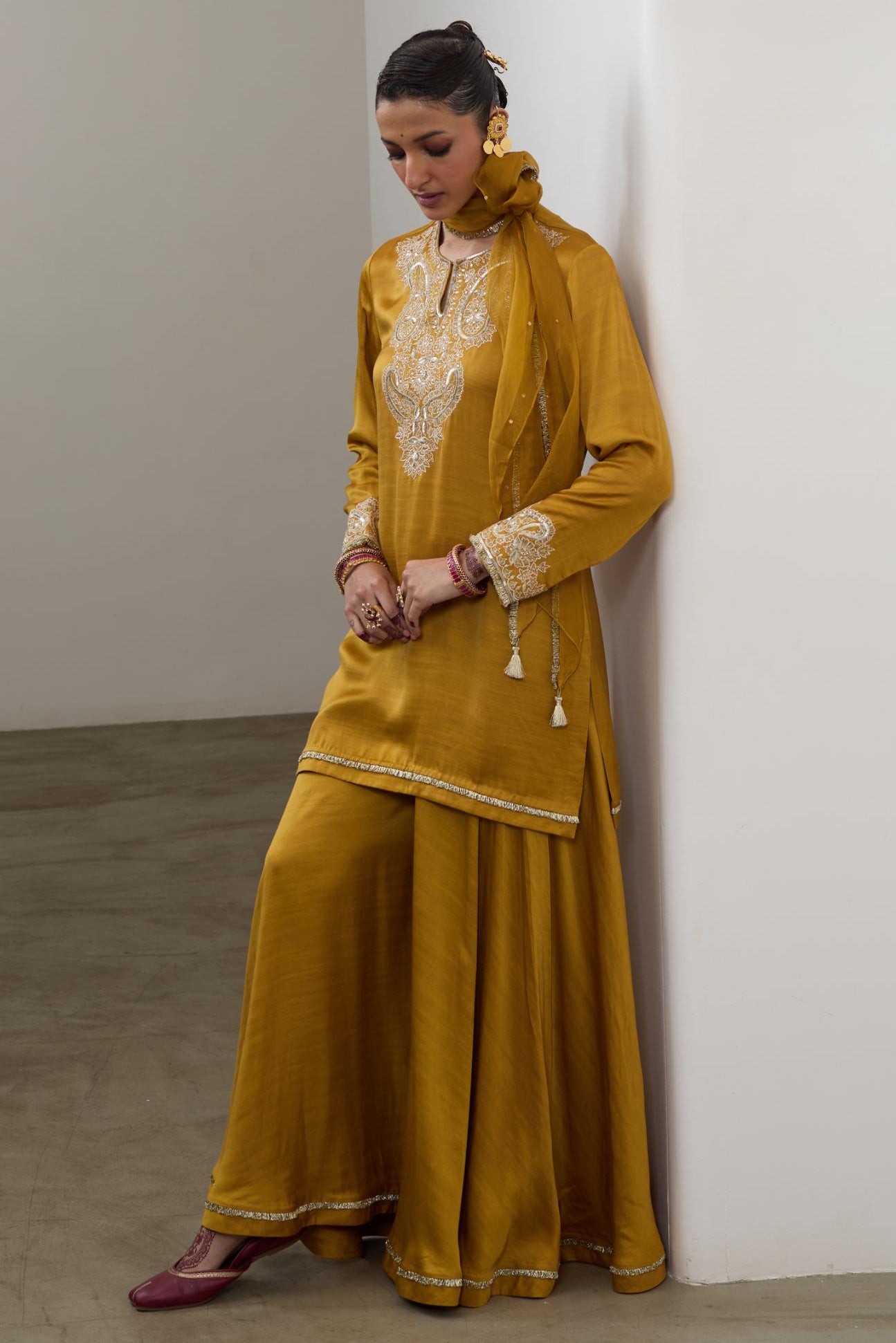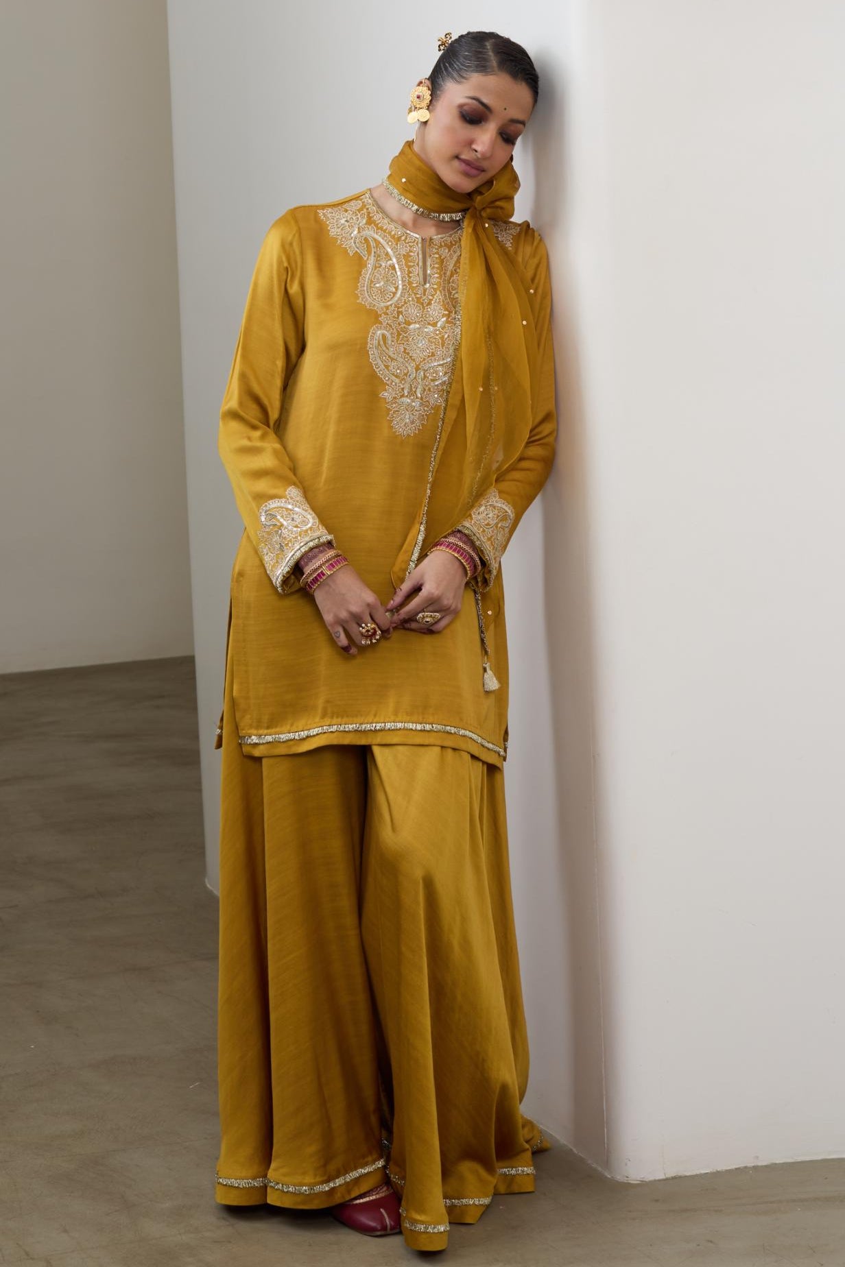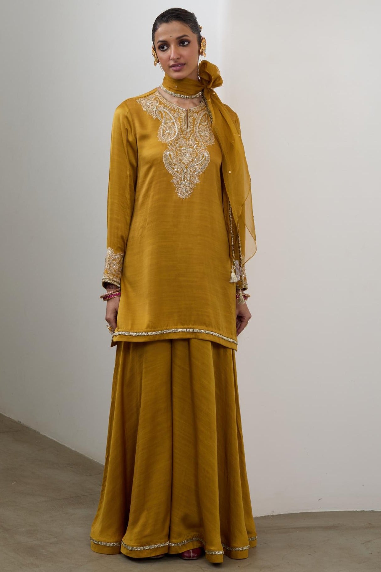 The Mustard pashmina silk embroidered sharara set by Sheela Suthar offers festive charm. This sharara set features detailed embroidery on luxurious pashmina silk. Crafted for comfort, the sharara set allows fluid movement. Its mustard tone elevates the sharara set for wedding functions. Ideal for celebrations, this sharara set enhances traditional dressing.