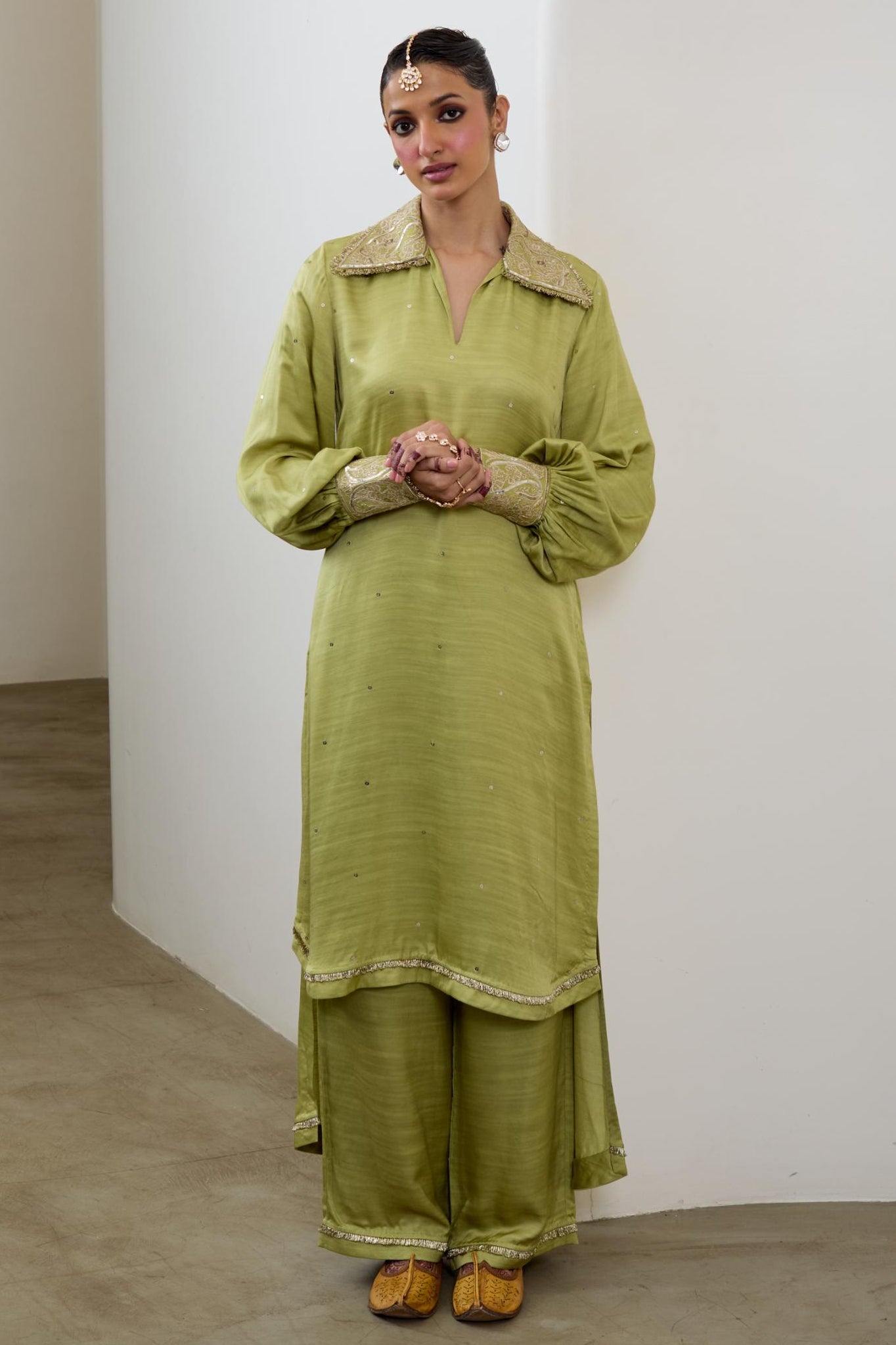 The Pista pashmina silk kurta set by Sheela Suthar reflects understated festive elegance. This kurta set features breathable pashmina silk for all-day comfort. Ideal for weddings, the kurta set offers ease and sophistication. Its pastel tone elevates the kurta set for daytime wear. This kurta set blends classic design with modern refinement.