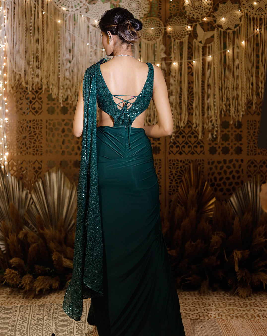 Experience timeless elegance with the shimmering green circle saree gown, crafted from a blend of Colorado and georgette fabrics. The rich green hue, enhanced by a dazzling array of sequins, creates a mesmerizing effect that catches the light beautifully. This saree features a sophisticated circle design, adding a modern twist to its classic allure. Perfect for any special occasion, it promises to make a stunning statement with its blend of luxury and sparkle.