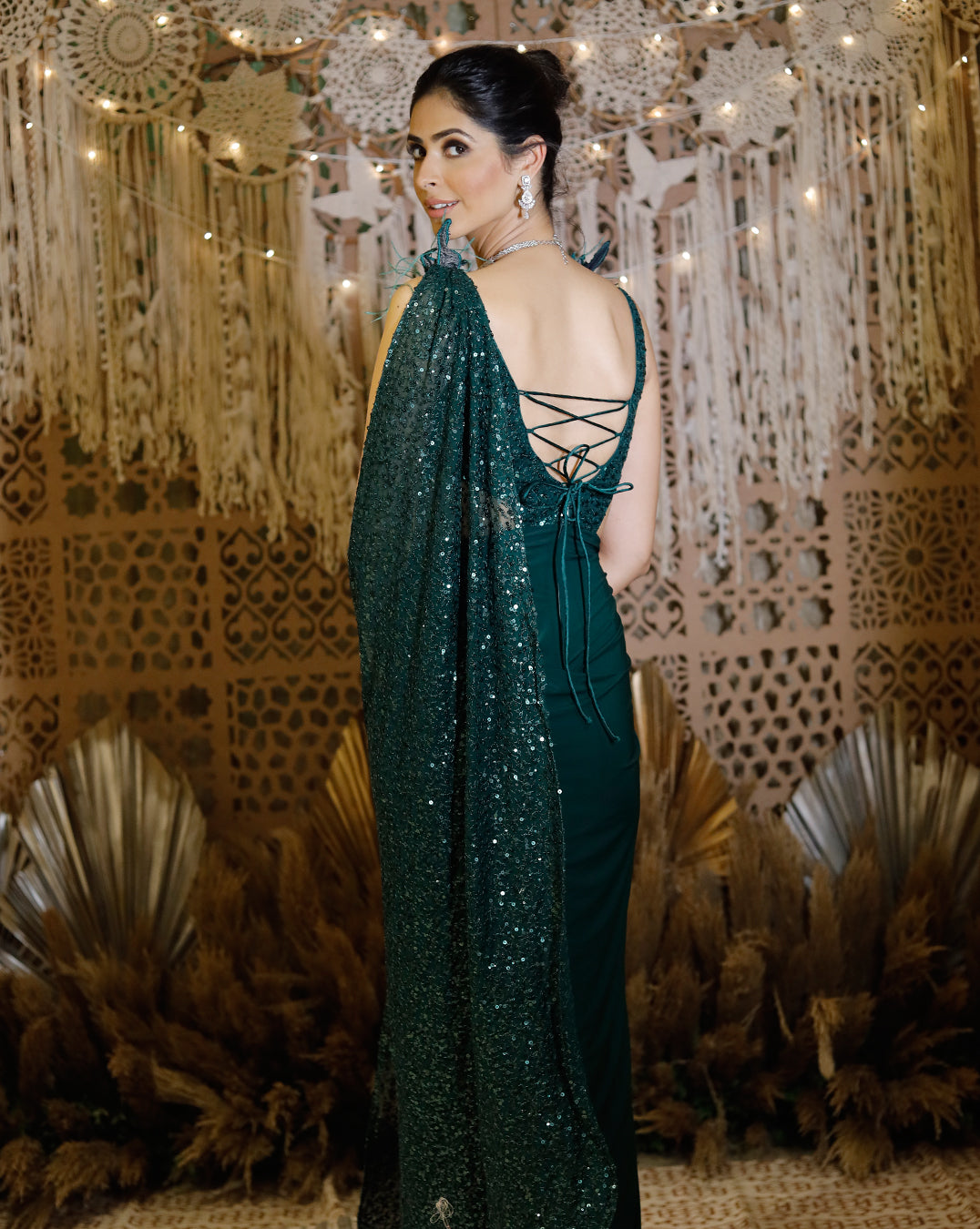 Embrace the enchanting allure of deep green with this stunning saree gown, where the shimmering sequences add a captivating sparkle. The saree, crafted from luxurious Colorado fabric and adorned with sequins, exudes elegance and sophistication. Adding to its allure, the embroidered 3D shoulder brooches on either side provide a striking and unique detail, making this outfit perfect for making a memorable impression at any special event.