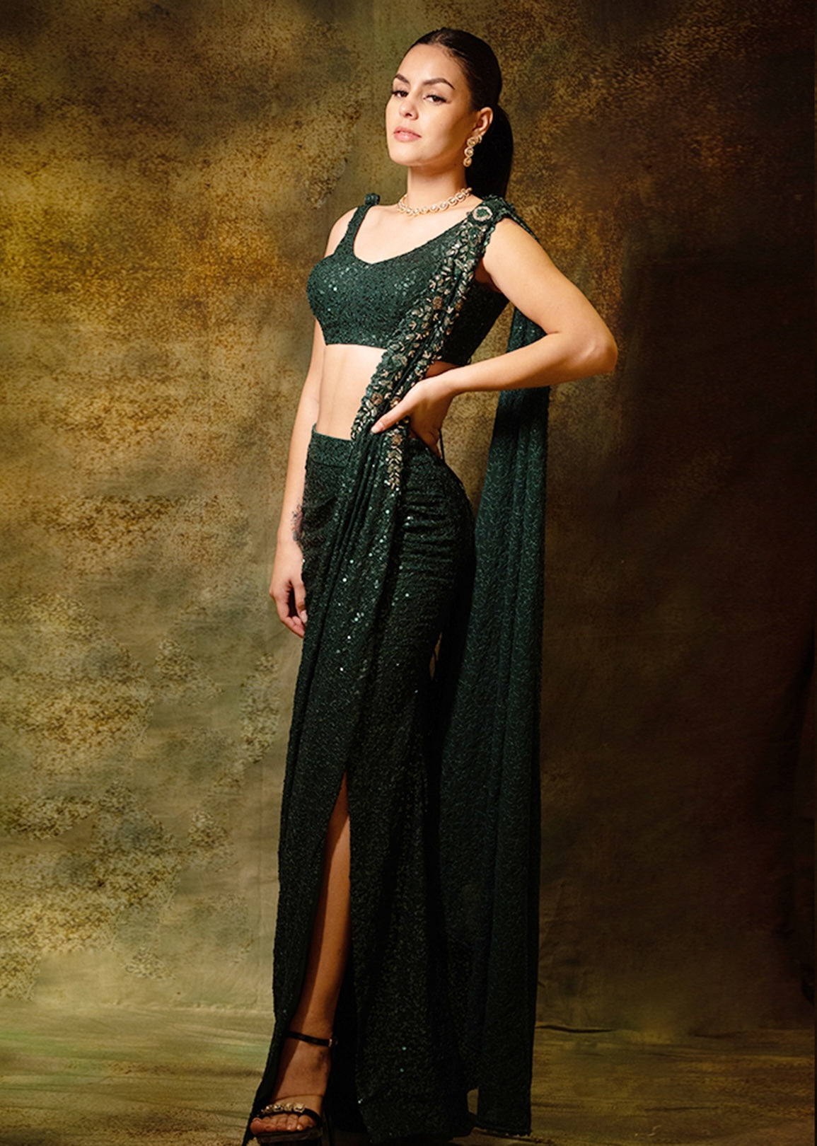 Discover elegance wrapped in the vibrant embrace of this stunning sari. Adorned with a striking array of green shades, it features intricate floral embroidery that sparkles with stones, sequins, and kardana beads. The exquisite detailing is complemented by a matching v-neck blouse, which echoes the sari’s embroidery, tying the ensemble together flawlessly. Perfect for those special occasions when you want to make a memorable impression.