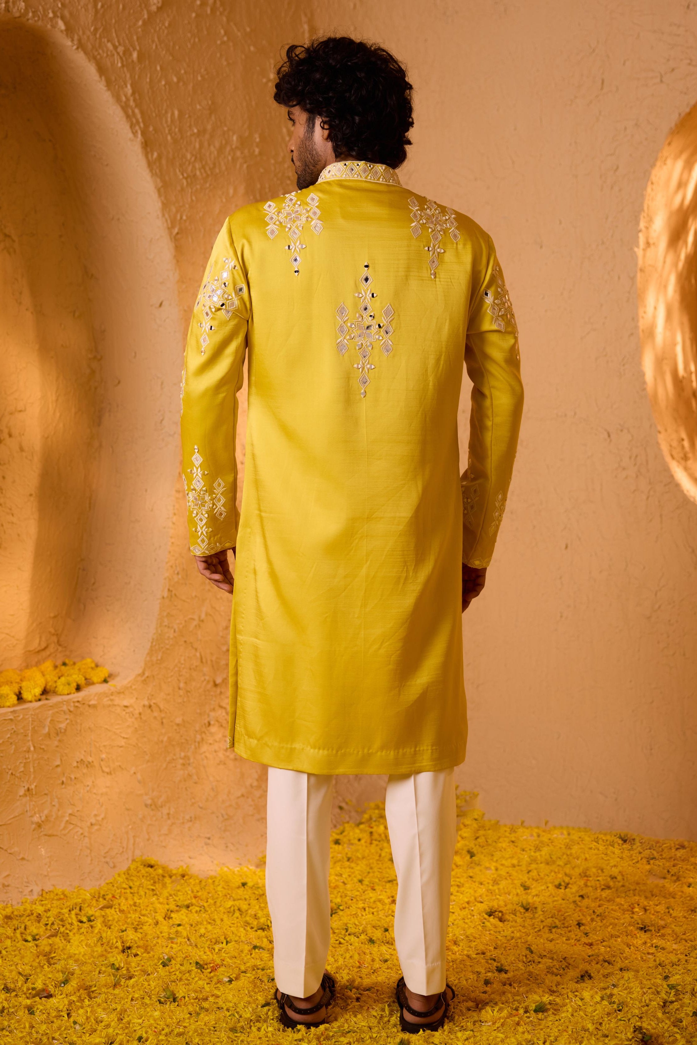The Yellow Suryansh kurta set is curated for vibrant wedding rituals and festive mornings. The bright yellow hue symbolizes celebration, making it perfect for haldi ceremonies and daytime functions. Designed for men who enjoy bold traditional colors, this kurta set brings joyful elegance.