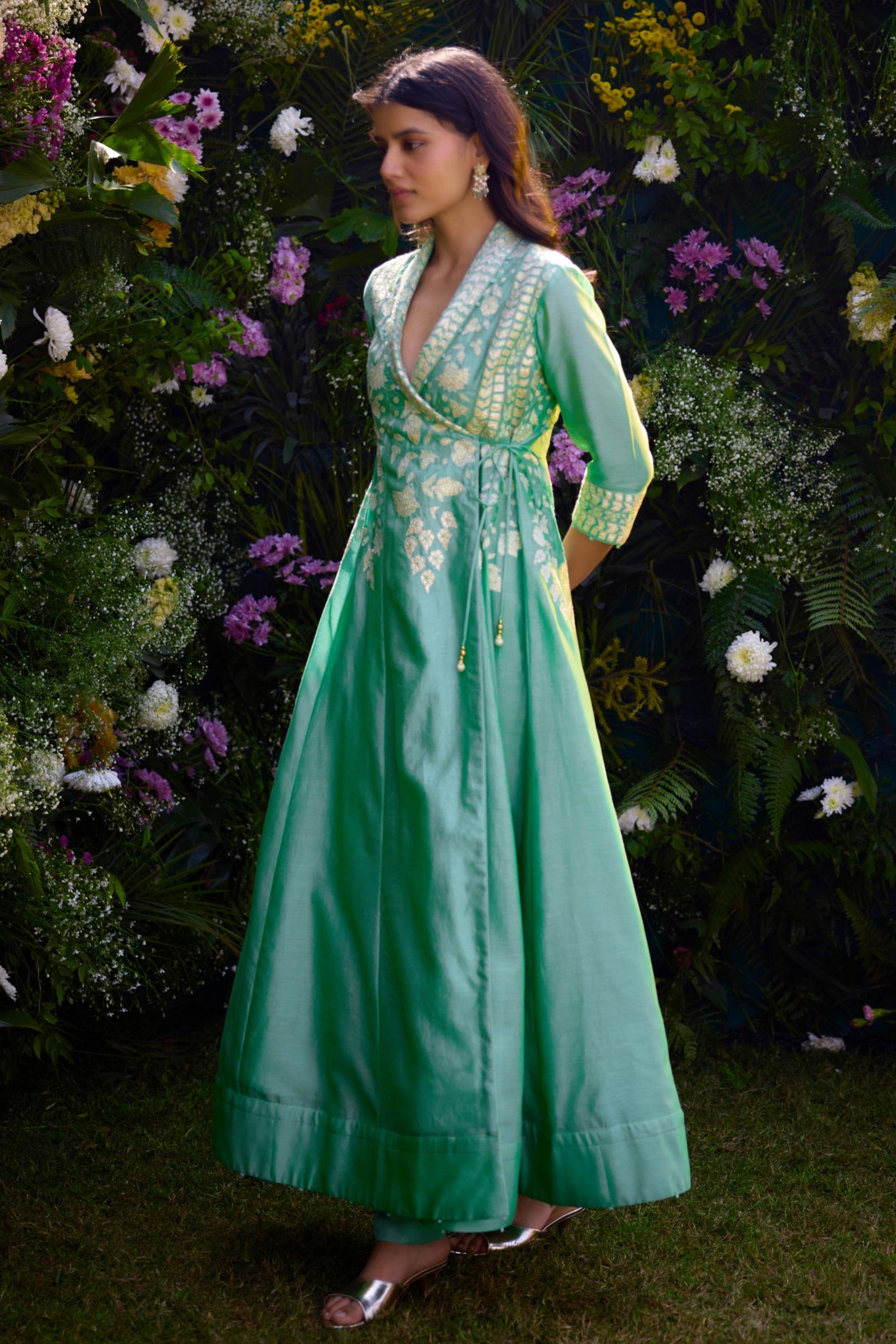 Embrace effortless style with this Bermuda green silk chanderi angrakha set paired with sleek trousers. The vibrant hue adds freshness, while the angrakha cut reflects traditional elegance. Perfect for festive brunches, cultural gatherings, or contemporary celebrations, this angrakha set offers comfort with sophistication. Designed for women who prefer modern silhouettes with ethnic undertones, it transitions seamlessly from day to evening wear.