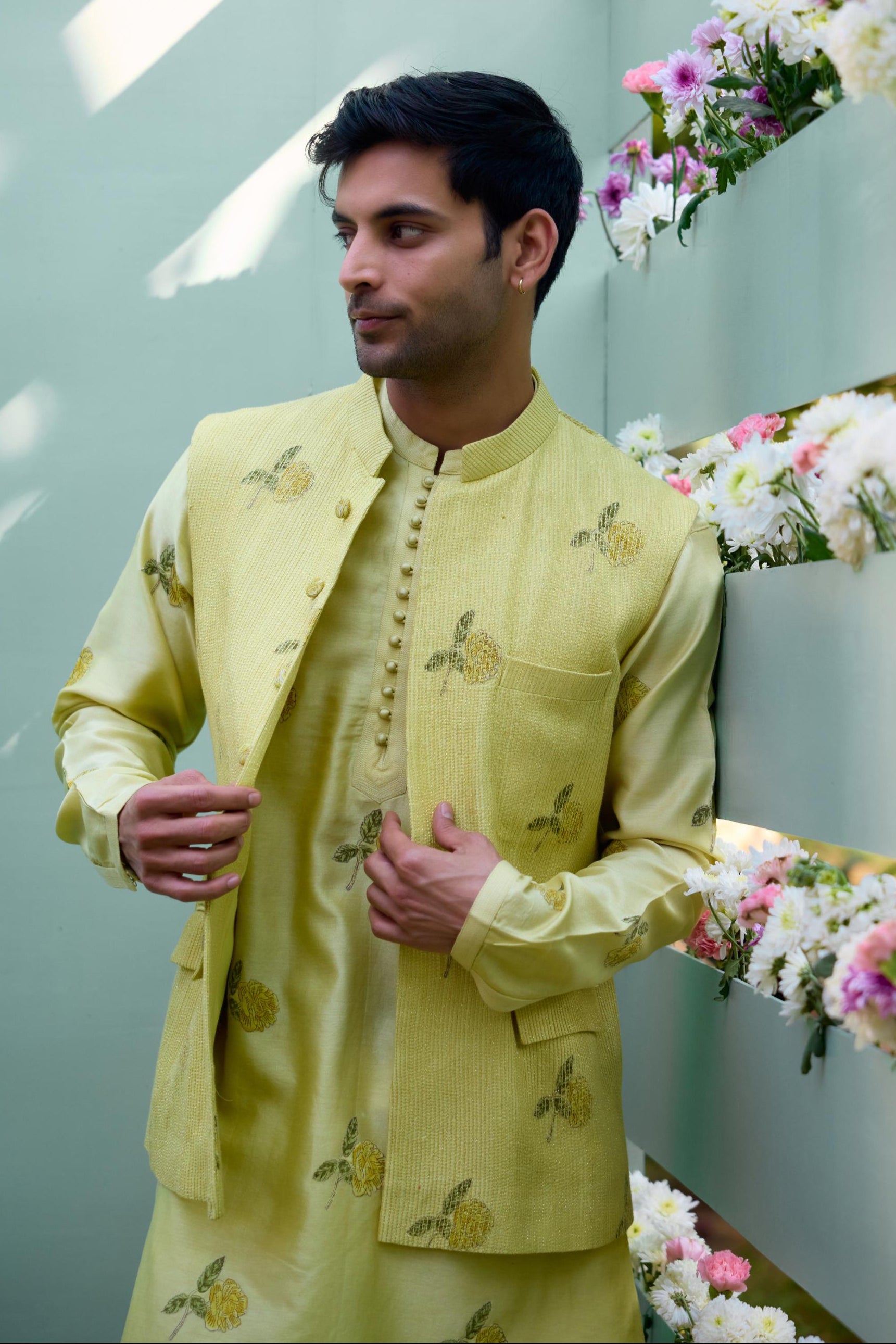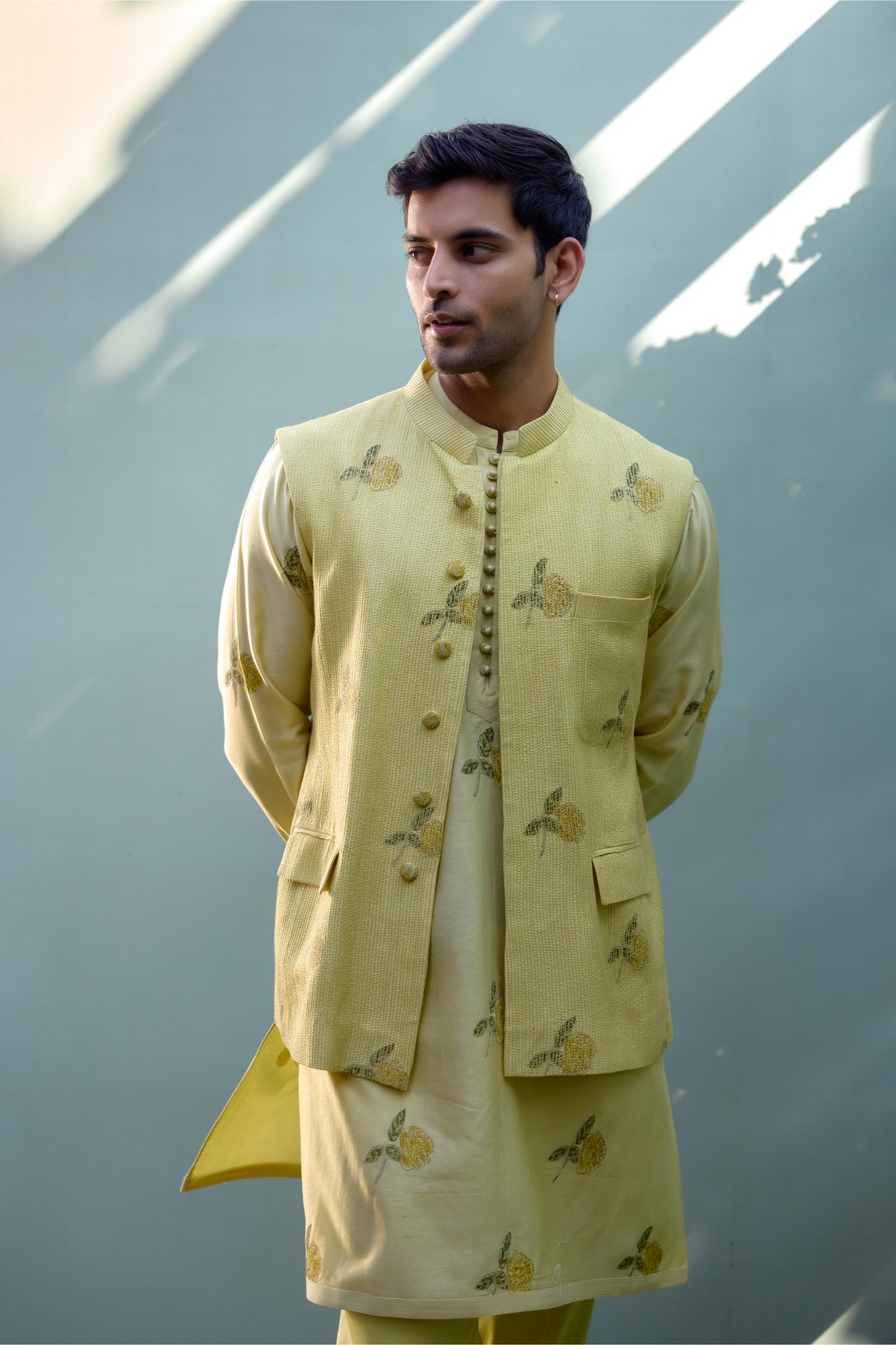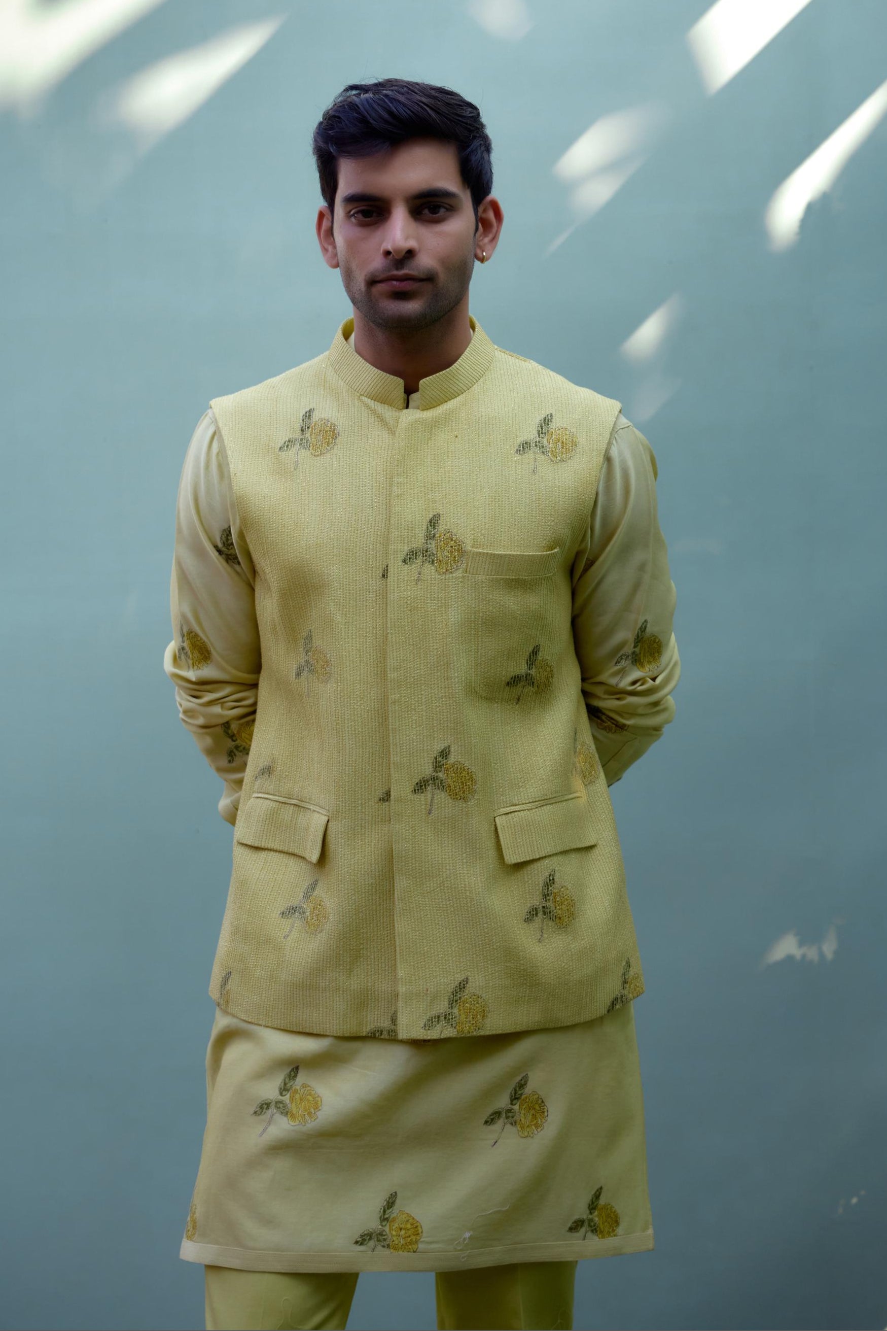 Canary yellow summer wedding chanderi waistcoat with printed kurta set