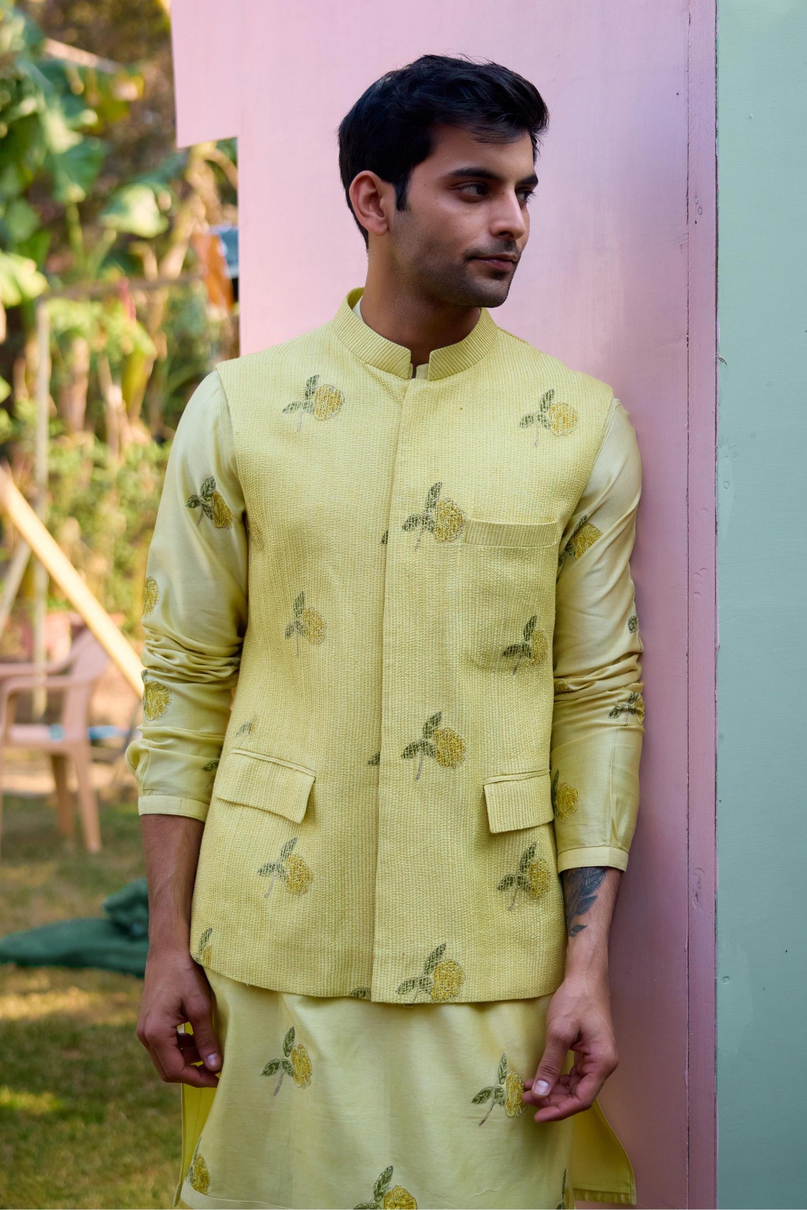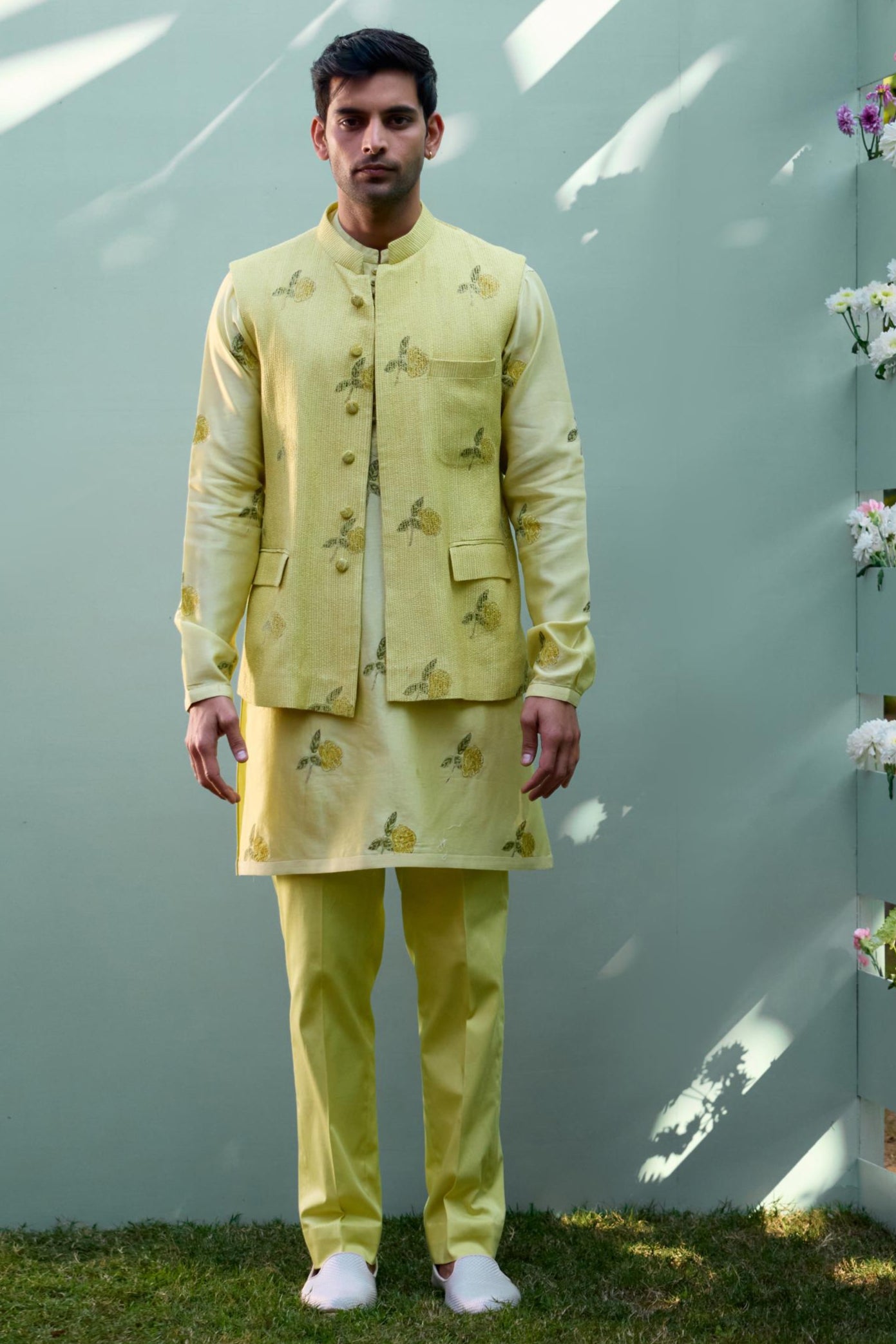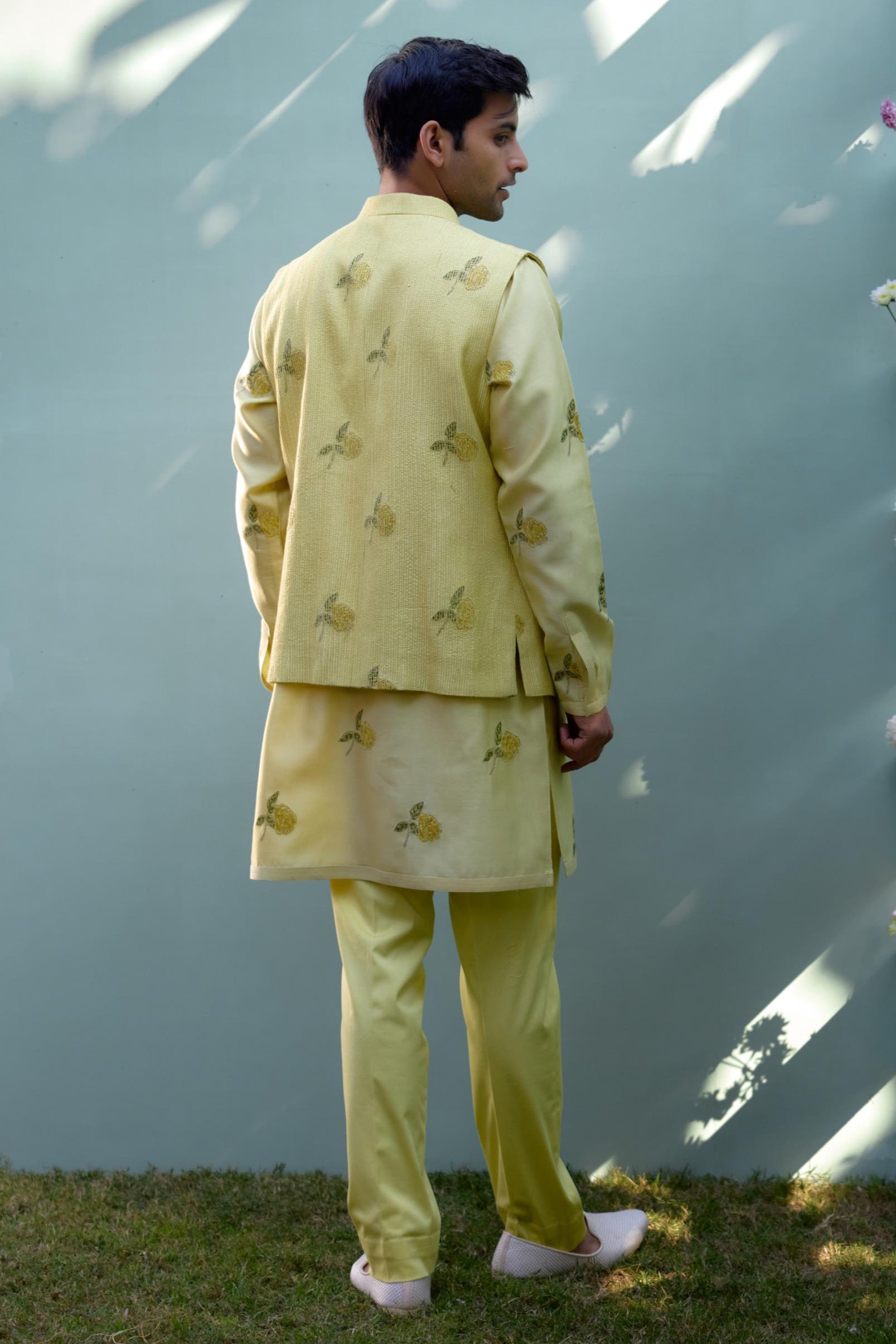 Canary yellow summer wedding chanderi waistcoat with printed kurta set