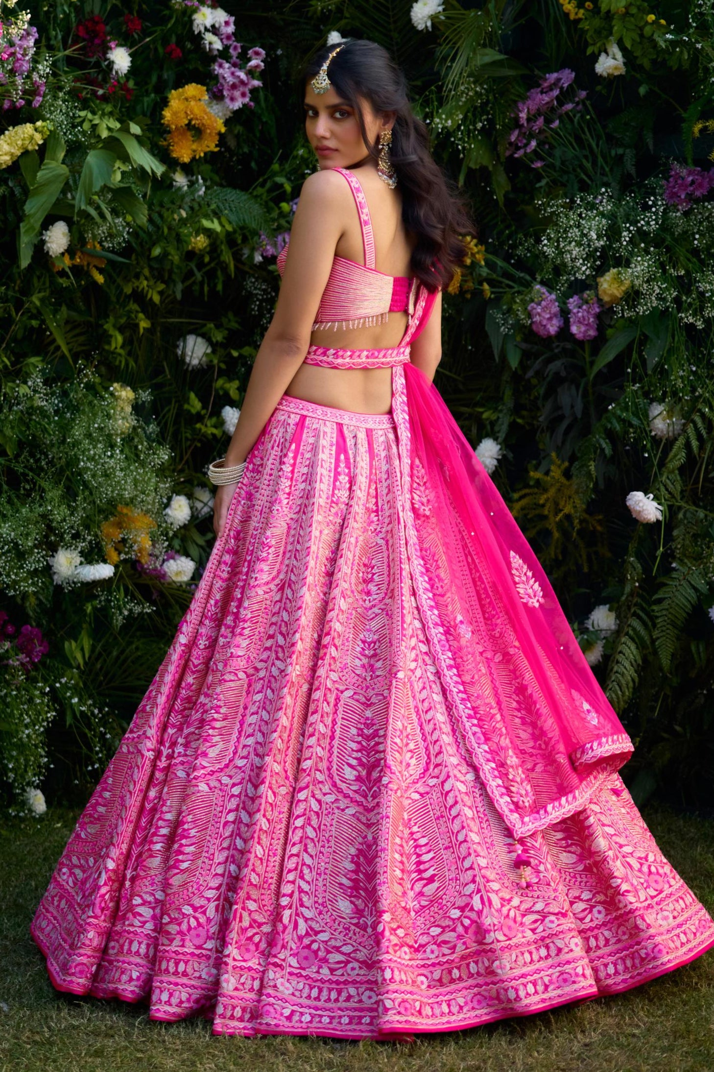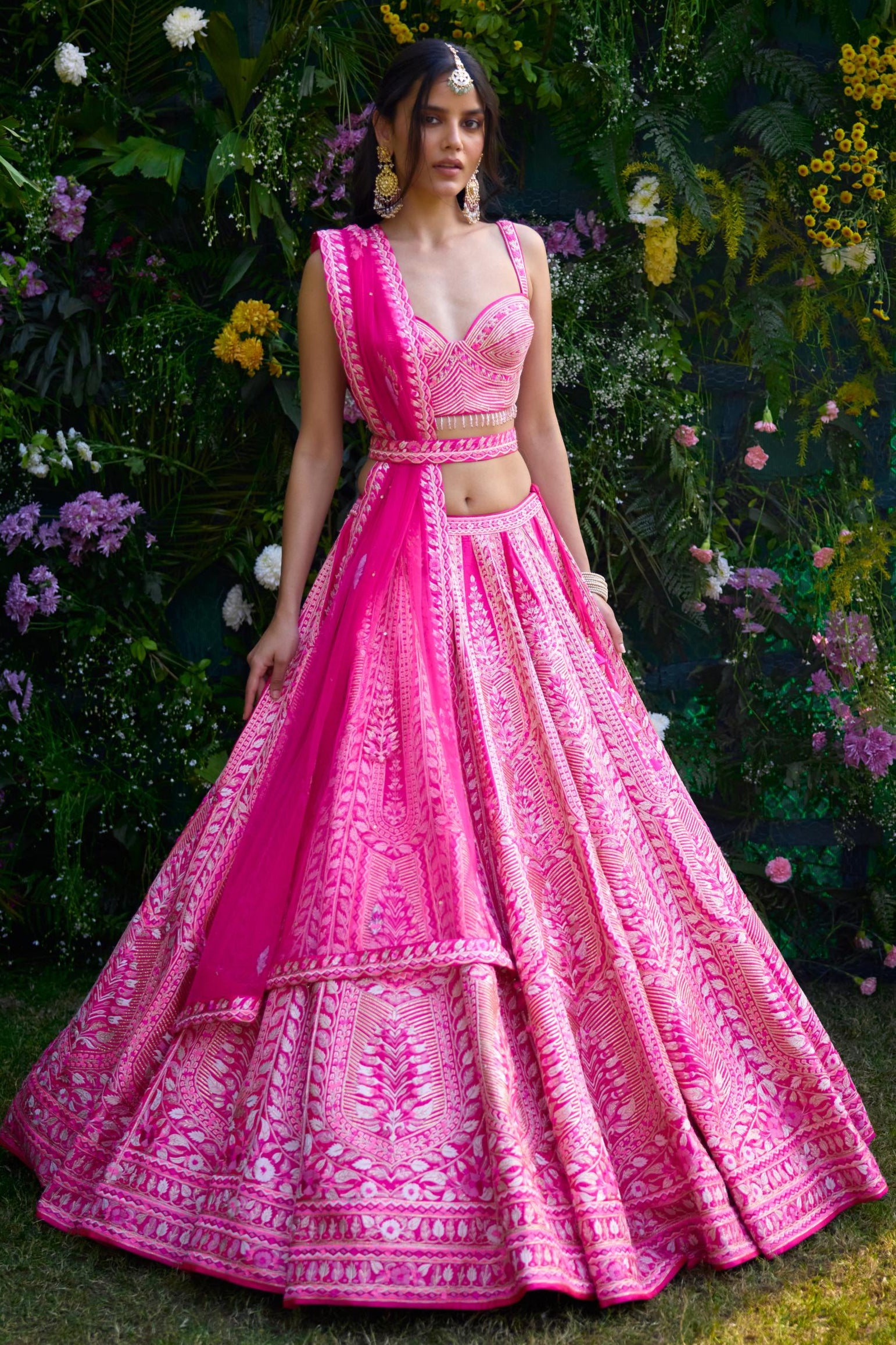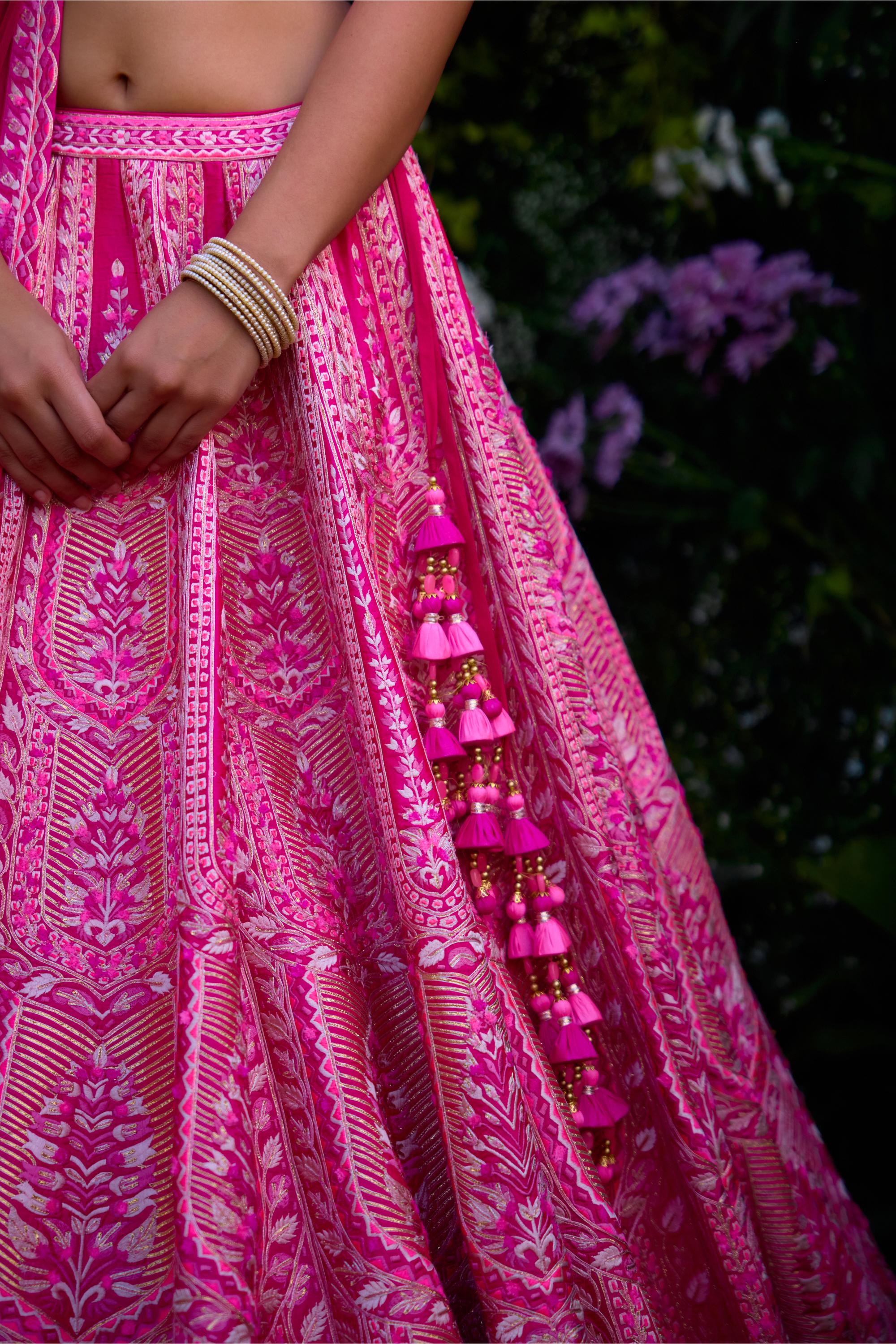 Celebrate festivities in this fuschia pink raw silk lehenga set featuring intricate gota embroidery. The vibrant pink hue ensures you stand out, while the detailed craftsmanship adds elegance and charm. Perfect for weddings, sangeet, or festive functions, this lehenga set offers both style and comfort, making it ideal for modern bridesmaids or guests seeking statement Indian ethnic wear.