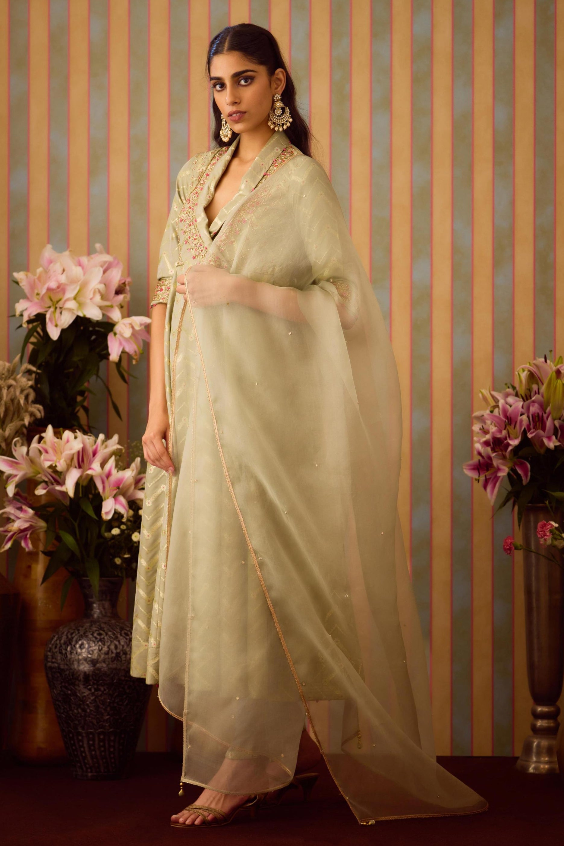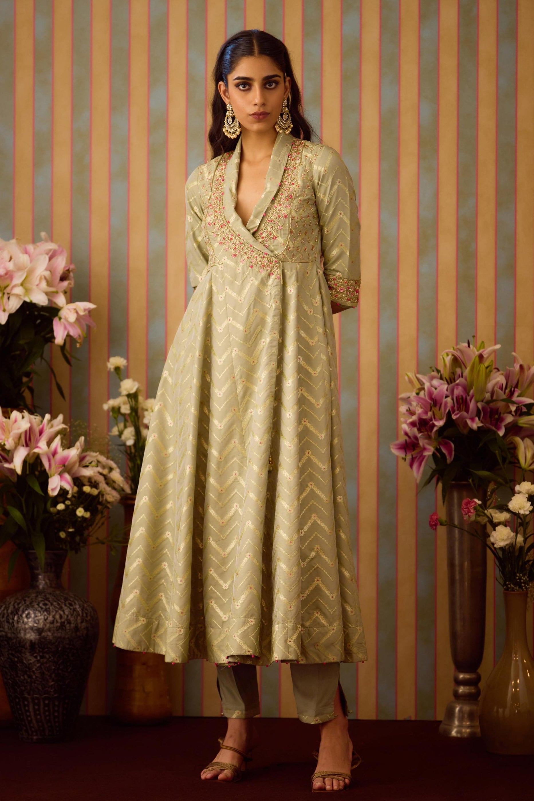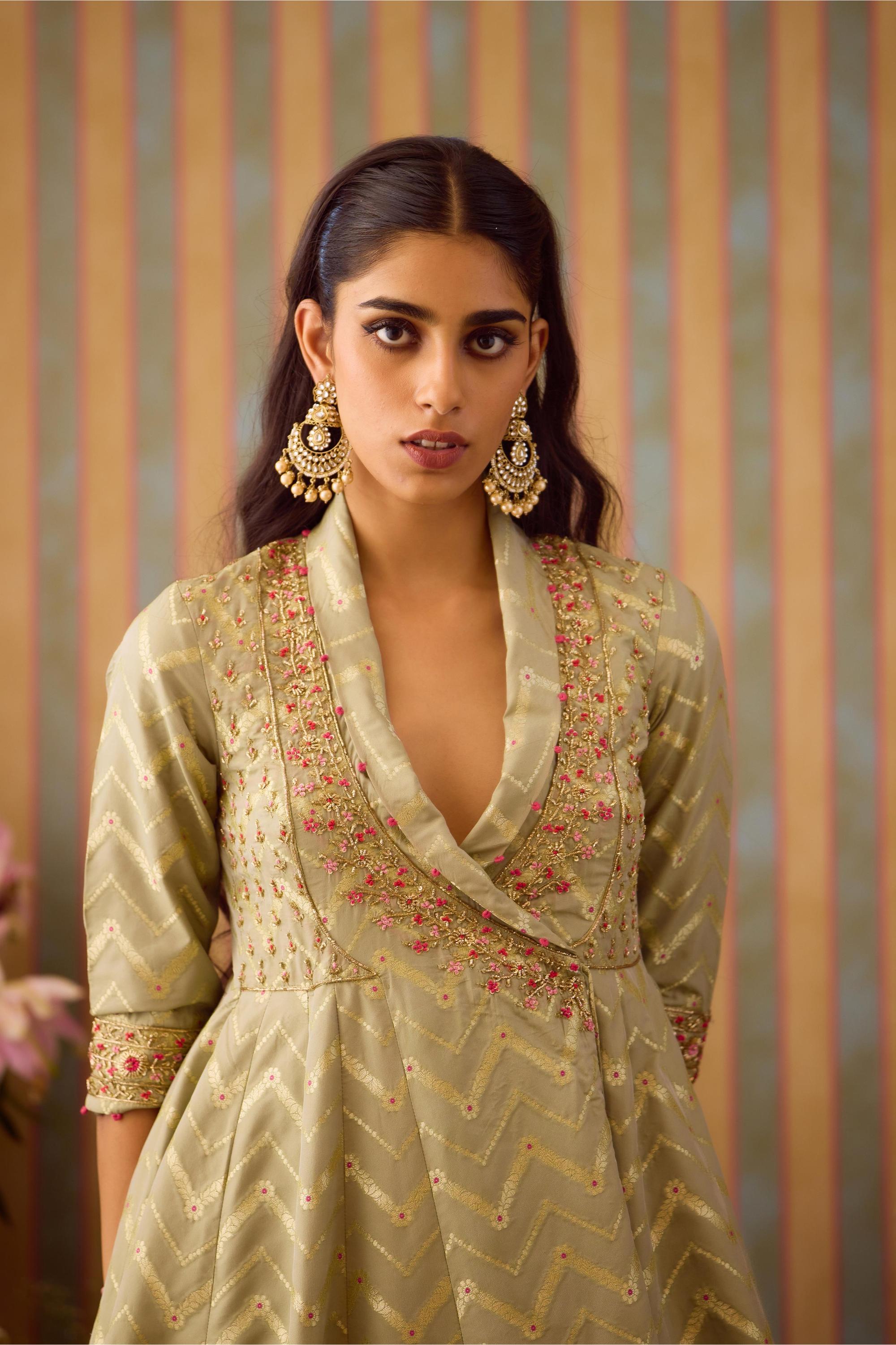 The green festive wedding angrakha set by Shyam Narayan Prasad captures the beauty of traditional silhouettes with a festive flair. The angrakha design is reimagined with modern embroidery and luxurious fabric, making this outfit suitable for celebratory gatherings. The fresh green tone adds vibrance, while the embroidery enhances its festive charm. This angrakha set features a structured yet flowing design that flatters different body types, making it versatile for women of all ages. Paired with a dupatta, the ensemble creates a complete look filled with heritage elegance. Ideal for festivals or wedding-related events, this angrakha set combines timeless tradition with modern sophistication, making it a beautiful addition to any festive wardrobe.