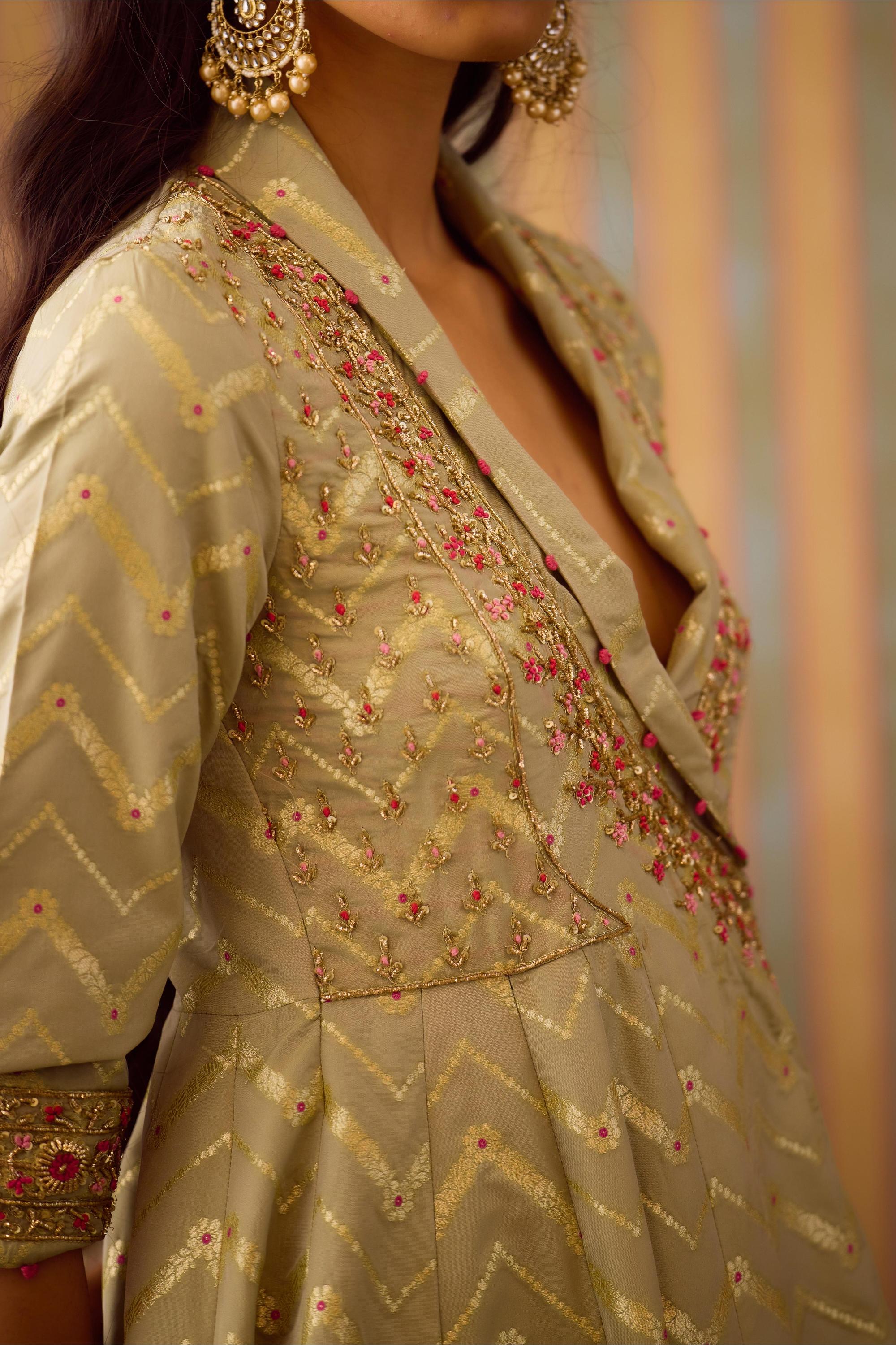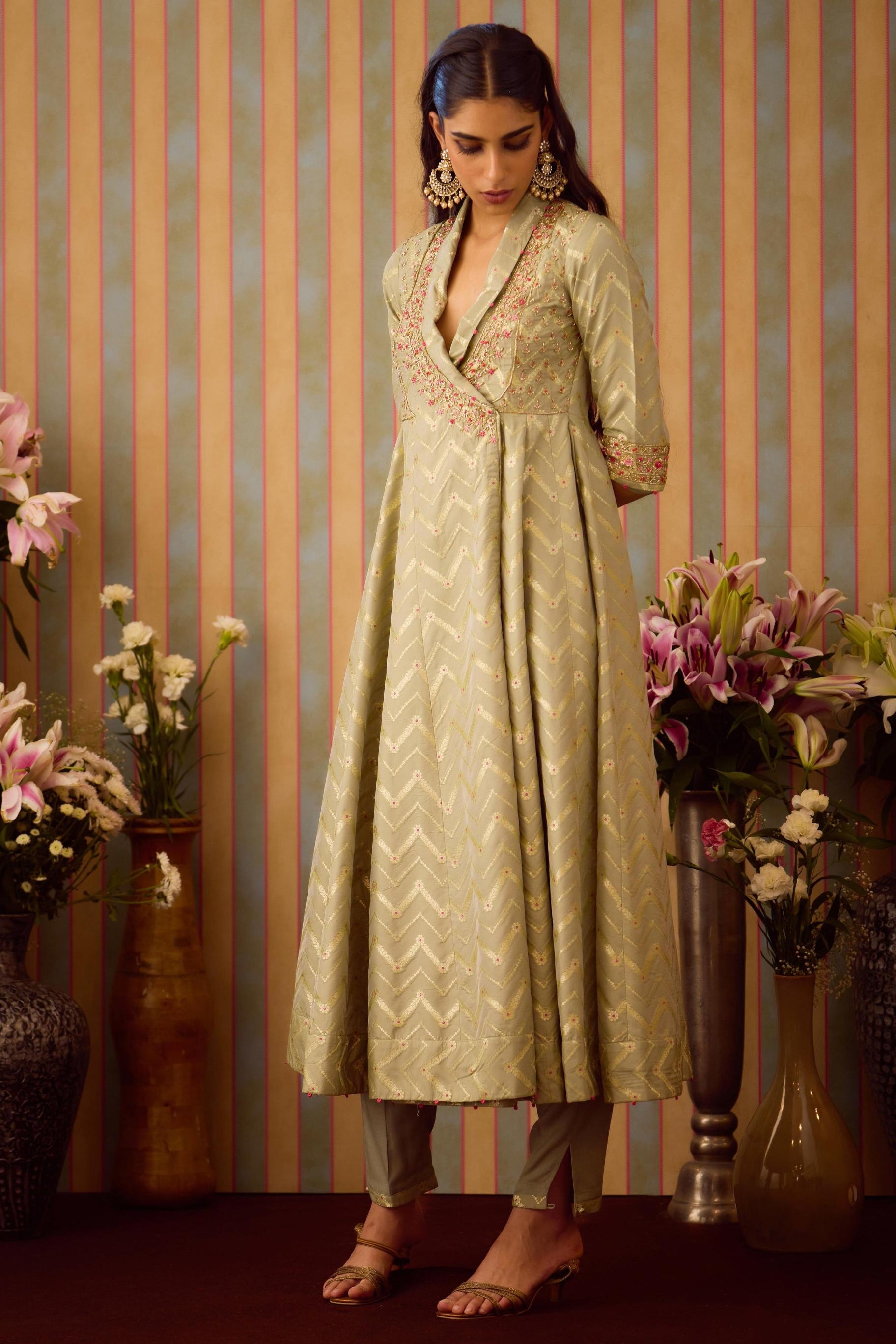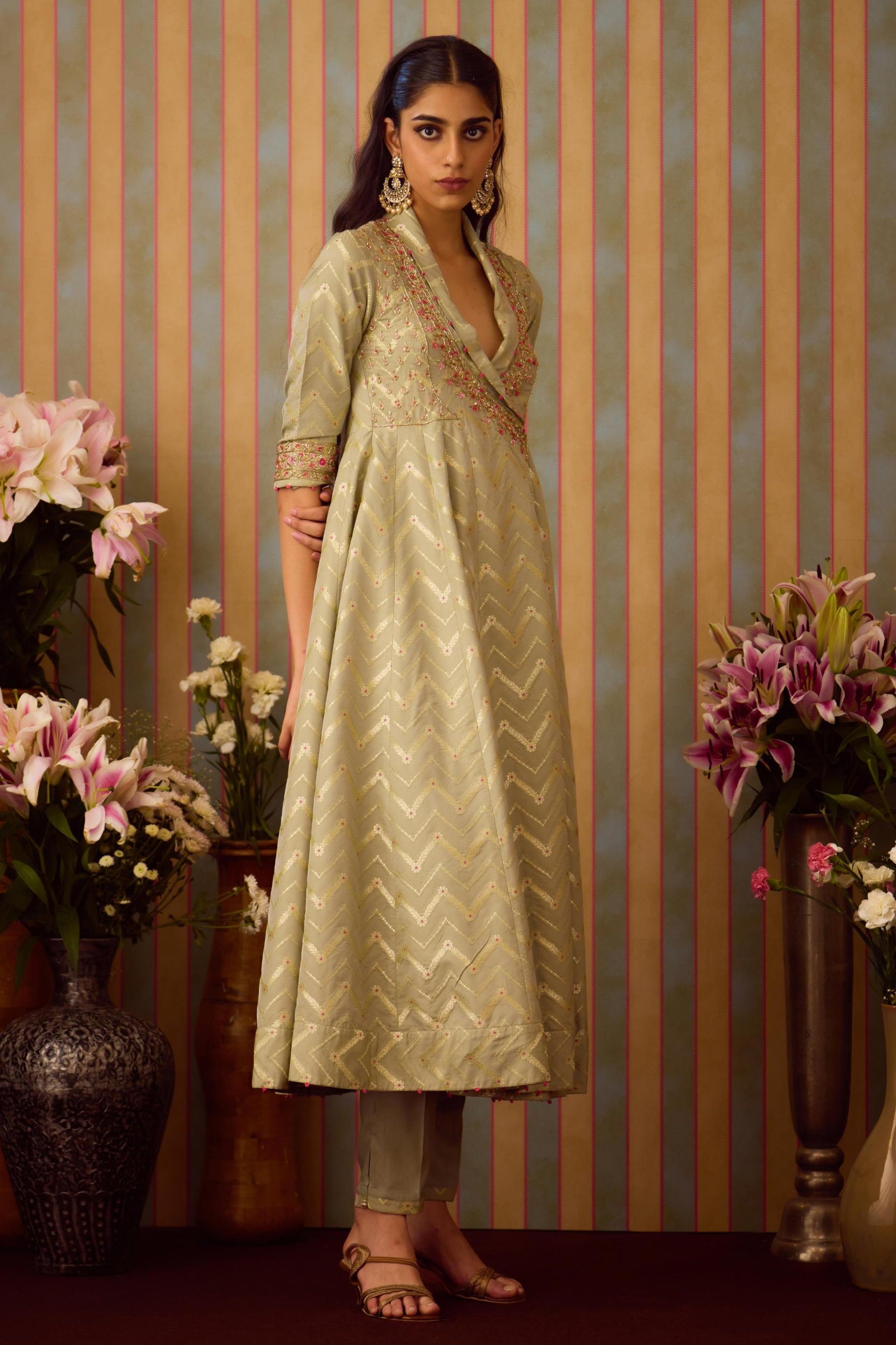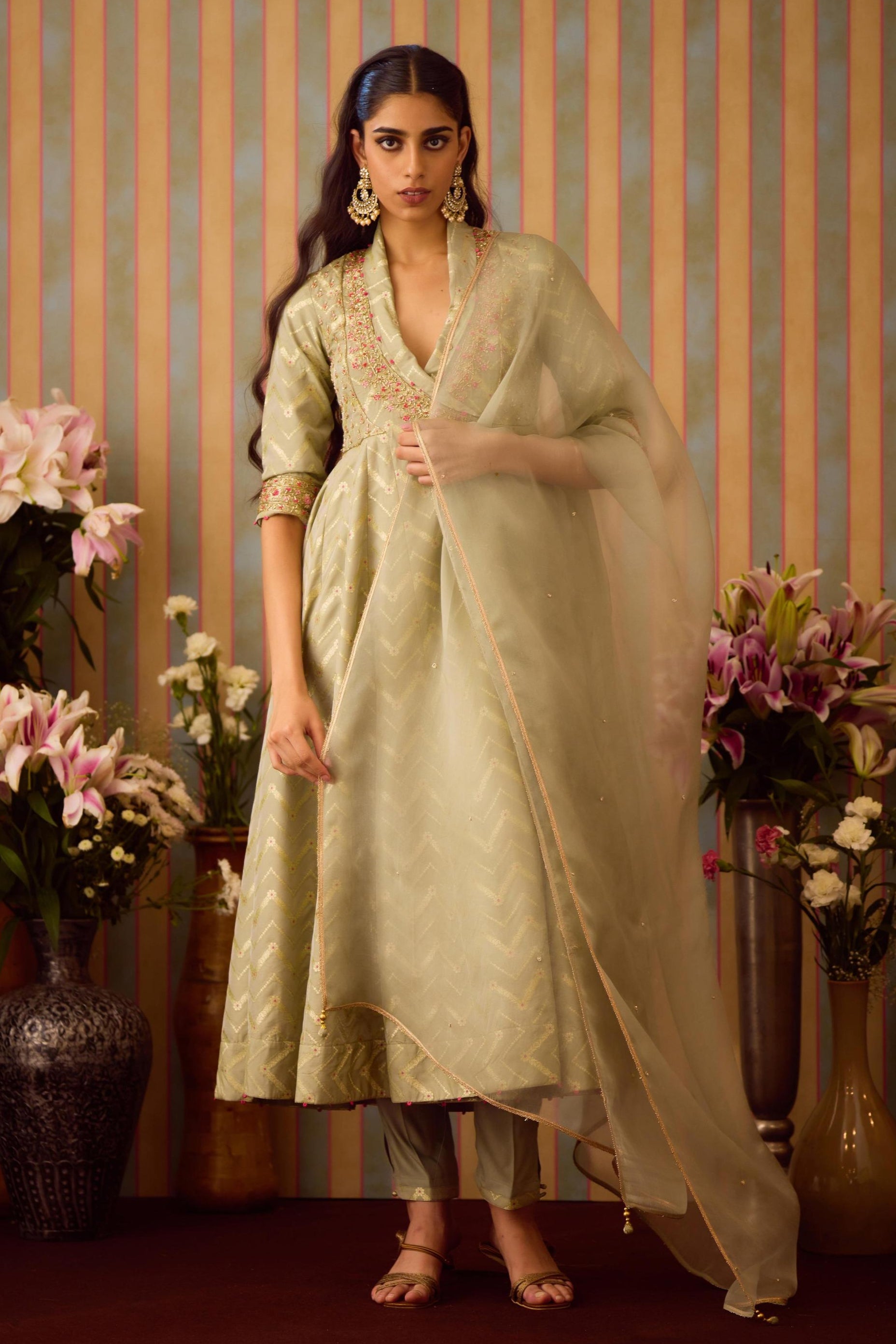 The green festive wedding angrakha set by Shyam Narayan Prasad captures the beauty of traditional silhouettes with a festive flair. The angrakha design is reimagined with modern embroidery and luxurious fabric, making this outfit suitable for celebratory gatherings. The fresh green tone adds vibrance, while the embroidery enhances its festive charm. This angrakha set features a structured yet flowing design that flatters different body types, making it versatile for women of all ages. Paired with a dupatta, the ensemble creates a complete look filled with heritage elegance. Ideal for festivals or wedding-related events, this angrakha set combines timeless tradition with modern sophistication, making it a beautiful addition to any festive wardrobe.