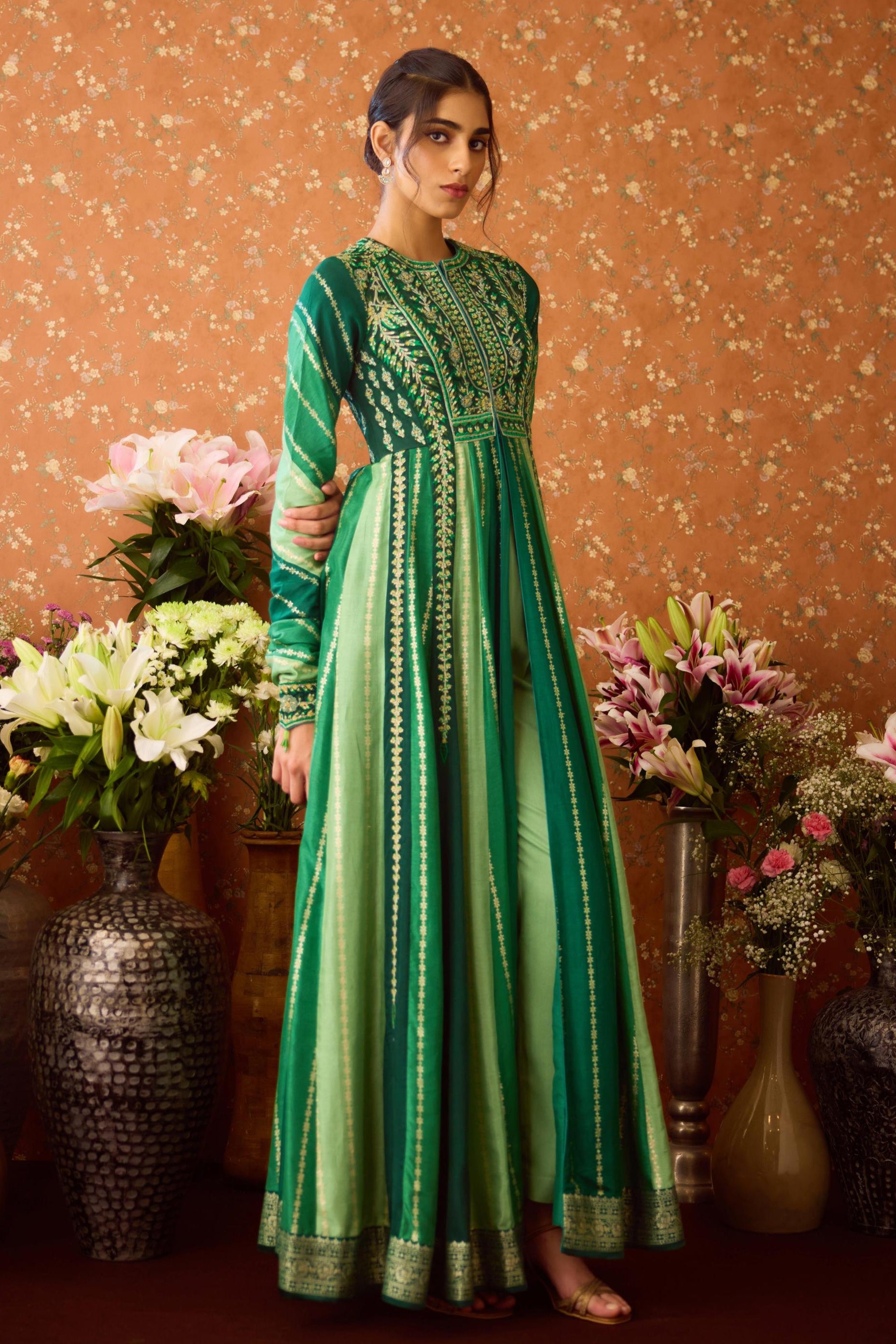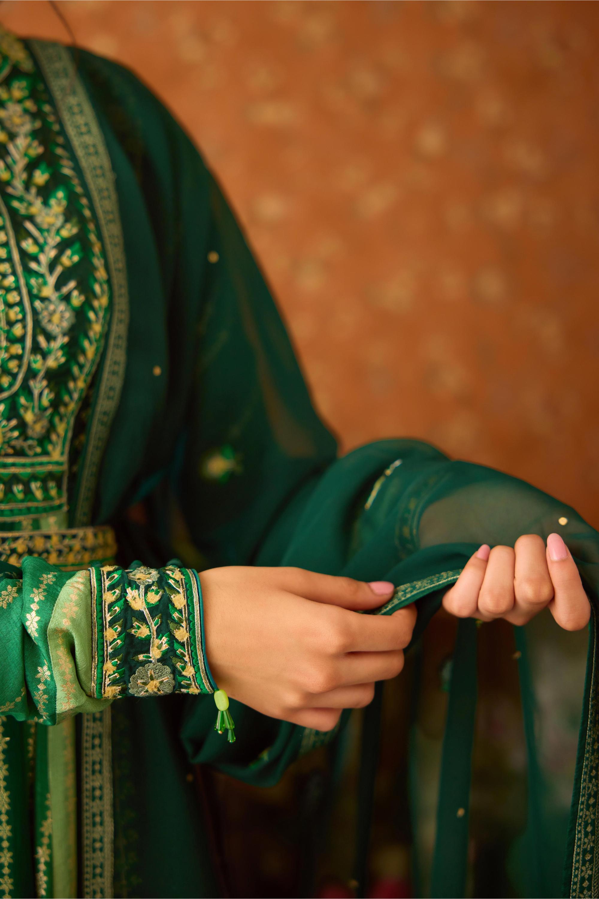 Celebrate your Mehendi with Shyam Narayan Prasad’s green festive wedding embroidered anarkali set, a creation that beautifully fuses traditional artistry with modern sophistication. The anarkali set is crafted in a refreshing green tone, highlighted with intricate embroidery that showcases the designer’s attention to detail. Perfect for festive occasions, this anarkali set exudes charm, grace, and effortless elegance, making it a standout piece in any wedding trousseau. The silhouette of the anarkali set is designed to flatter every body type, flowing seamlessly to create a regal yet comfortable look. Its embroidery work adds depth and texture, reflecting centuries-old craftsmanship refined for the contemporary bride or wedding guest. Whether styled with minimal jewelry for a modern vibe or adorned with statement pieces for a traditional touch, this anarkali set transitions effortlessly from day to evening functions. The lightweight yet rich fabric ensures ease of movement, making it ideal for Mehendi rituals where celebration and dancing are at their peak. Shyam Narayan Prasad’s vision shines through in this anarkali set, offering not just a festive outfit but an heirloom-worthy ensemble. The harmony of vibrant green with delicate detailing symbolizes new beginnings, making it a meaningful choice for weddings and special occasions. Add this anarkali set to your festive wardrobe for a perfect balance of heritage, luxury, and contemporary appeal.