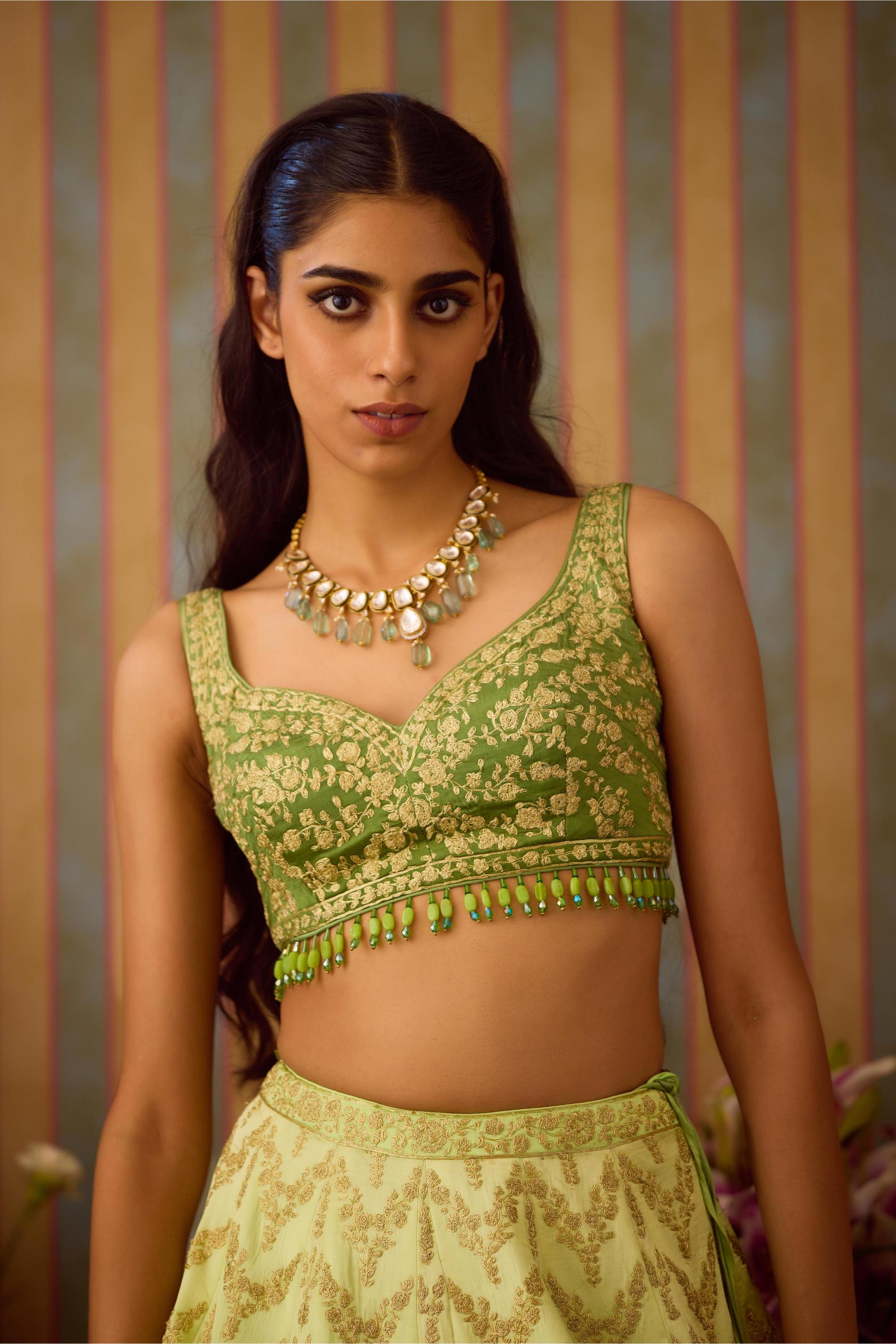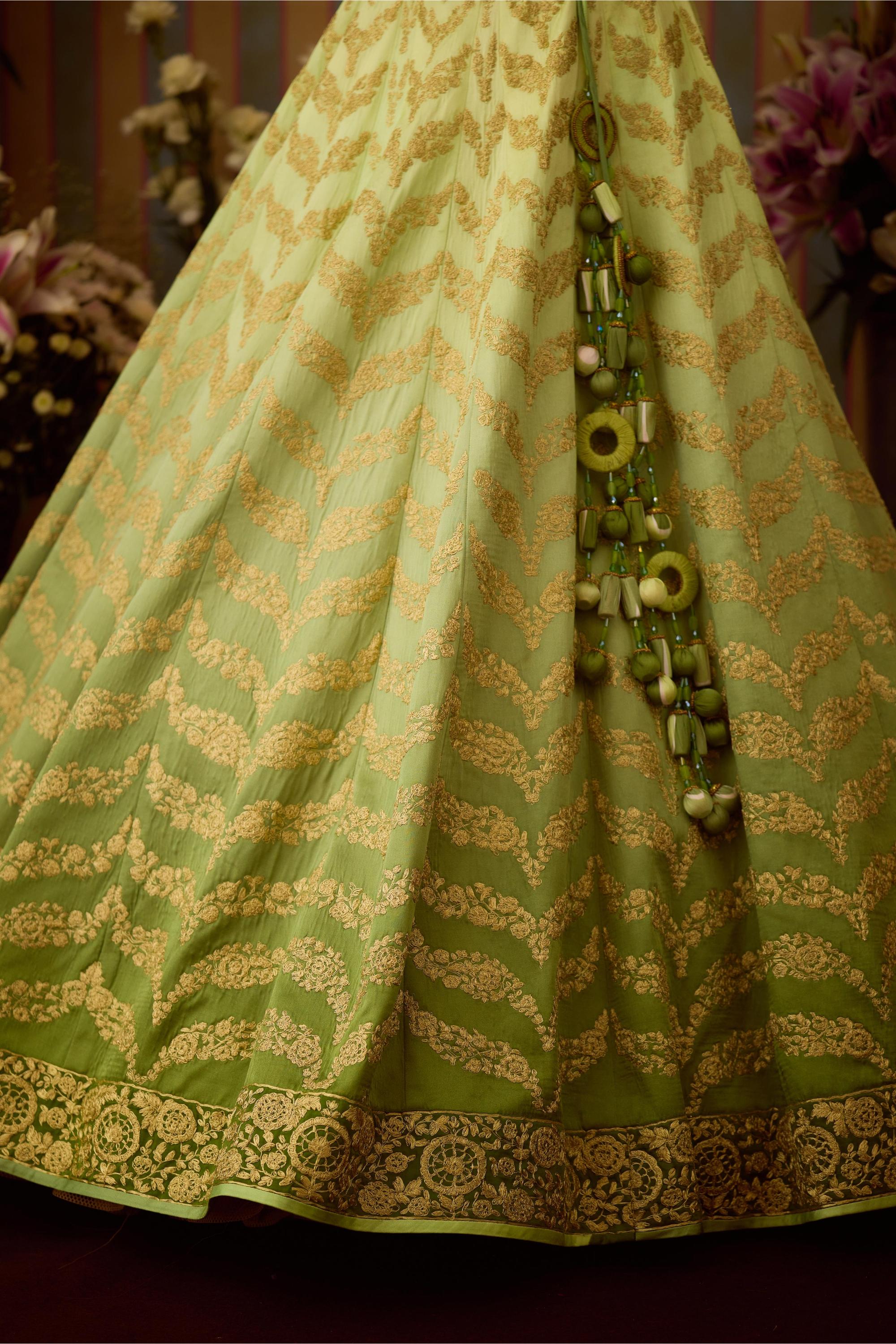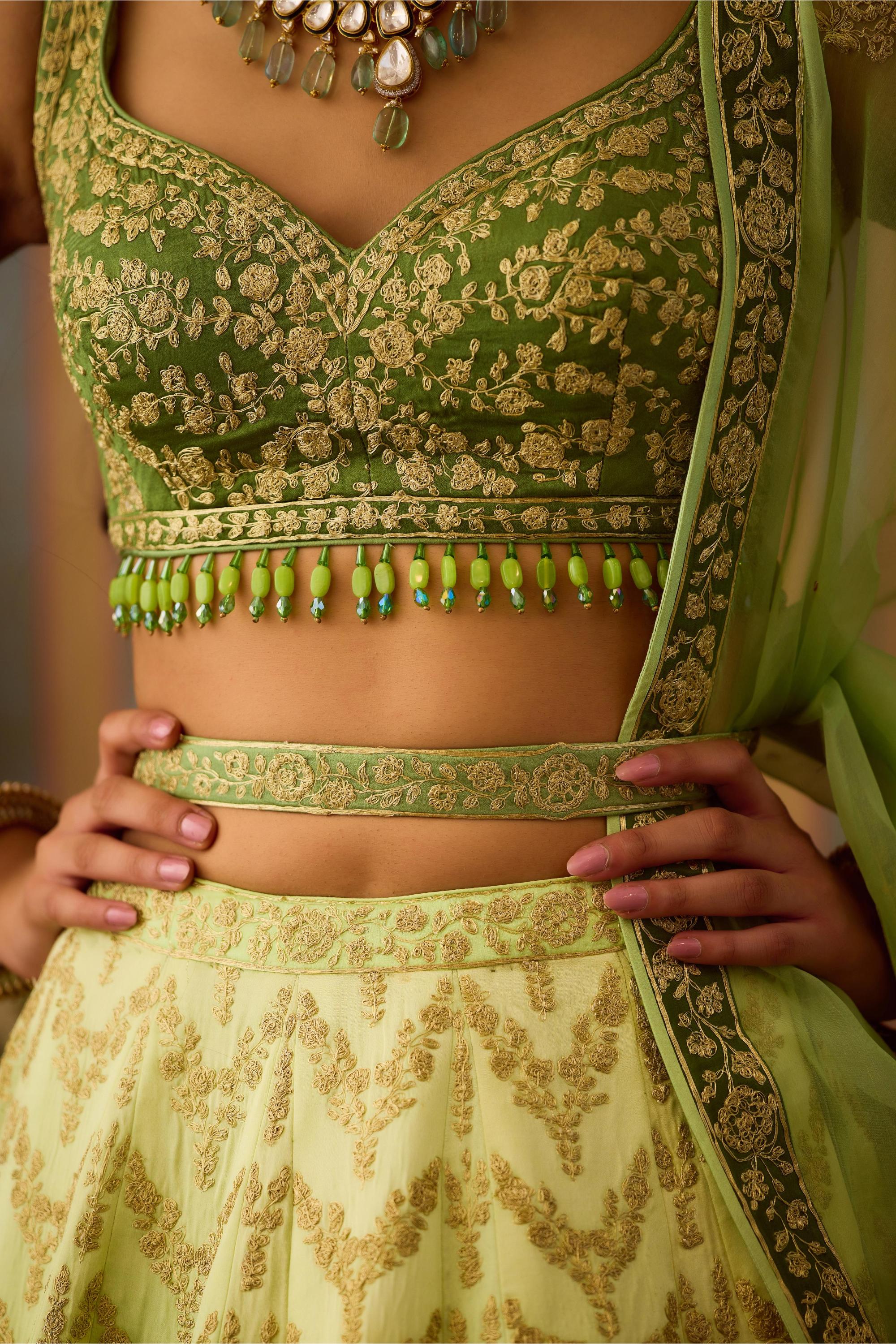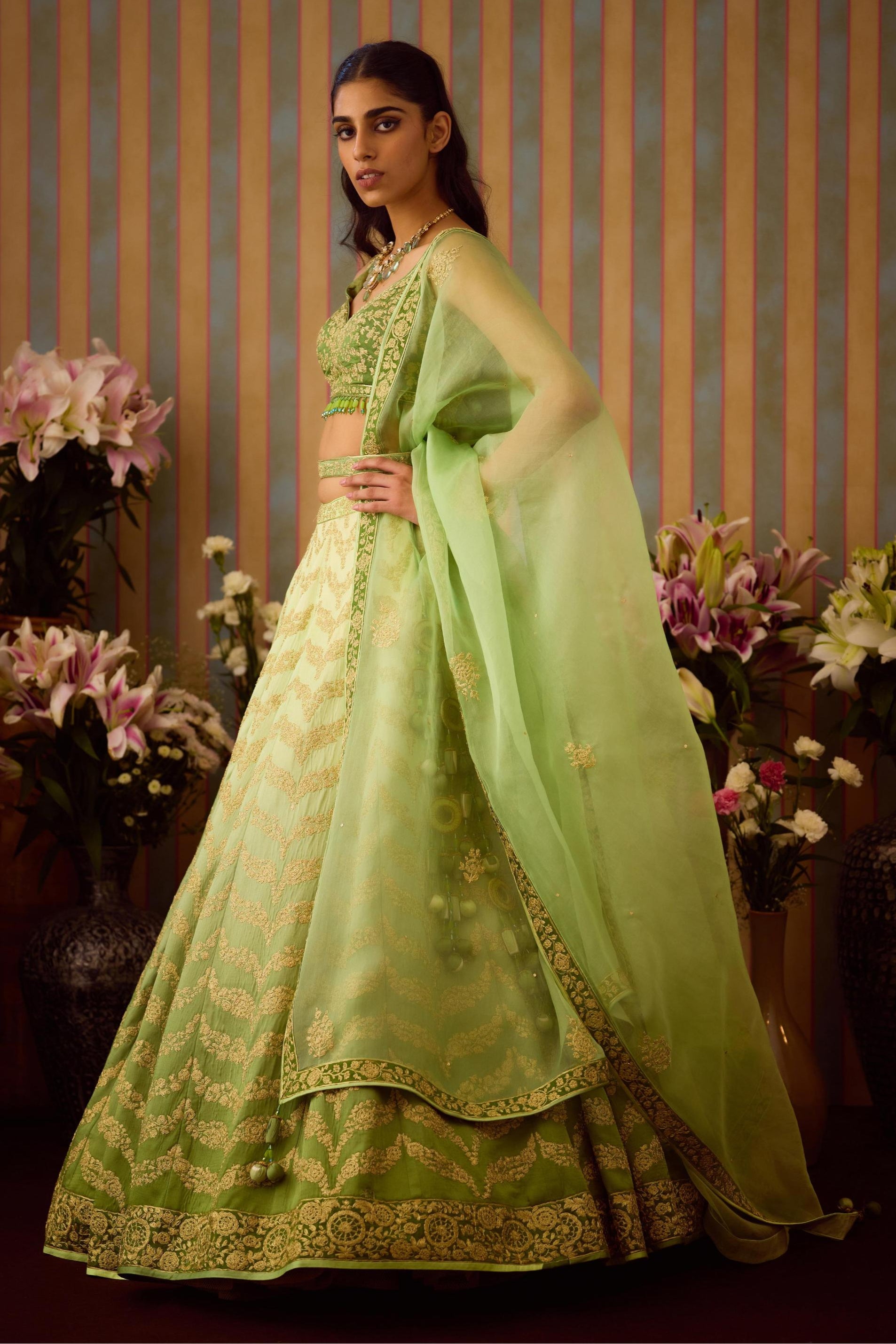 The green festive wedding embroidered lehenga set by Shyam Narayan Prasad is designed to embody the spirit of Mehendi ceremonies. This lehenga set combines rich cultural embroidery with a festive color palette, making it both traditional and refreshing. The lehenga skirt flares gracefully, offering comfort while maintaining its grandeur. Paired with an embroidered blouse and a matching dupatta, this lehenga set creates a cohesive and elegant look. The embroidery highlights detailed craftsmanship, which Shyam Narayan Prasad is celebrated for, ensuring that the outfit radiates festive charm. This lehenga set is perfect for Mehendi because of its lively green tone, which reflects joy and prosperity. The shade photographs beautifully, especially in outdoor daytime ceremonies, capturing the essence of vibrant celebrations. Designed with both elegance and functionality in mind, this lehenga set allows freedom of movement, ideal for dancing and festivities. Styling options with this lehenga set are diverse. Floral jewelry enhances its fresh appeal, while gold or kundan accessories add a regal touch. Its lightweight design ensures that it remains comfortable for long hours without compromising on beauty. What makes this lehenga set special is its ability to blend tradition with contemporary style. Shyam Narayan Prasad’s mastery in embroidery elevates the outfit into a timeless ensemble. Perfect for brides-to-be or family members, this lehenga set brings festive vibrance while maintaining grace and sophistication.