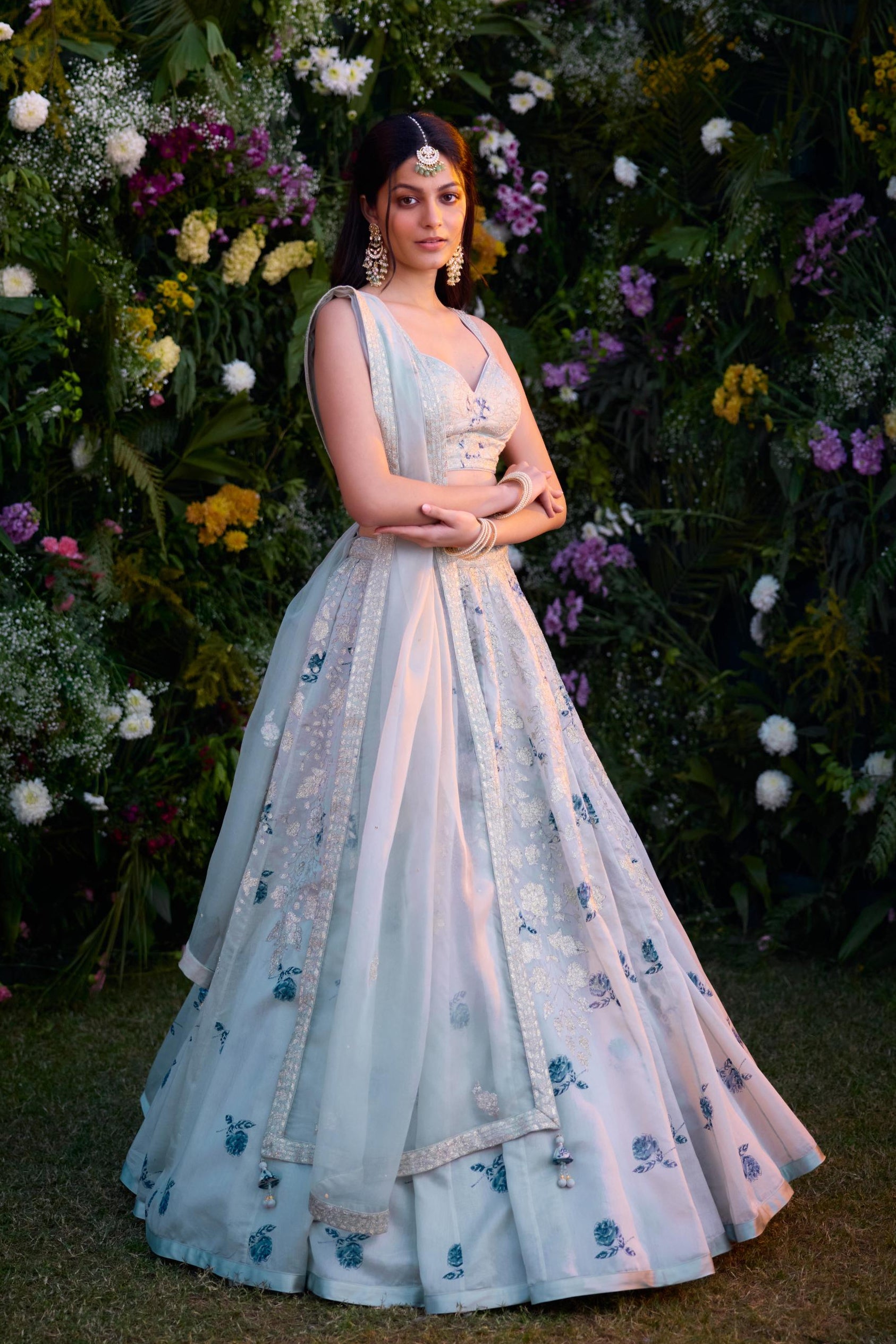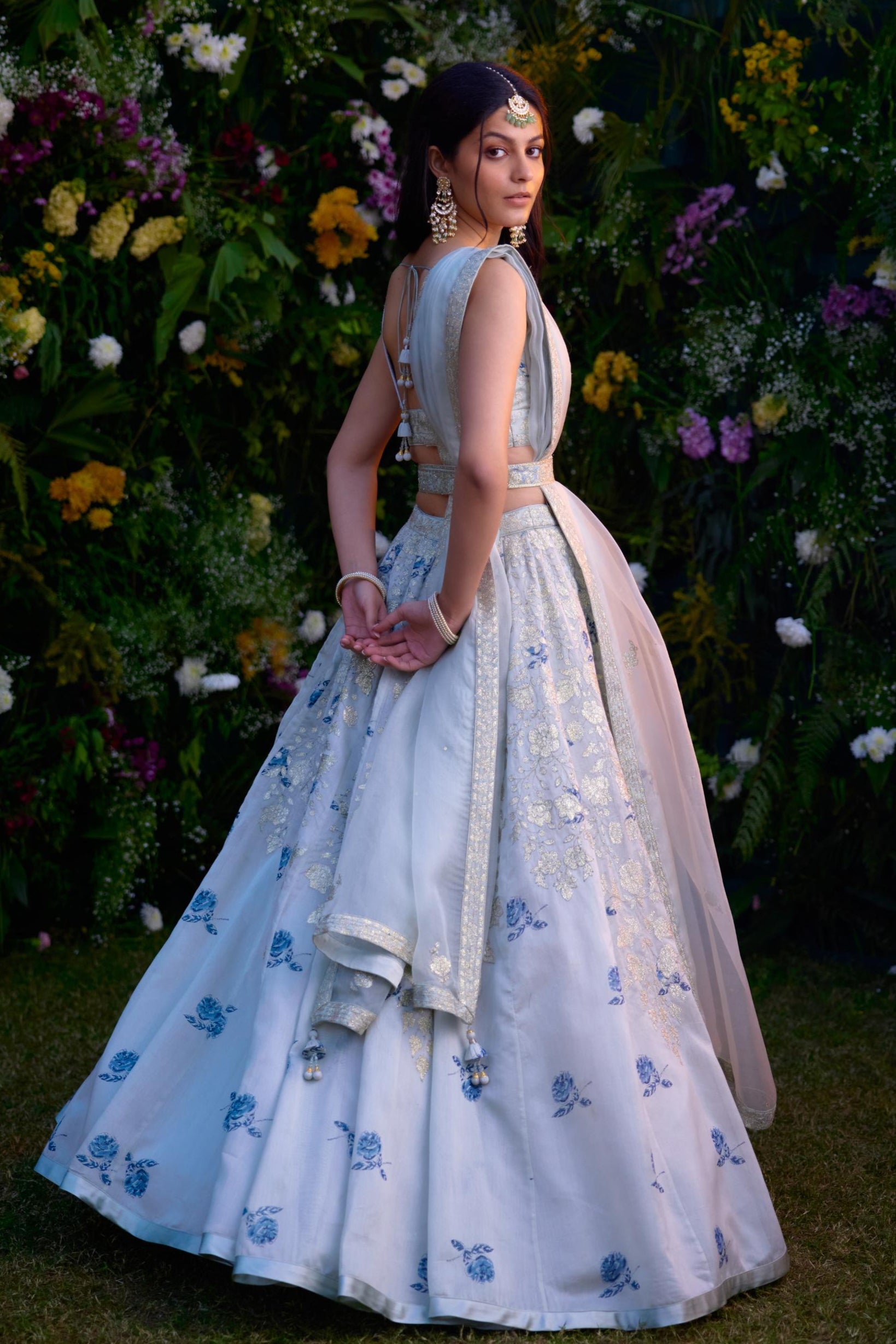 This illusion blue silk chanderi lehenga set is an ode to traditional hand block printing. The meticulous patterns add heritage charm, while the silk chanderi base makes the lehenga set luxurious yet breathable. Perfect for weddings, mehendi, and festive evenings, this lehenga set captures elegance with comfort. The illusion blue shade ensures the lehenga set commands attention without overwhelming the wearer. The timeless design of this lehenga set makes it versatile for both intimate functions and grand celebrations. Style with oxidized jewelry for a boho twist or with traditional gold for a regal vibe. This lehenga set is a wardrobe essential.