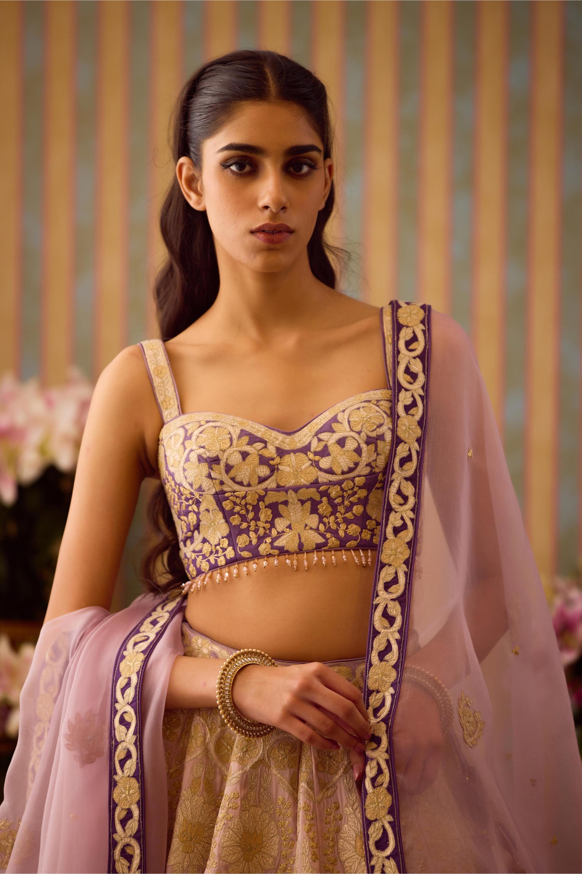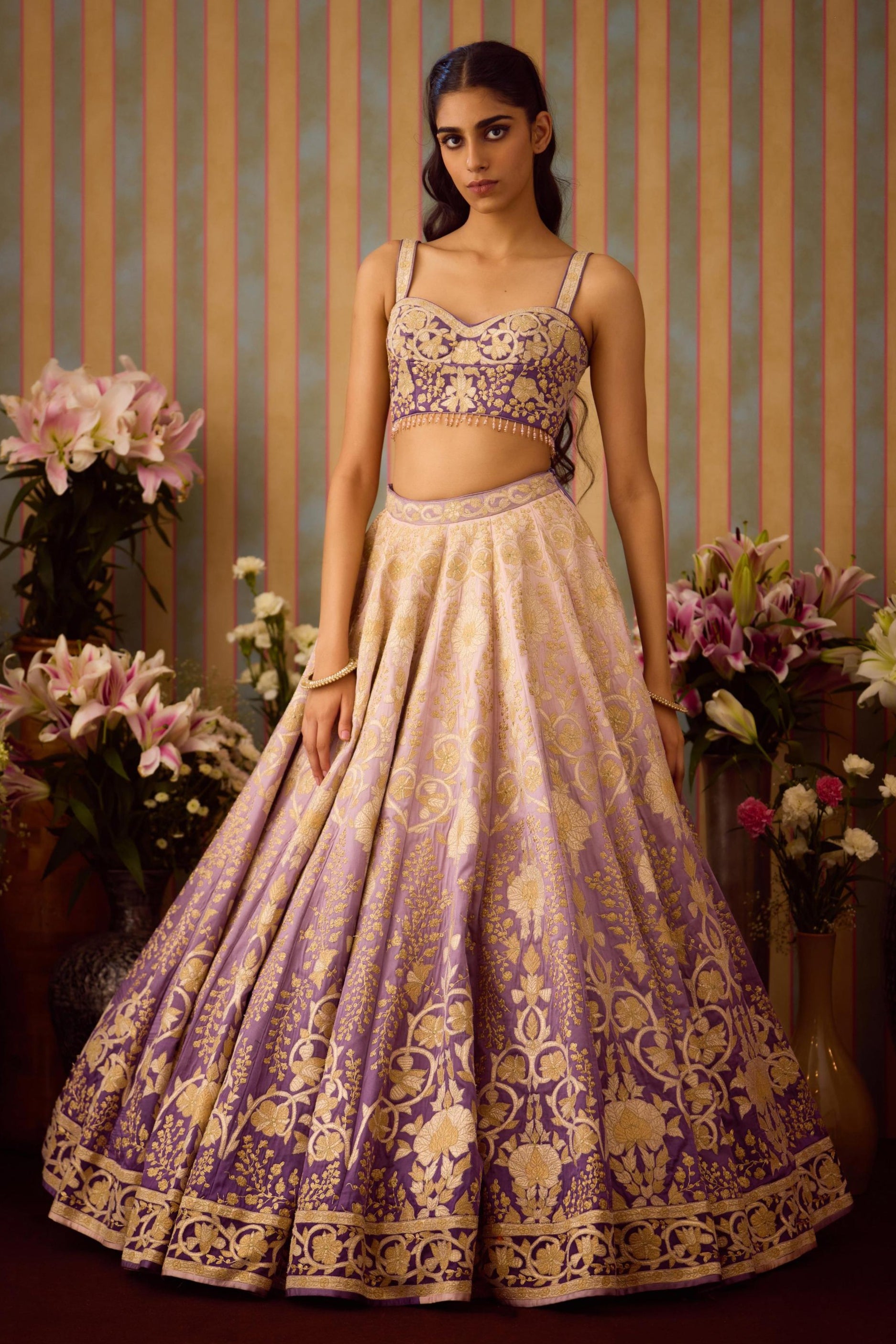 The Purple festive wedding lehenga set by Shyam Narayan Prasad is a celebration of pastel beauty and elegance. Created for Engagement and Roka occasions, this lehenga set merges romantic charm with traditional artistry. The lehenga skirt is beautifully flared, paired with a meticulously embroidered blouse and a coordinating dupatta. The pastel purple shade serves as a soft yet striking backdrop for the embroidery, ensuring that the detailing remains the highlight of the outfit. This lehenga set is both lightweight and comfortable, making it ideal for long functions where elegance must meet ease of movement. The color purple has gained popularity for its dreamy and modern appeal. This lehenga set caters to women who prefer sophisticated palettes that stand apart from traditional reds and yellows. Perfectly suited for Engagements and Rokas, it reflects romance, charm, and sophistication. Styling the lehenga set can be versatile—pair with pastel gemstone jewelry for a modern look or gold accessories for a classic touch. Its flattering design ensures that it photographs beautifully, leaving lasting impressions in event albums. Shyam Narayan Prasad’s attention to detail and craftsmanship elevates this lehenga set beyond just attire—it becomes an expression of grace. For women who seek modernity without losing cultural elegance, this outfit is an ideal choice for pre-wedding milestones.