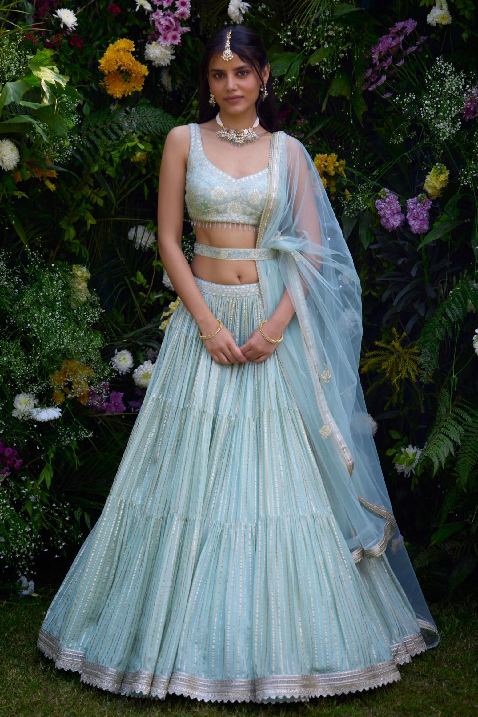 Embrace subtle elegance with this morning mist blue lehenga set featuring delicate lurex embroidery. The soft blue shade brings serenity and charm, making it perfect for weddings, sangeet, or festive daytime events. The lurex detailing adds a hint of sparkle, balancing sophistication with celebratory style. Ideal for bridesmaids or wedding guests, this lehenga set ensures graceful, effortless beauty while reflecting contemporary Indian craftsmanship.