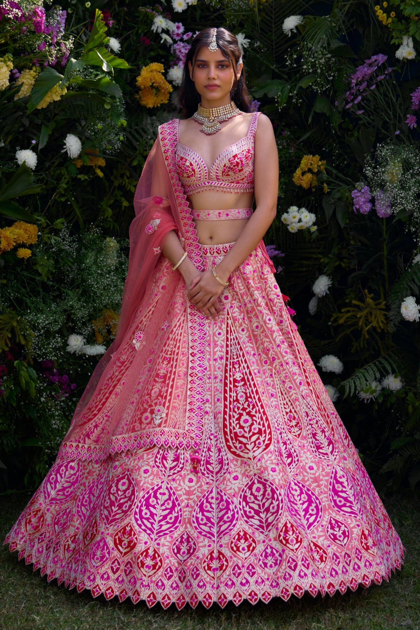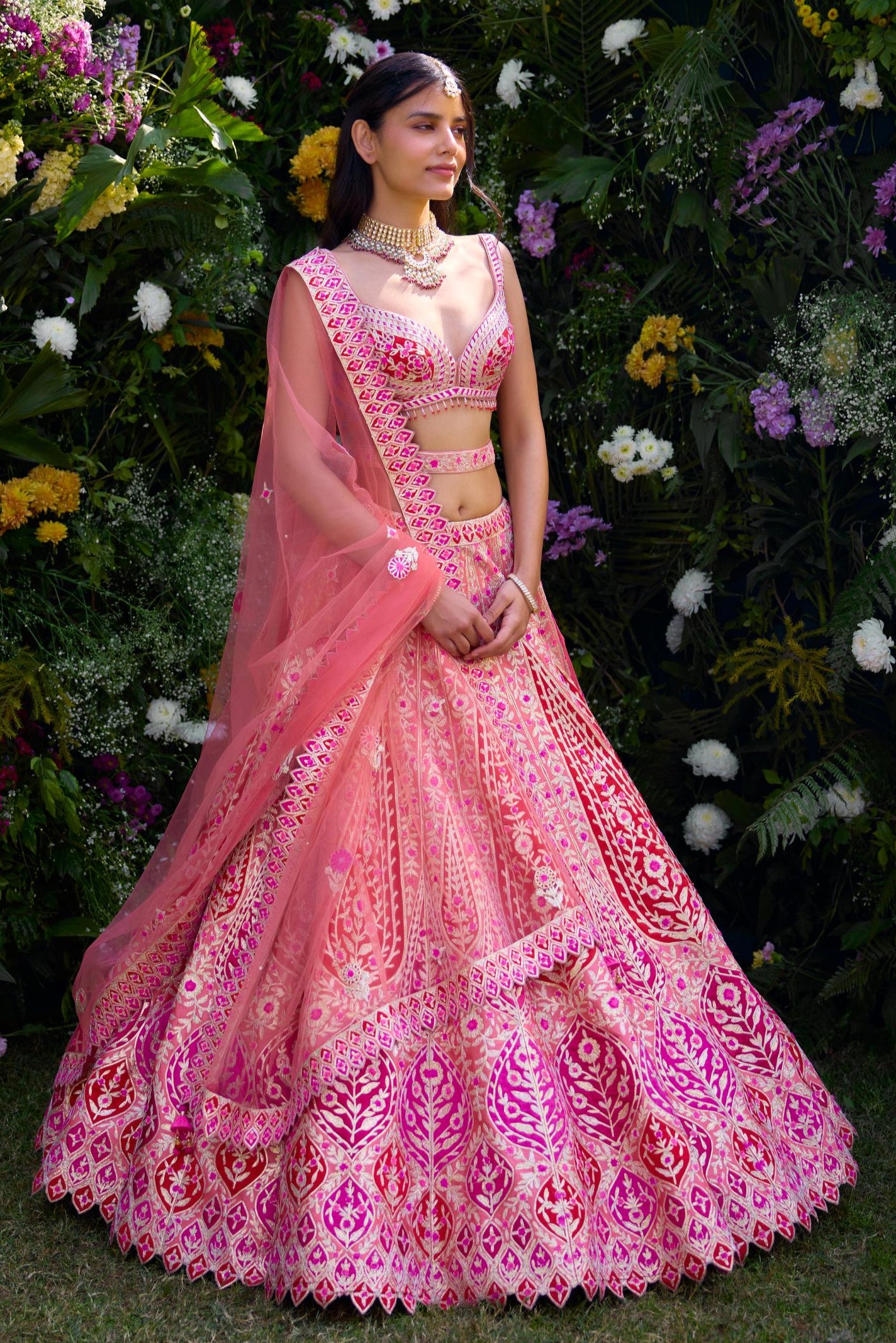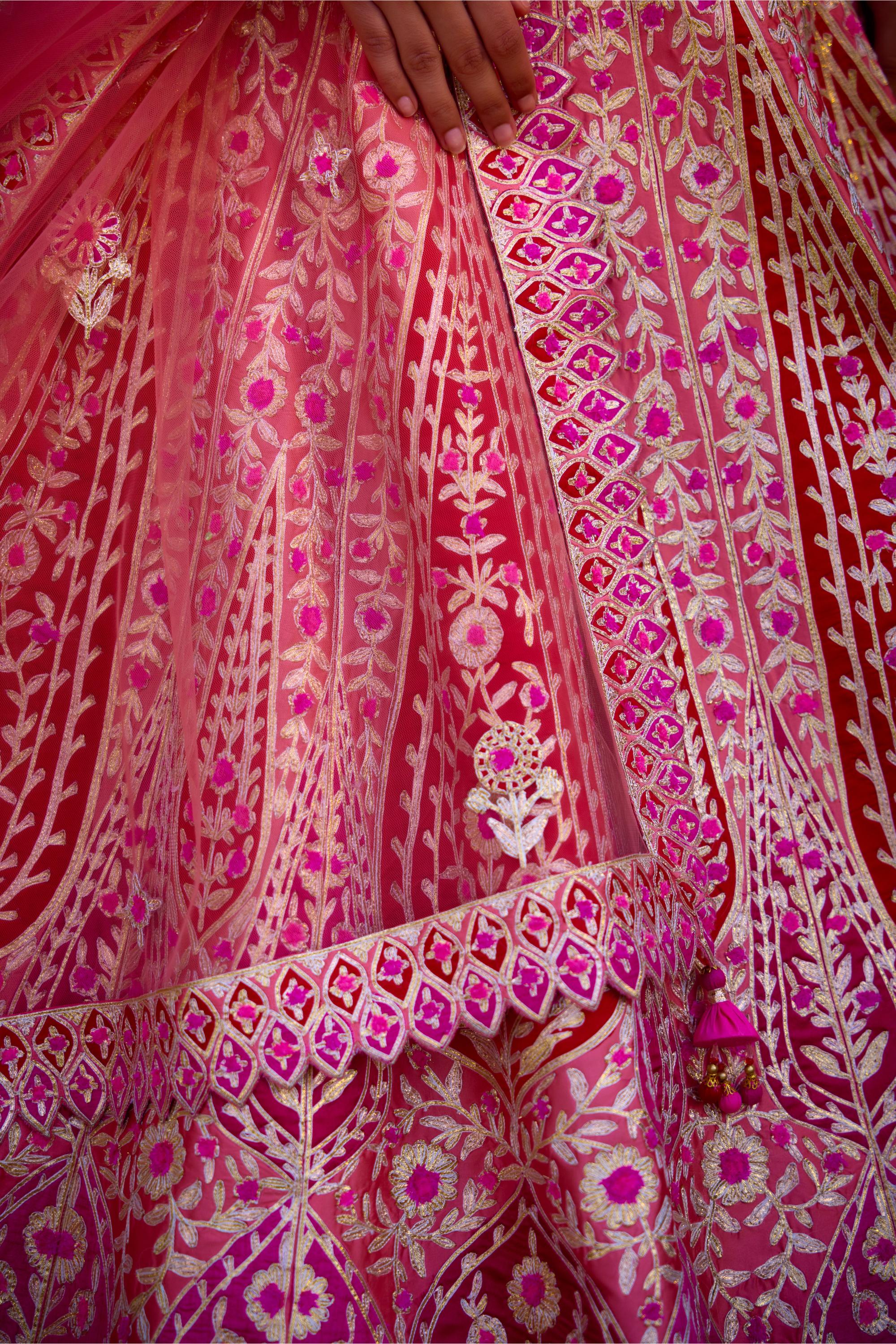 Radiate elegance with this peach pink and ribbon red lehenga set, beautifully enhanced with applique detailing. The vibrant combination of colors creates a lively and festive look, making this ensemble perfect for weddings, sangeet, or haldi ceremonies. The applique work lends artistic intricacy, elevating the overall charm of the lehenga set. Crafted for modern women who appreciate a mix of tradition and style, this design is perfect for making a graceful yet powerful impression.