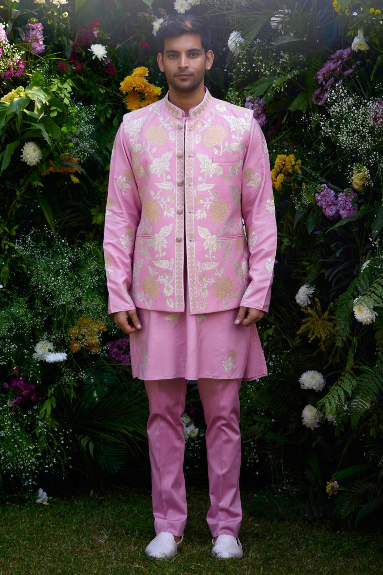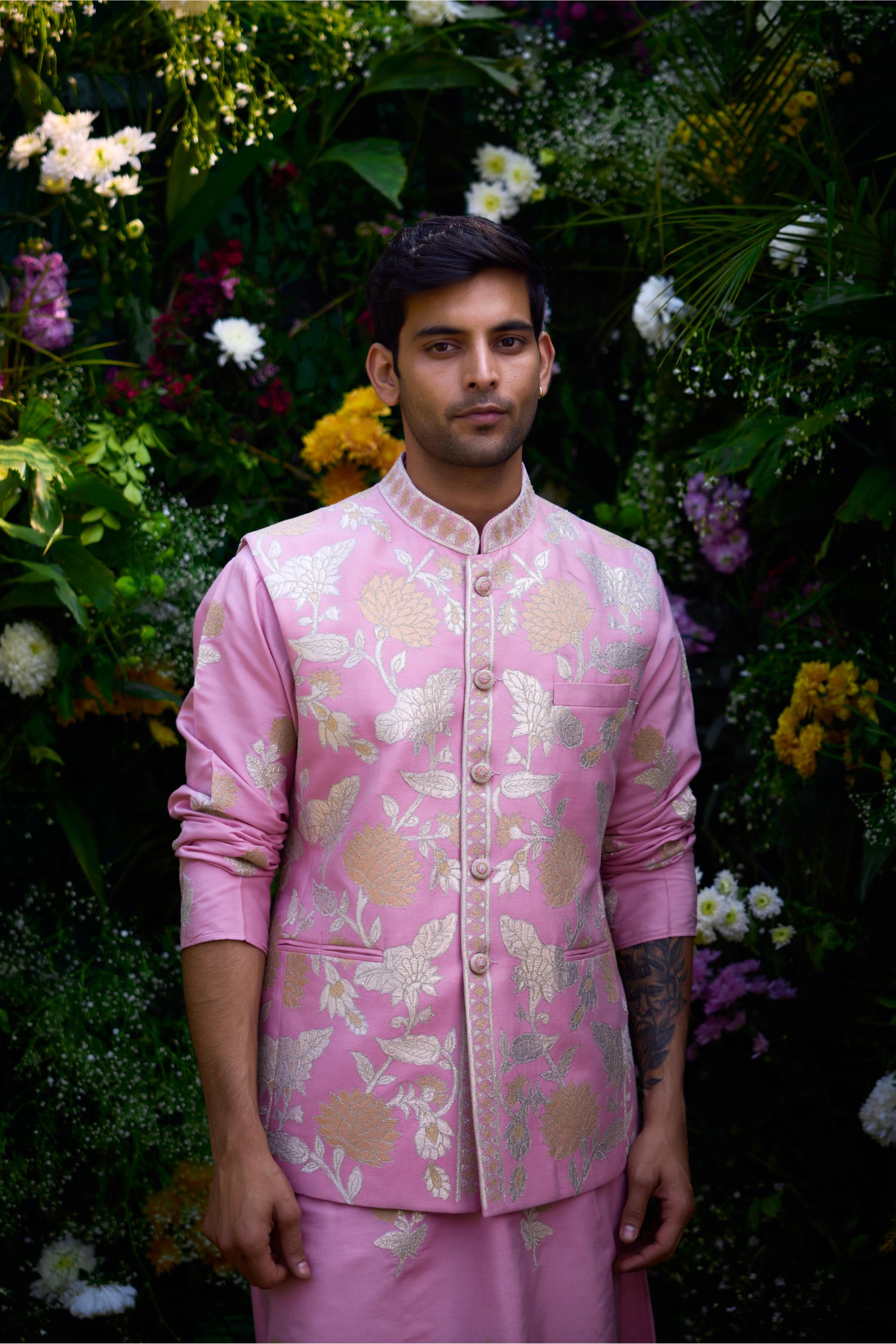 Pink summer wedding kurta set with waistcoat