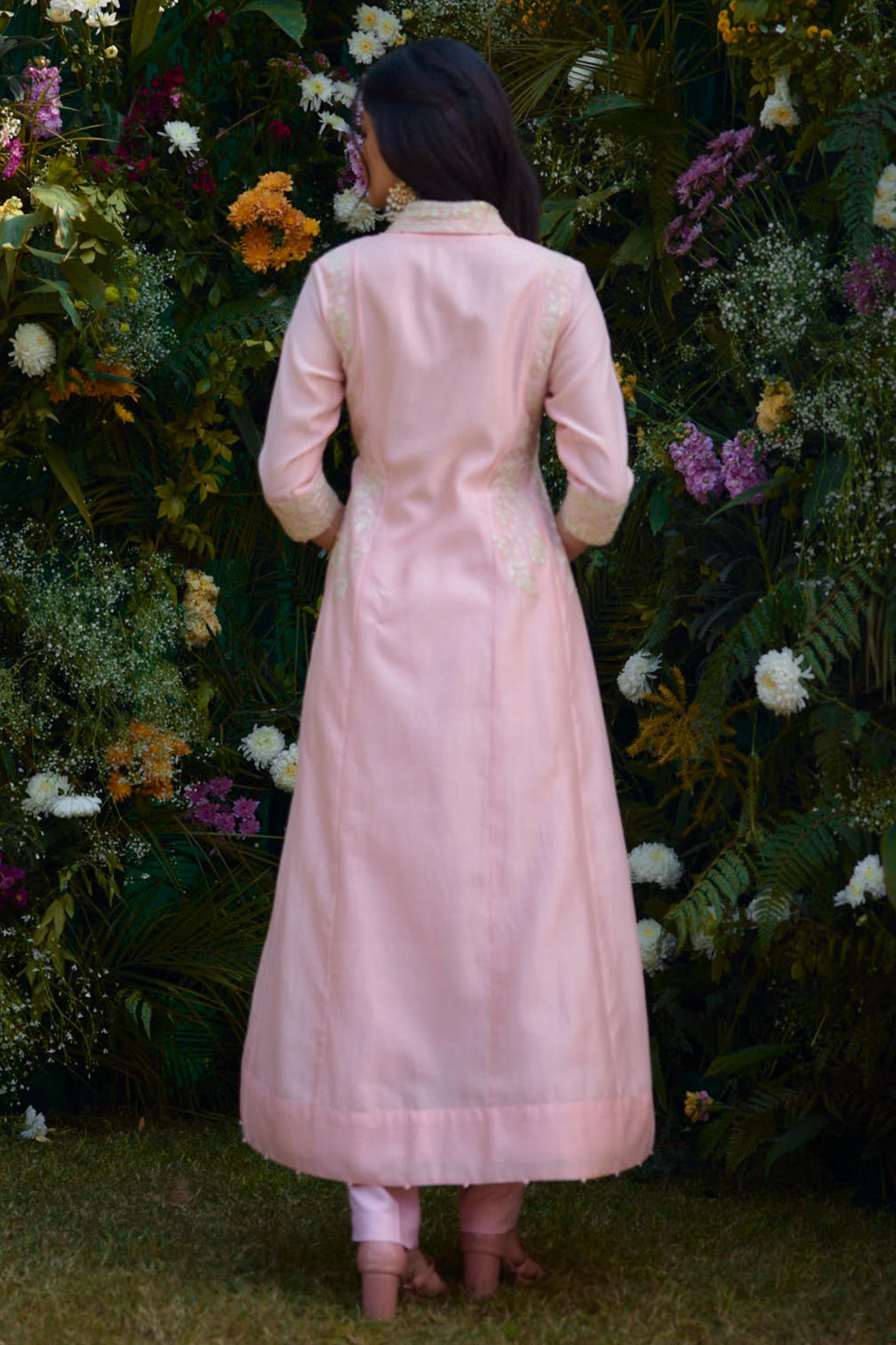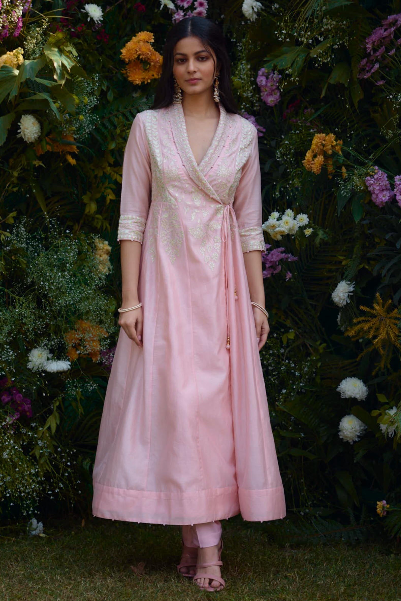 Infuse subtle charm into your wardrobe with this powder pink silk chanderi angrakha set featuring tailored trousers. The soft pastel tone makes it ideal for daytime gatherings, while the angrakha silhouette offers a refined ethnic touch. Designed for those who appreciate modern comfort in traditional wear, this angrakha set is perfect for brunch events, cultural celebrations, or festive family gatherings. The harmonious combination of trousers and kurta creates effortless sophistication, making it a versatile choice for contemporary women.