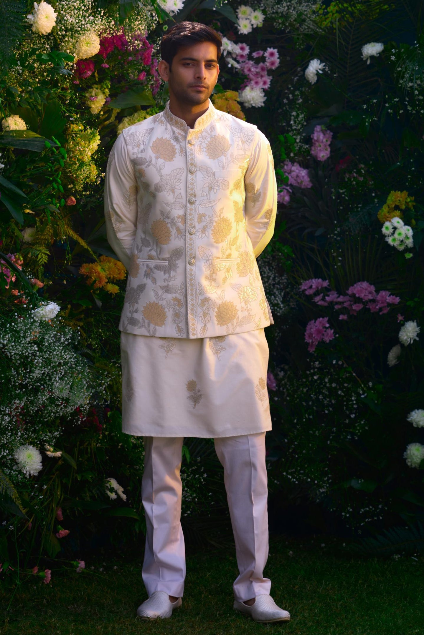 This Pristine White Embroidered kurta set by Shyam Narayan Prasad is a luxurious choice for weddings and festive celebrations. The waistcoat features gold and silver lurex patchwork and thread embroidery, paired with a pristine kurta for elegance and comfort. Ideal for groomsmen or wedding guests, this kurta set embodies sophistication with cultural richness. Lightweight cotton silk ensures easy wear throughout long ceremonies. Perfect for day or evening events, this ensemble highlights artisanal craftsmanship while delivering a polished and festive appearance.