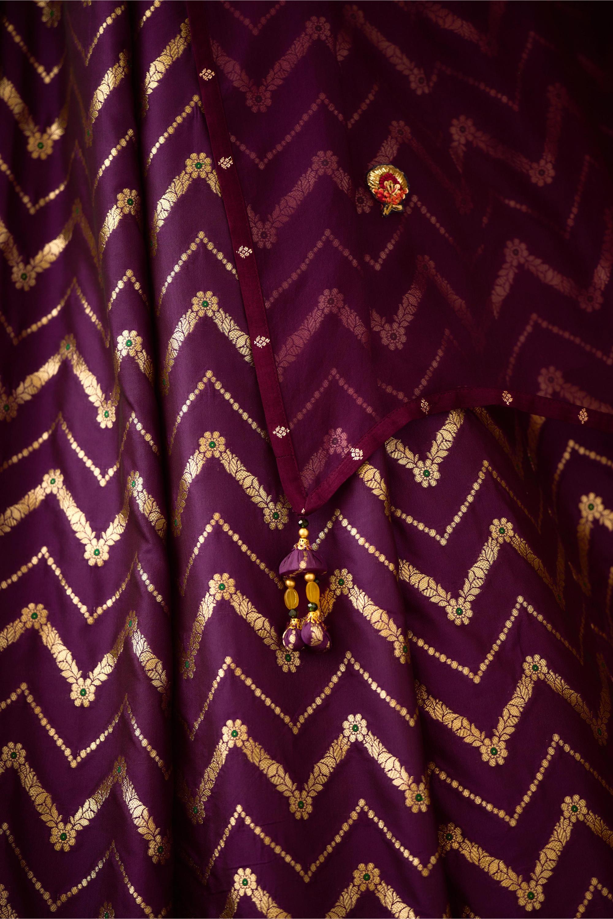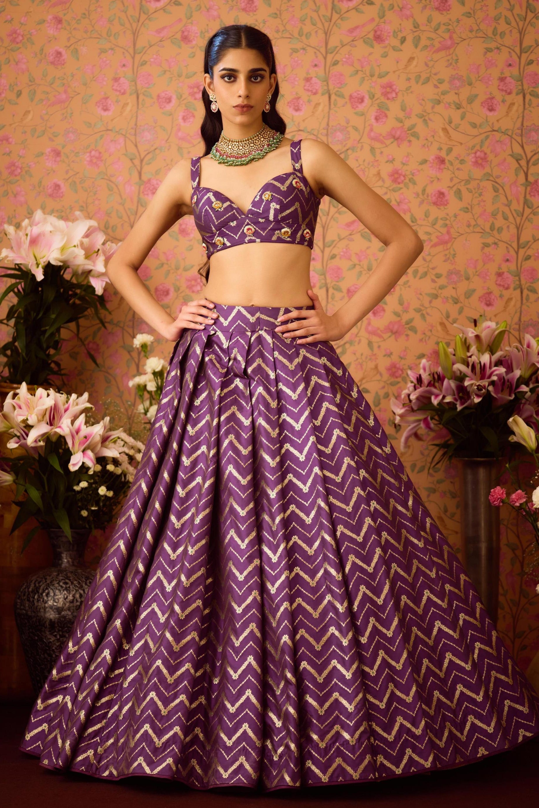 The purple festive wedding lehenga set by Shyam Narayan Prasad is a stunning choice for Engagement and Roka ceremonies, designed to reflect grandeur and elegance. The rich purple hue conveys royalty and sophistication, while the intricately embroidered detailing elevates the ensemble to a piece of couture. This lehenga set includes a voluminous skirt, a beautifully designed blouse, and a coordinating dupatta, offering a complete look that is both regal and balanced. The lightweight construction ensures comfort, making it ideal for long celebrations. The detailing on the lehenga set highlights Shyam Narayan Prasad’s dedication to craftsmanship, blending heritage motifs with contemporary aesthetics. Perfect for brides-to-be or guests attending milestone celebrations, this lehenga set offers versatility in styling. It can be paired with statement necklaces and earrings for a traditional look or styled with sleek, modern jewelry for a chic approach. The design ensures that the wearer feels elegant and confident throughout the occasion. What sets this lehenga set apart is its timeless appeal. While firmly rooted in tradition, the ensemble carries a modern refinement that makes it relevant across seasons and occasions. It is a true investment in festive couture, symbolizing elegance and artistry. For Engagement and Roka ceremonies, this lehenga set captures the joy and significance of the moment, making the wearer the center of attention with effortless grace.