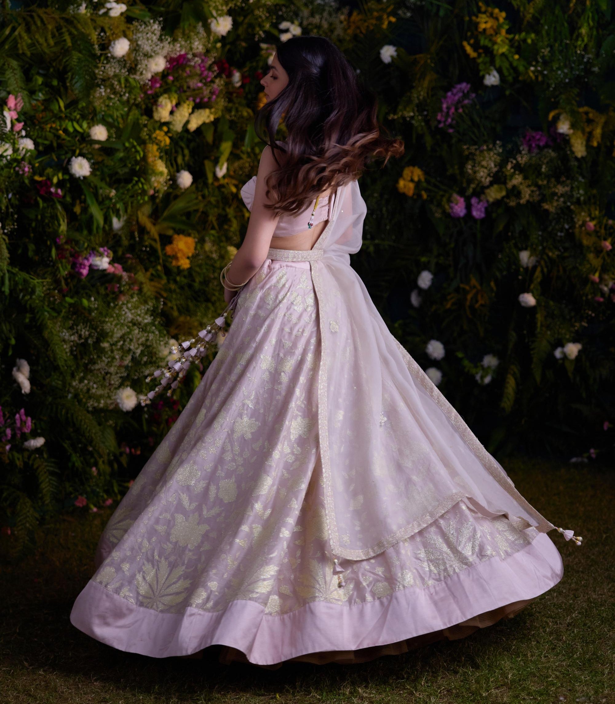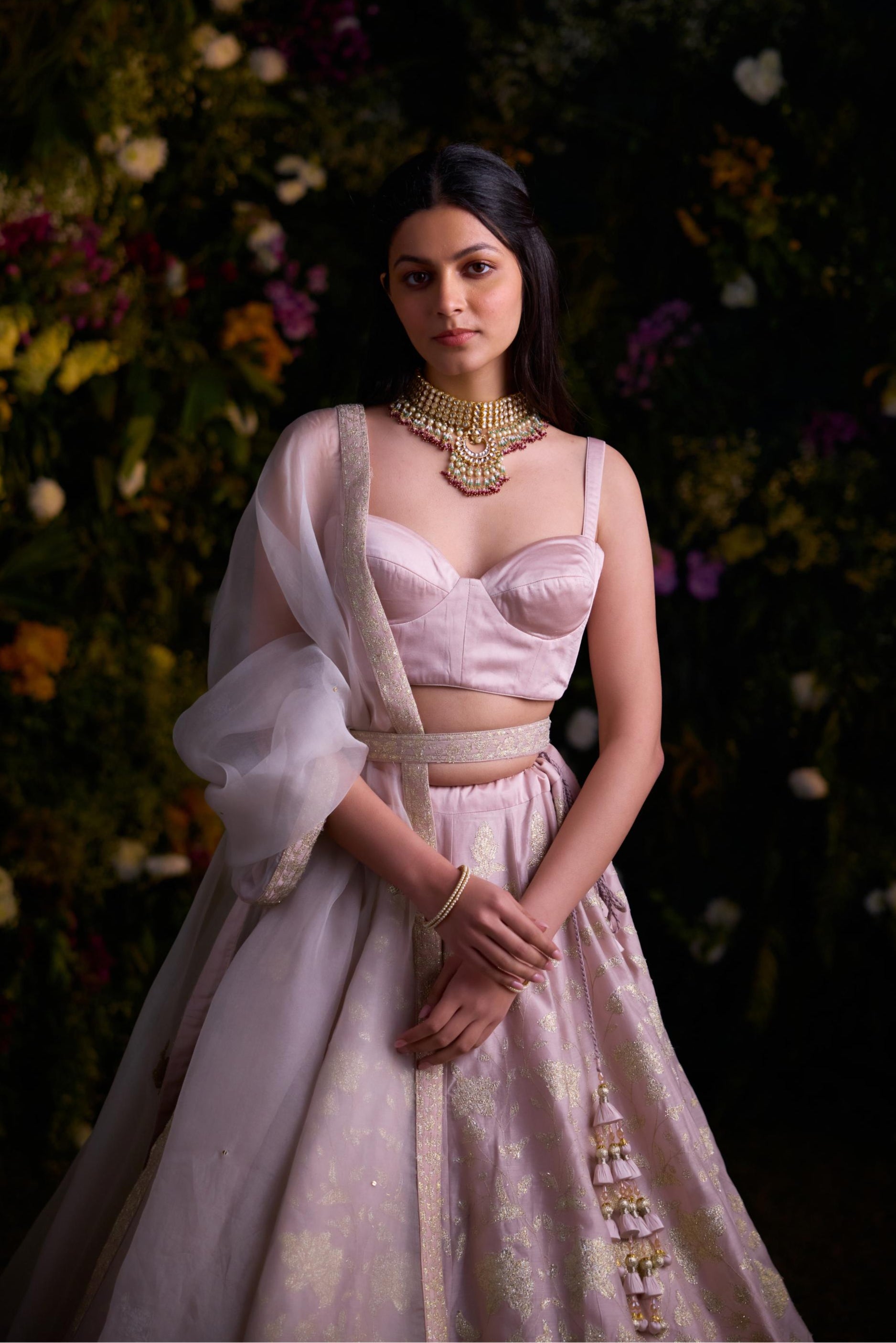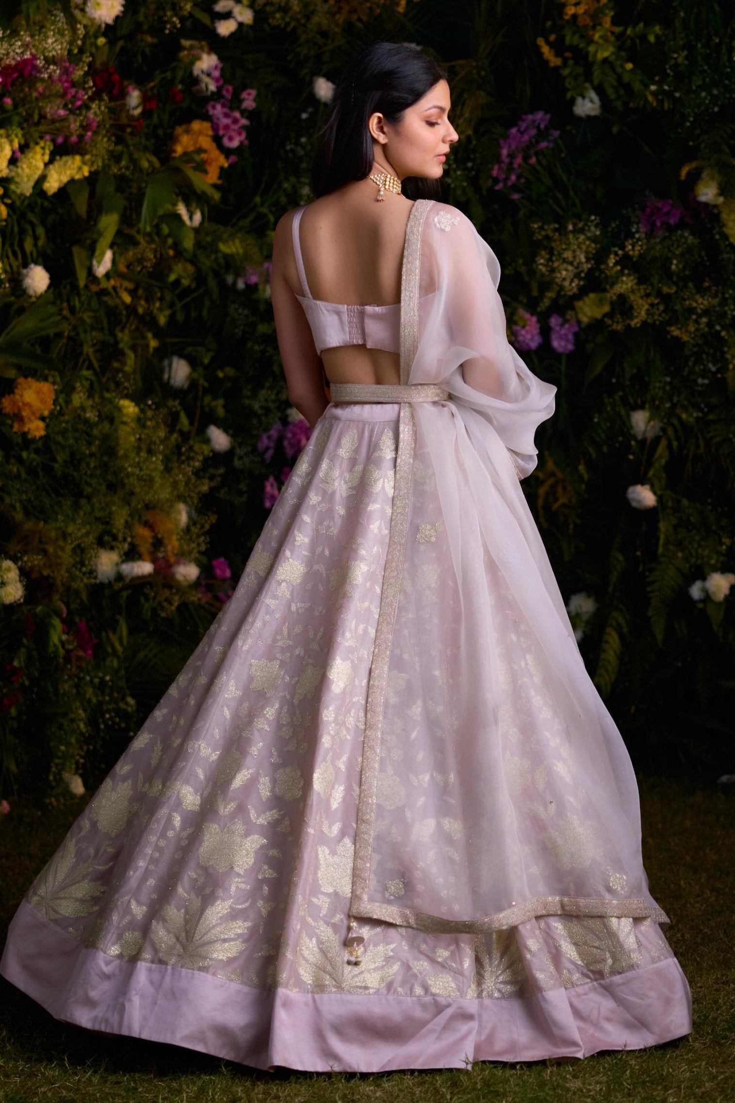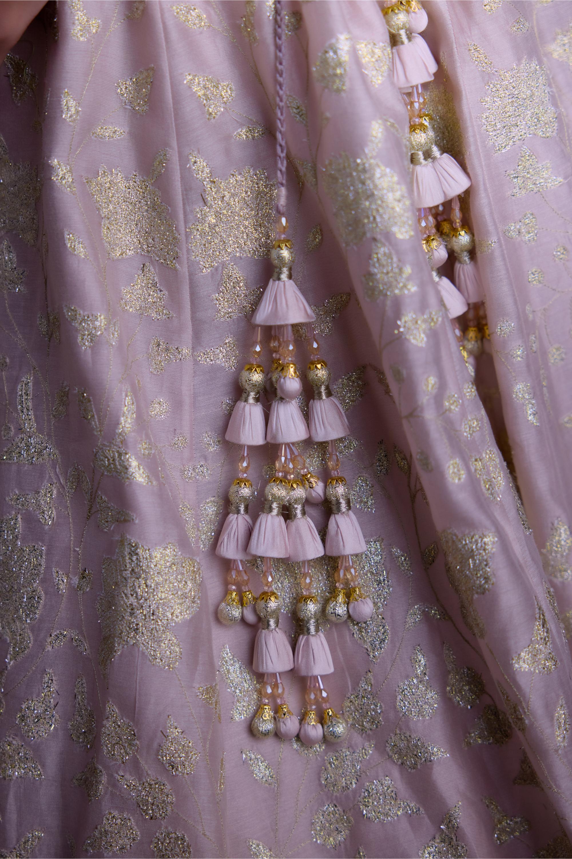 This silver grey lehenga set embodies minimal elegance with intricate lurex patchwork. The sophisticated silver shade ensures that the lehenga set is perfect for receptions and evening ceremonies. The dupatta completes the ensemble with a graceful touch, while the detailing gives the lehenga set a subtle shimmer under evening lights. Ideal for contemporary bridesmaids or wedding attendees, this lehenga set balances timeless tradition with modern appeal. Its versatility allows pairing with bold or minimalist jewelry, ensuring the lehenga set fits seamlessly into any occasion. Refined yet celebratory, this lehenga set is a wardrobe essential for grand festivities.