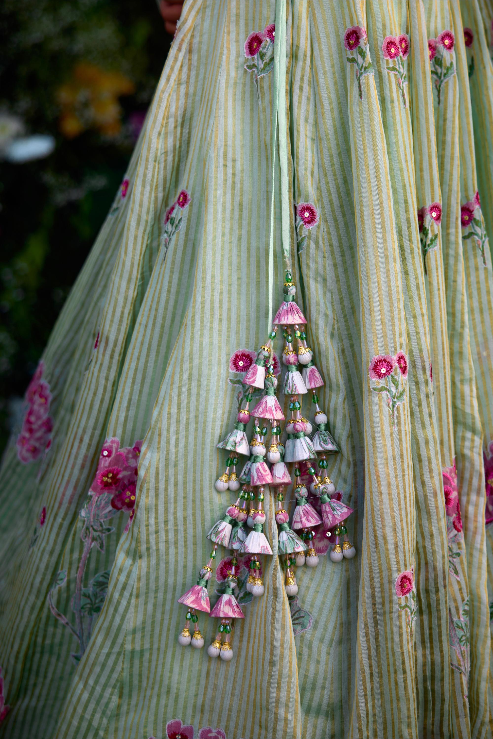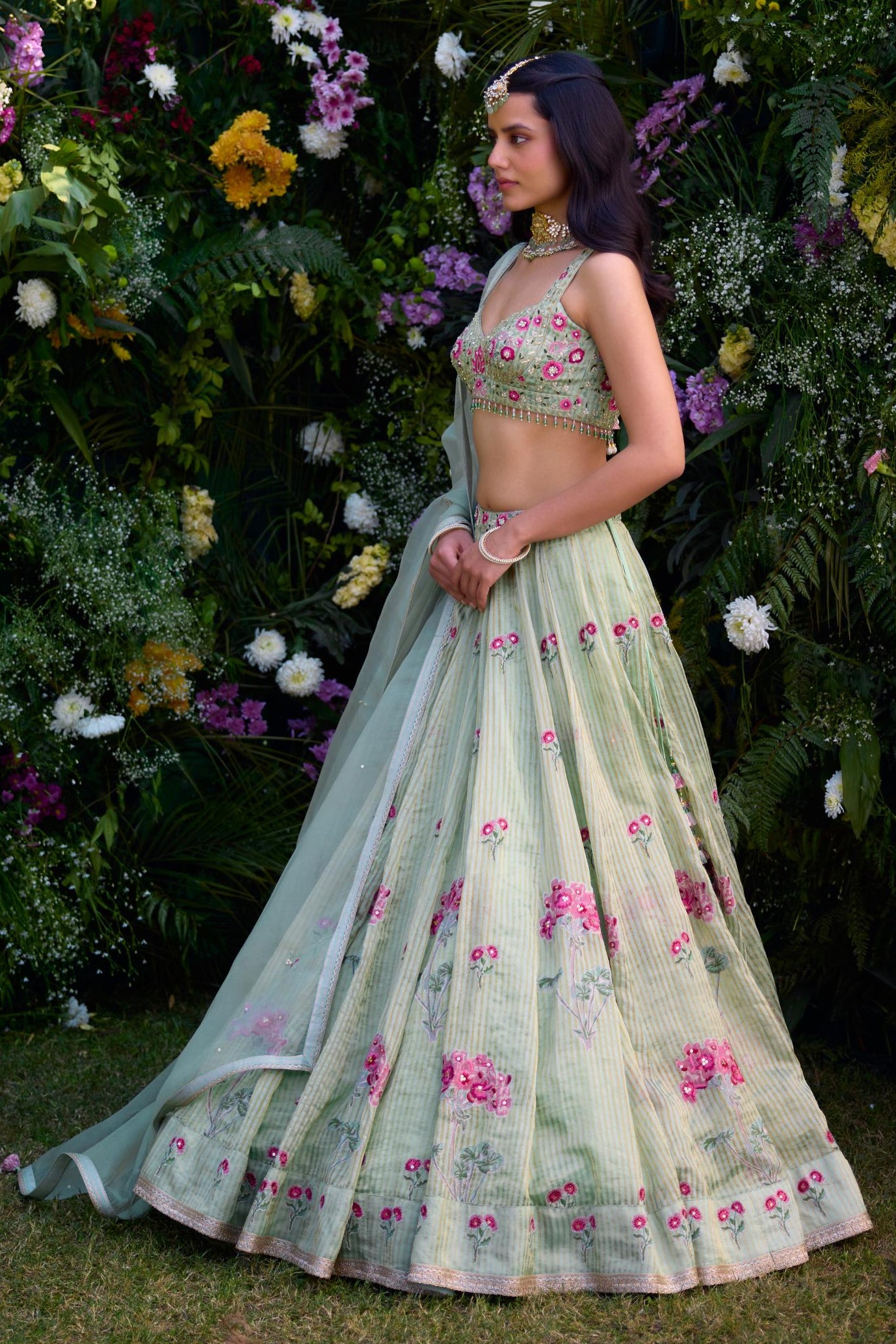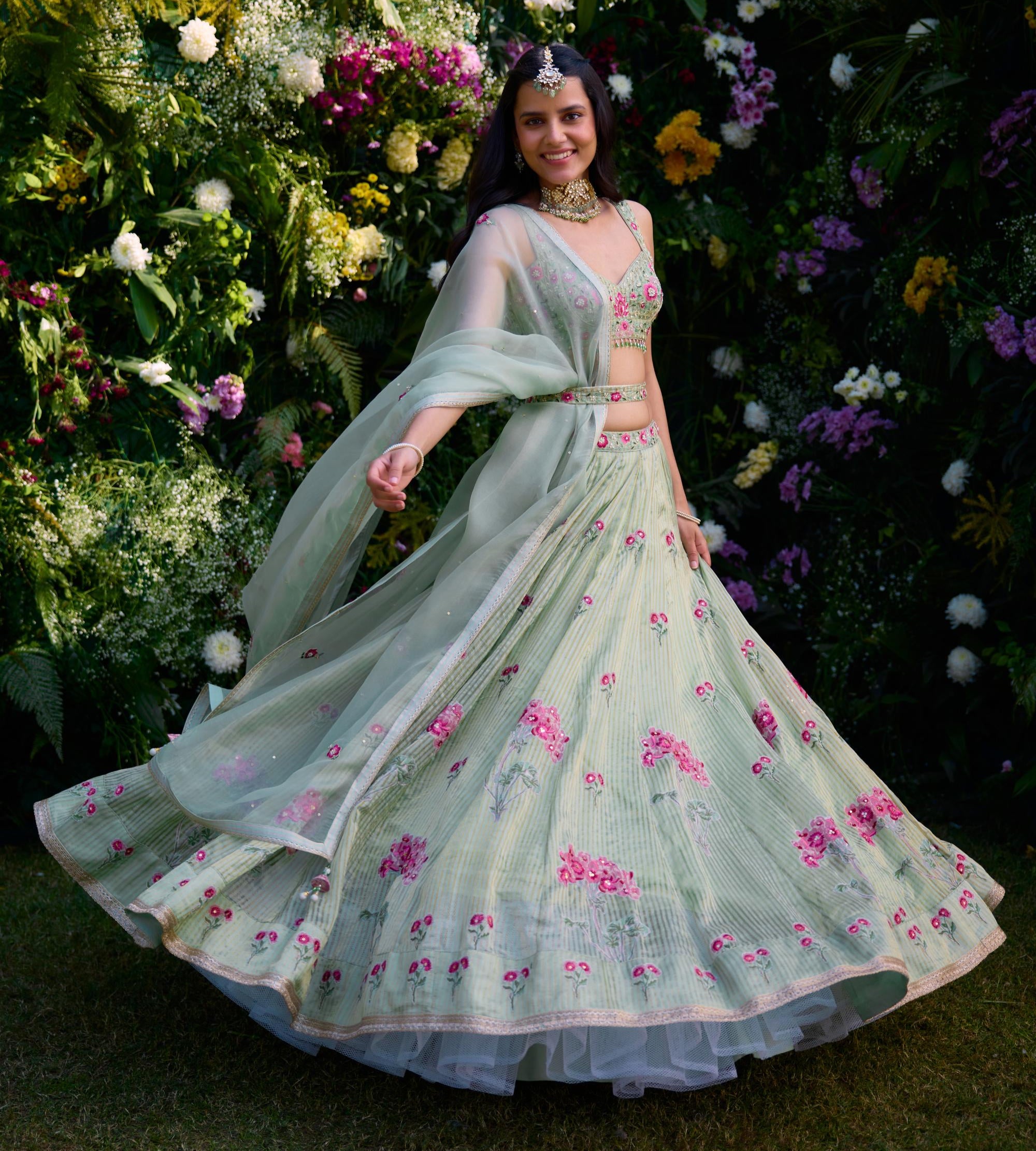 This smoke green lehenga set embodies the charm of traditional Indian artistry. The block print adds unique texture and pattern, while the zardozi work brings elegance and festive flair to the lehenga set. Ideal for weddings, sangeet, and receptions, this lehenga set ensures comfort without compromising on grandeur. The muted smoke green color allows easy styling with various jewelry options, making the lehenga set versatile for multiple occasions. Designed for women who appreciate craftsmanship and contemporary style, this lehenga set is a sophisticated choice for modern festive wardrobes.