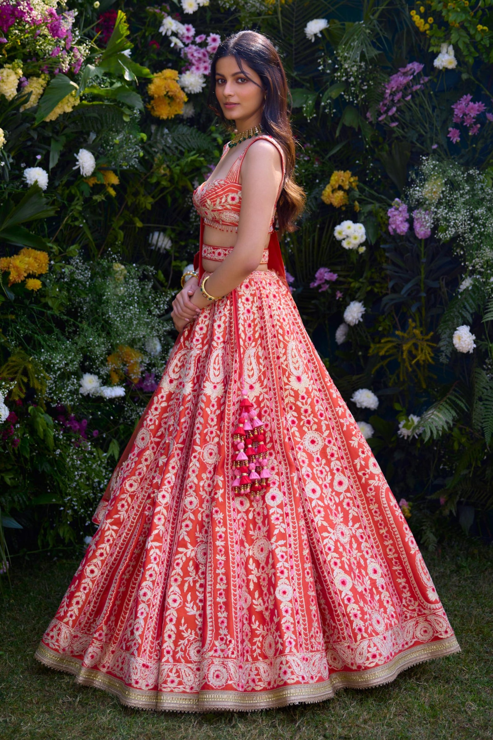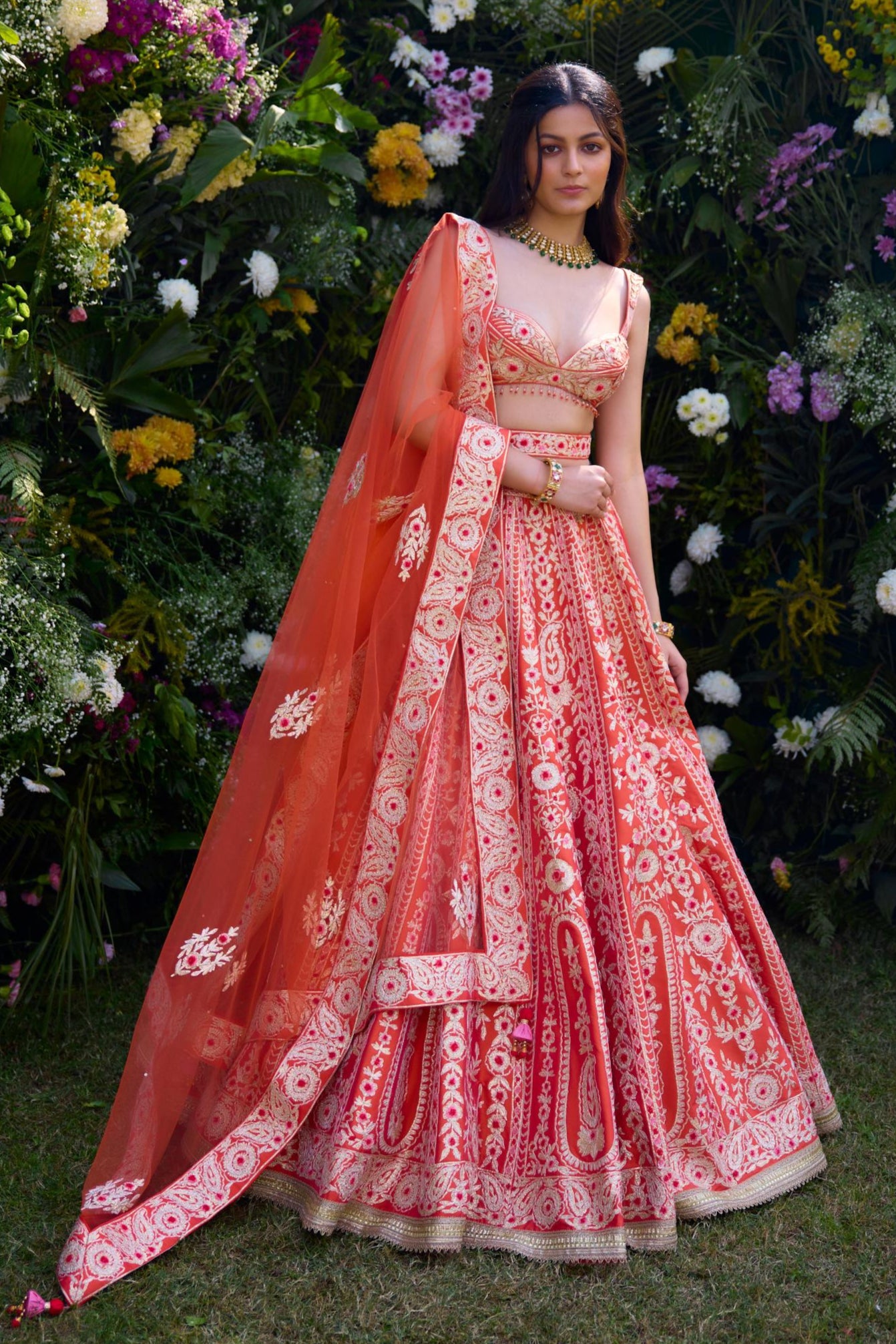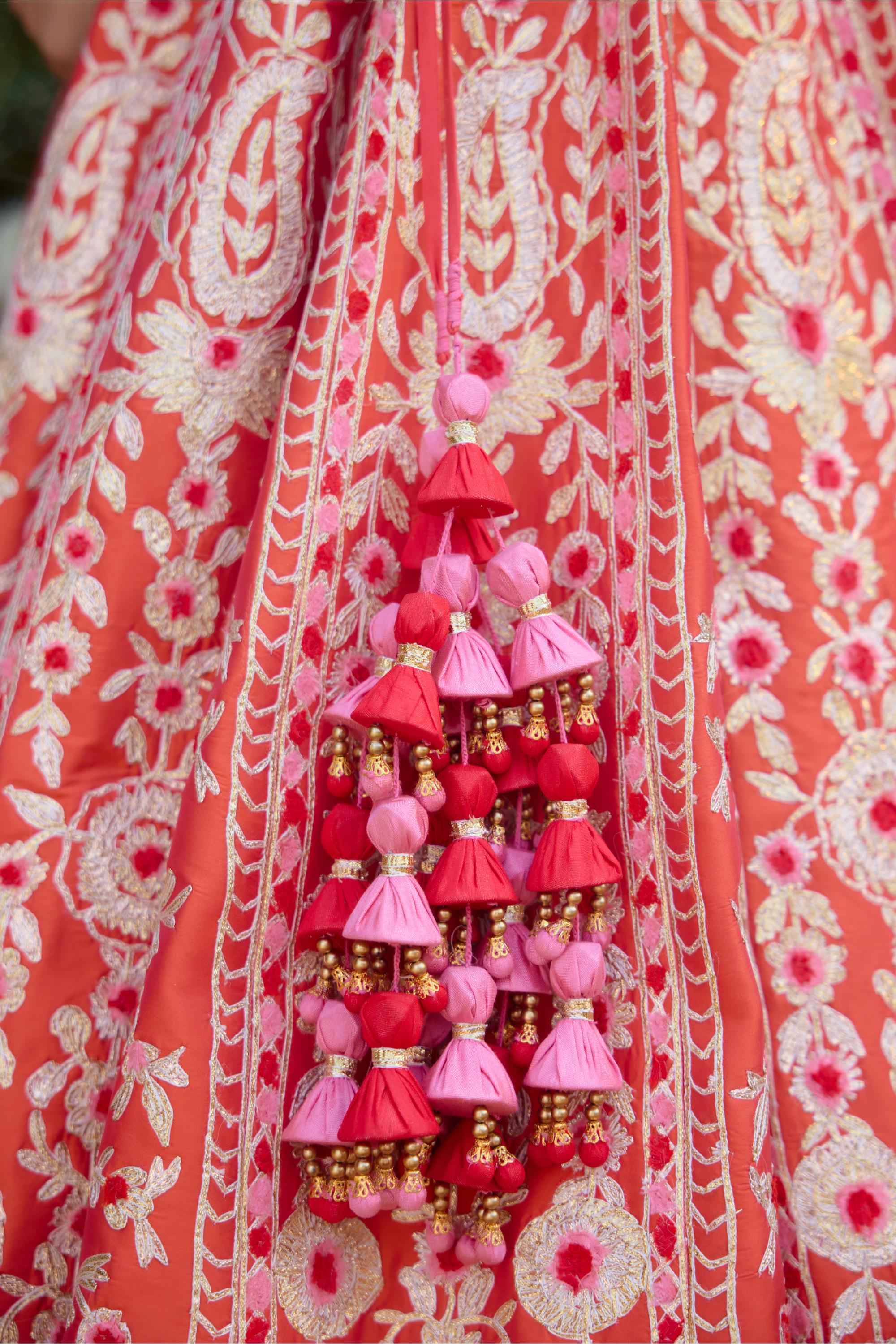 This vermillion orange raw silk lehenga set captures the spirit of Indian festivities. The raw silk fabric lends richness, while the intricate gota embroidery makes this lehenga set a true showcase of traditional artistry. Designed for haldi, mehendi, and wedding ceremonies, the lehenga set ensures elegance while keeping you comfortable. The bold vermillion tone ensures that the lehenga set commands attention, while the embroidery highlights its timeless appeal. Pair this lehenga set with statement jewelry to complete the festive look. Whether for a bride or a close family member, this lehenga set is an unforgettable piece.